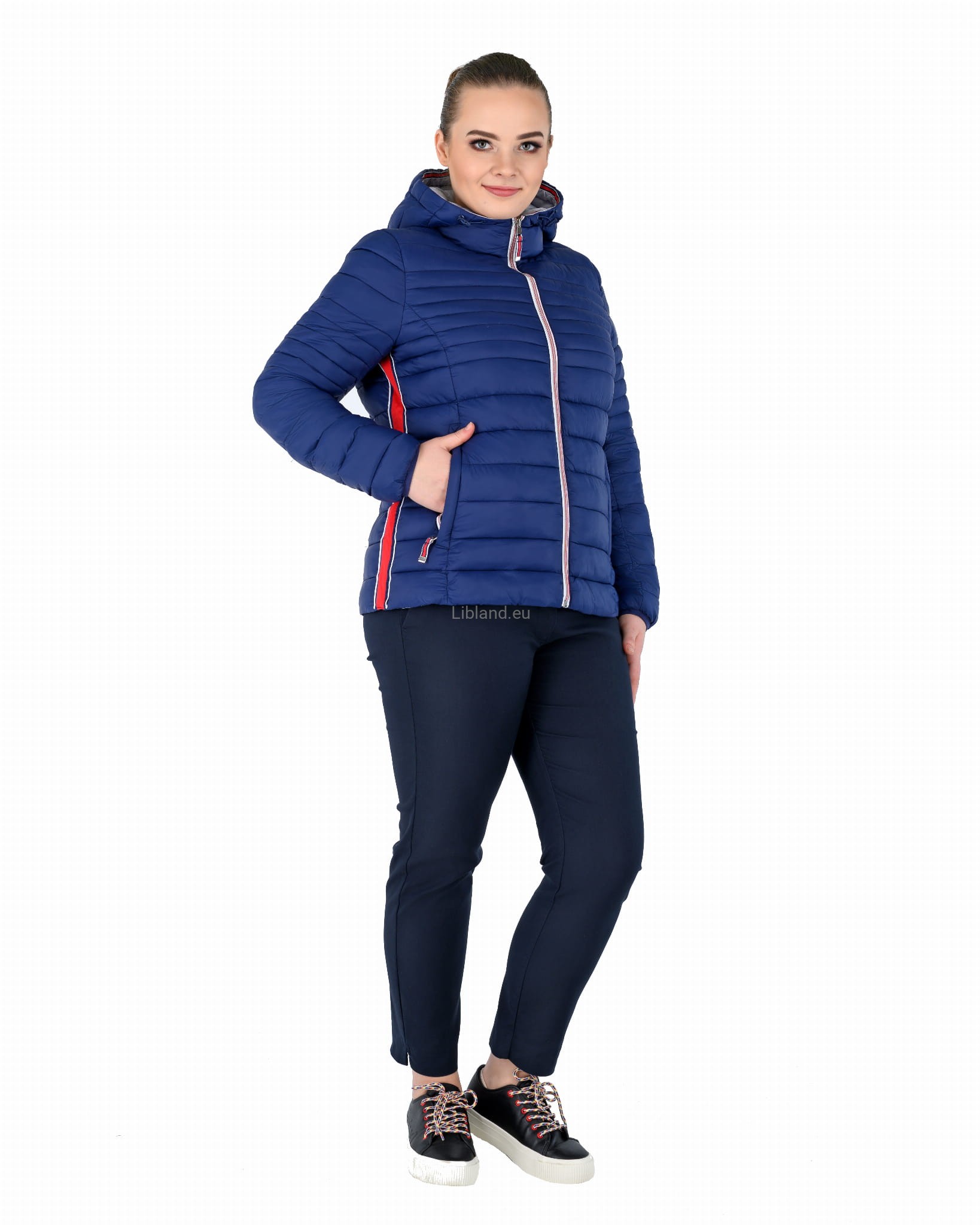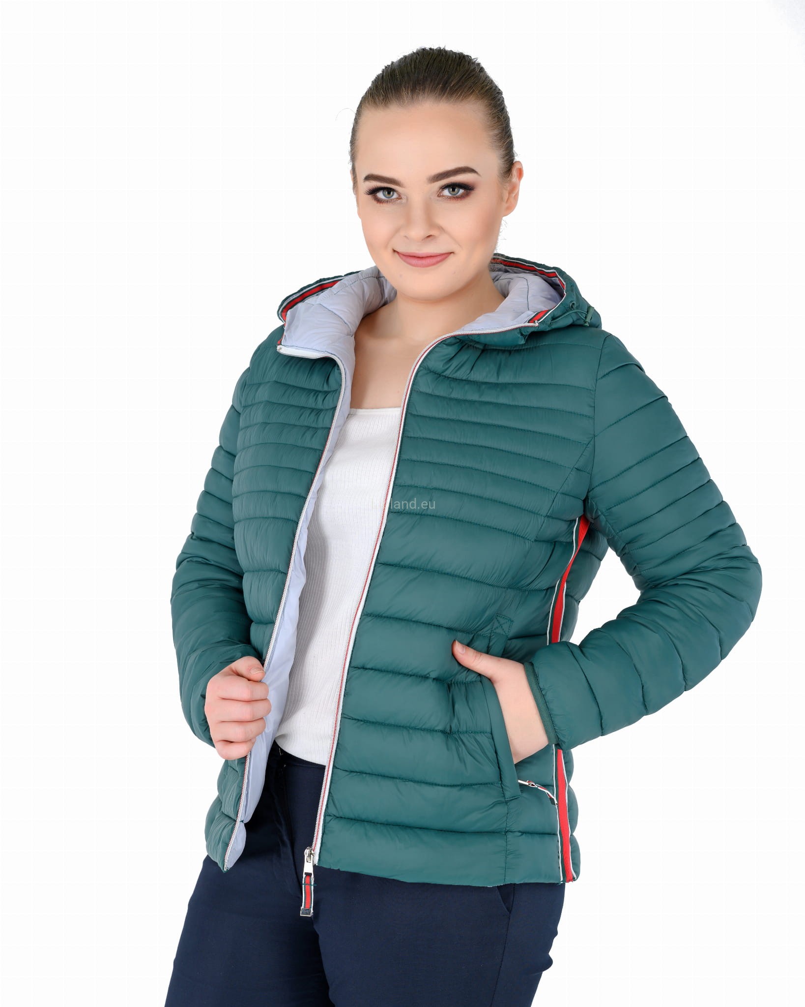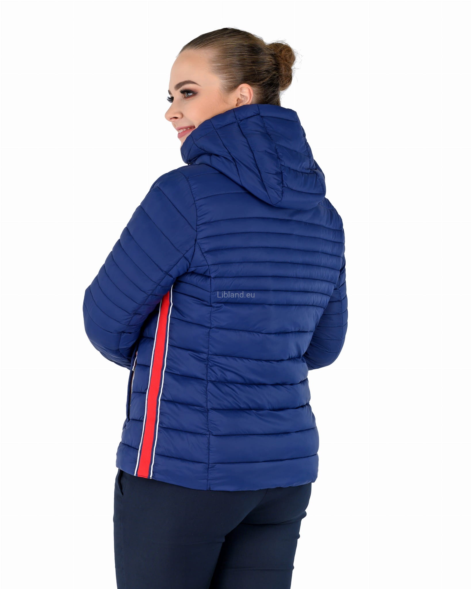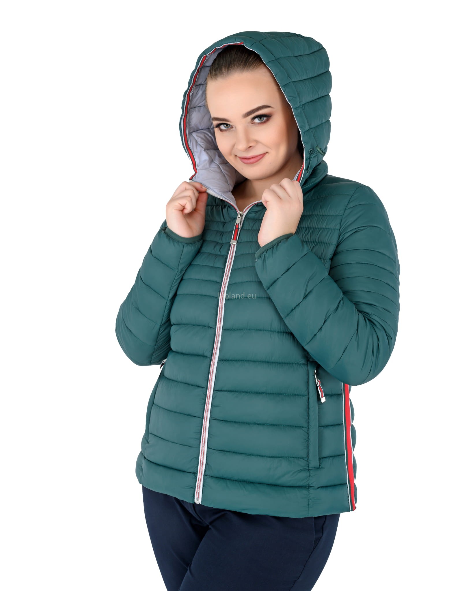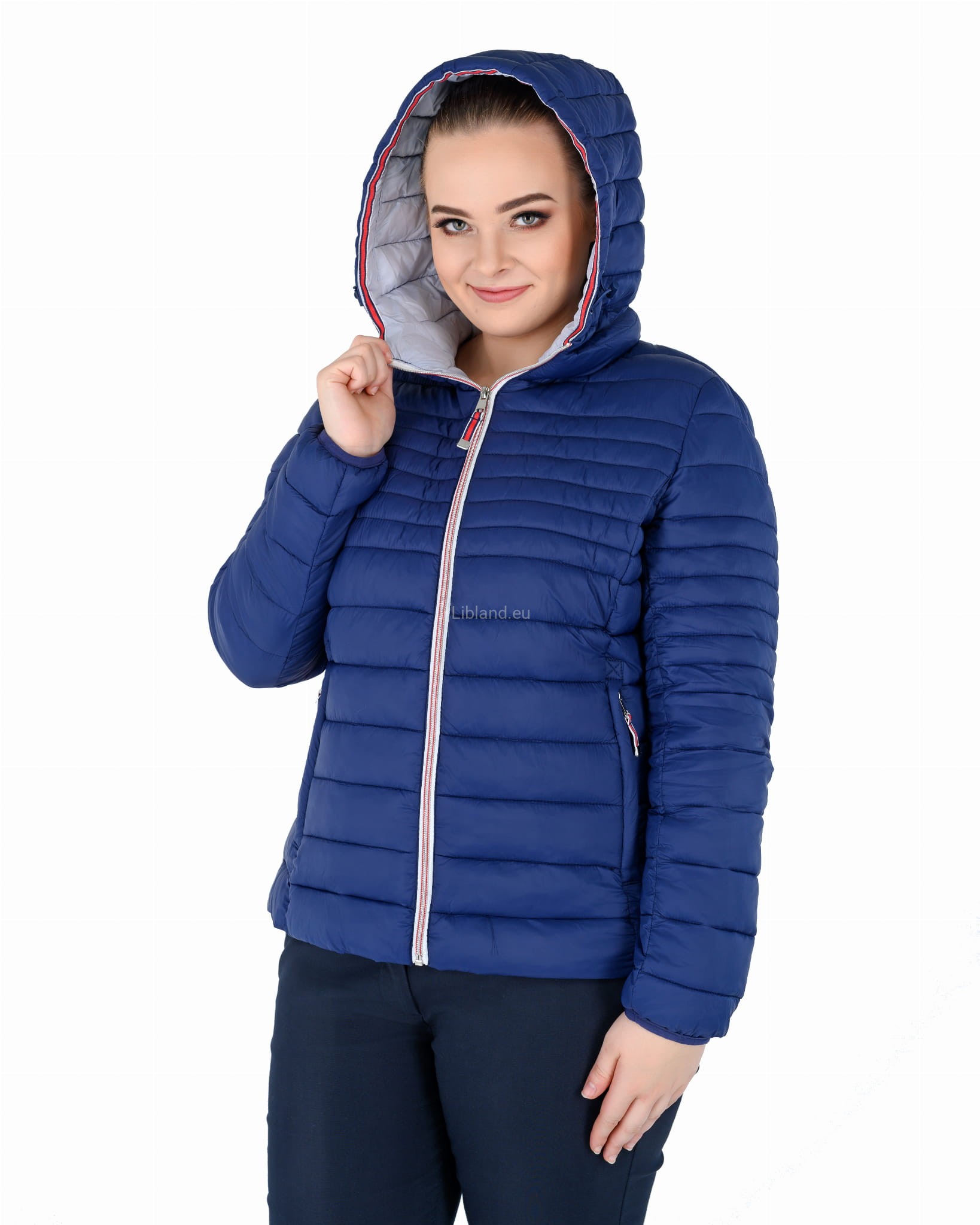Pikowana kurtka damska z kapturem ze wstawkami z pięknie kontrastującej czerwonej taśmy.