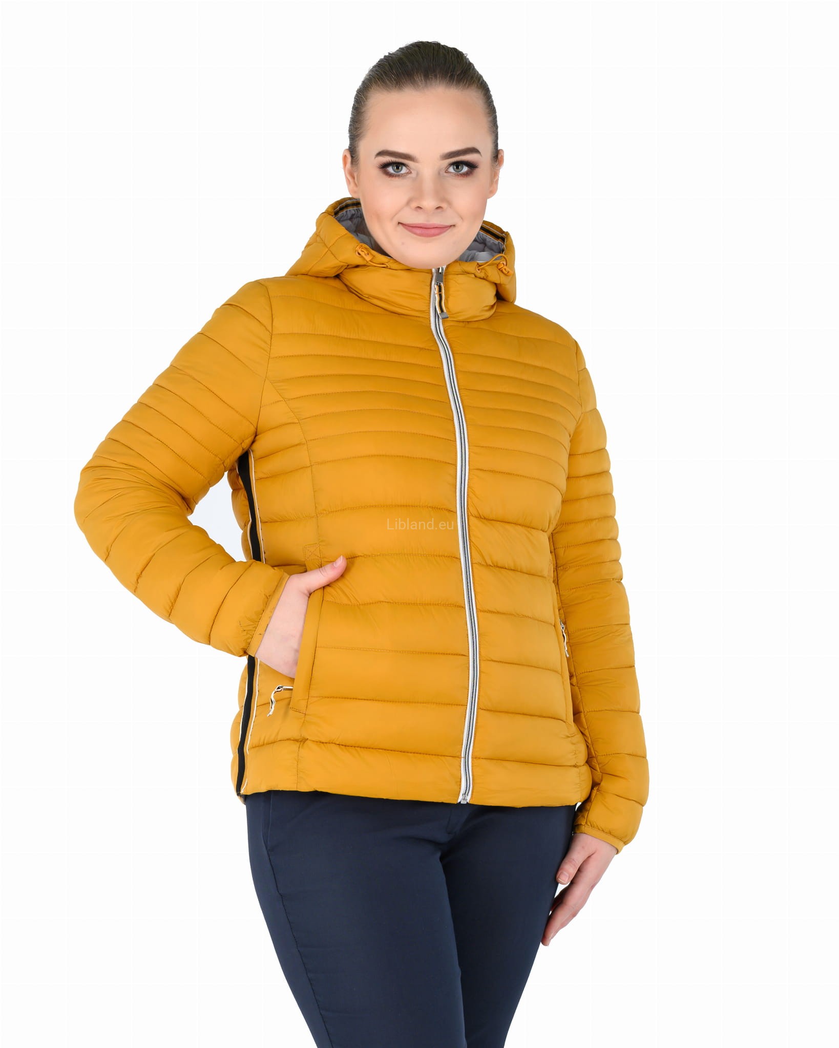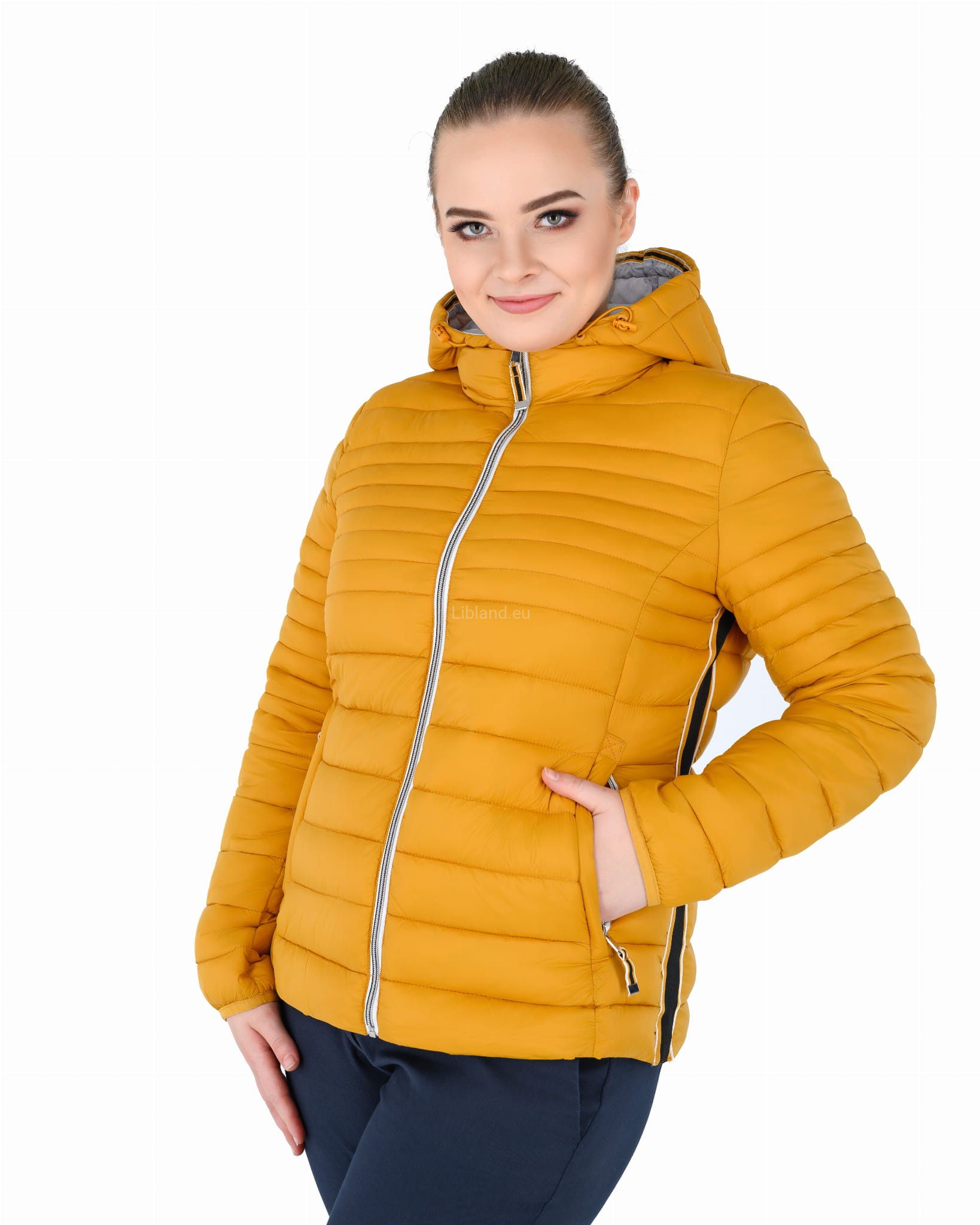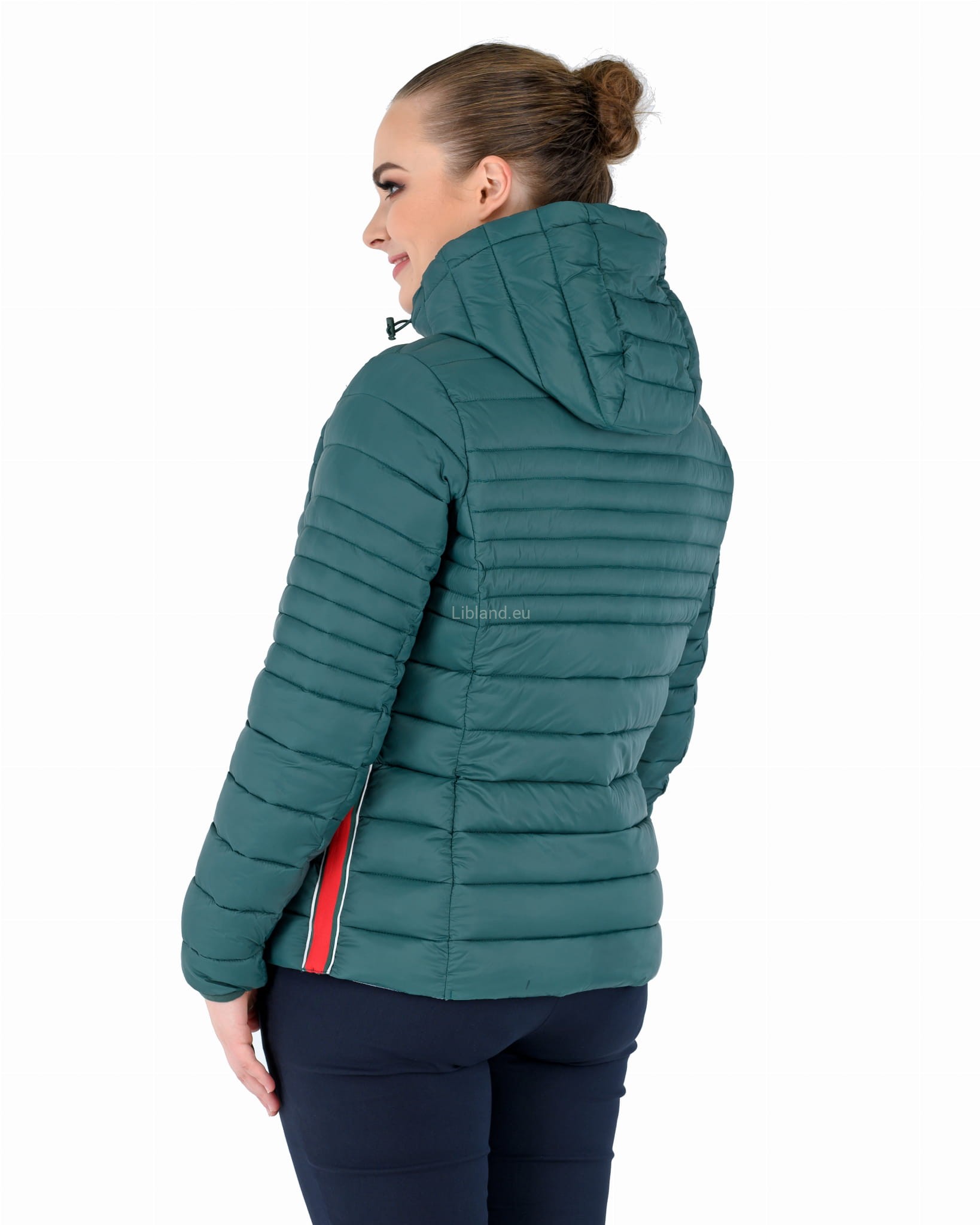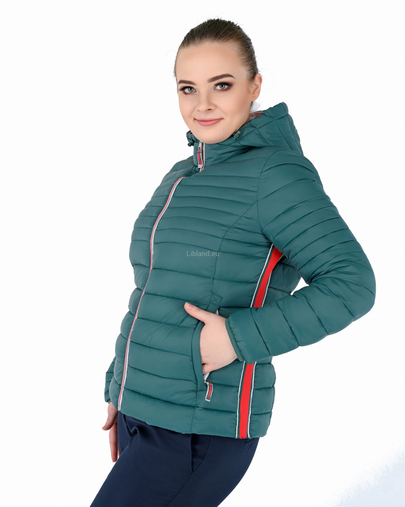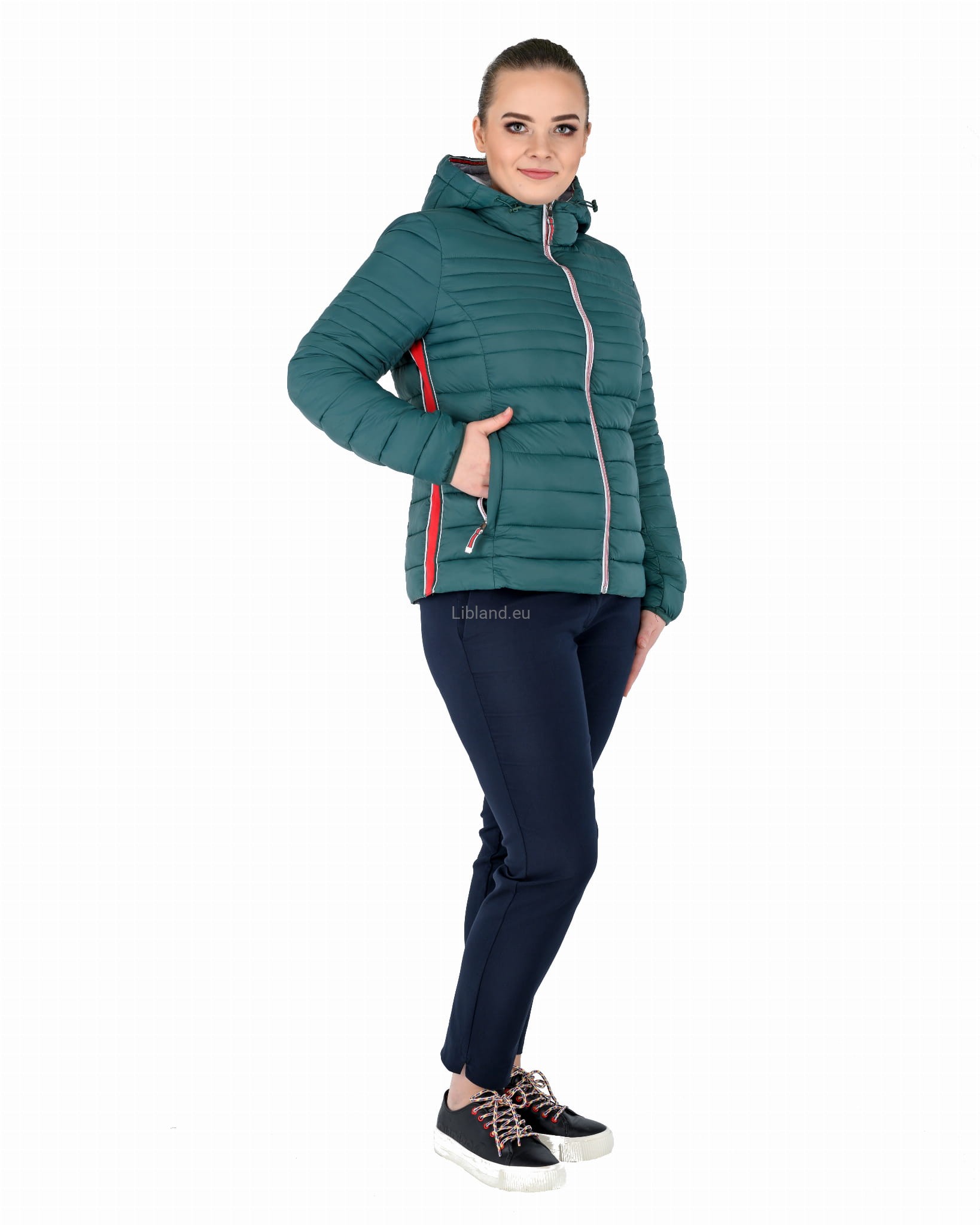Pikowana kurtka damska z kapturem ze wstawkami z pięknie kontrastującej czerwonej taśmy.