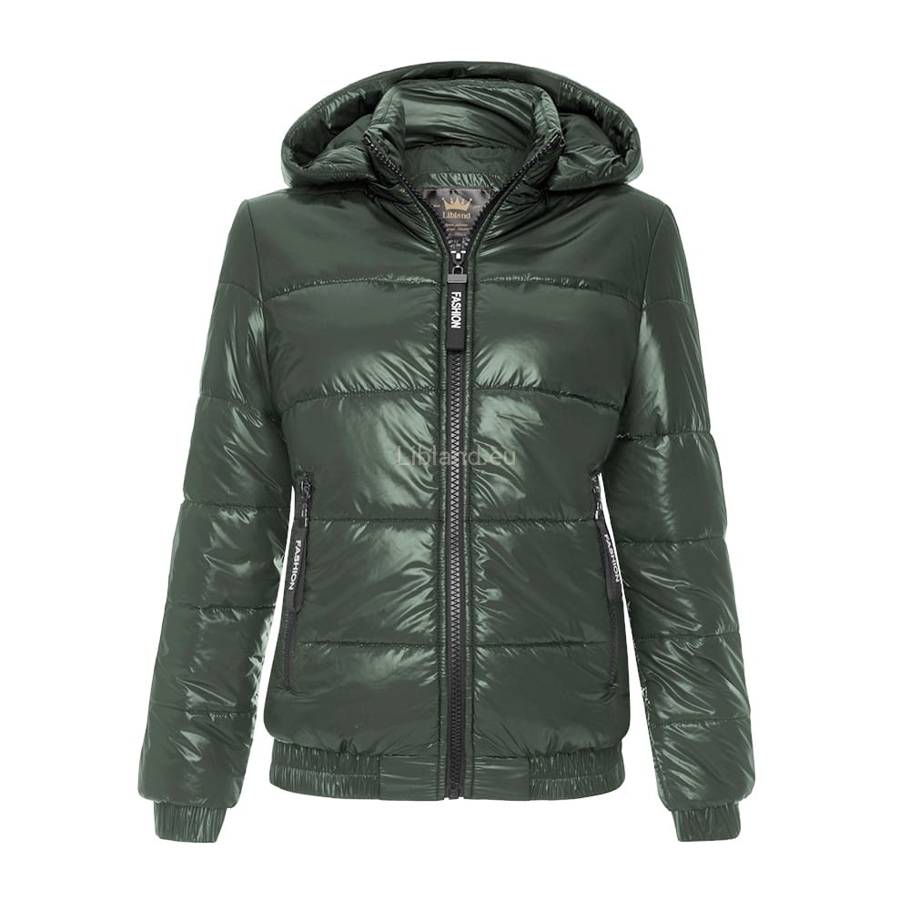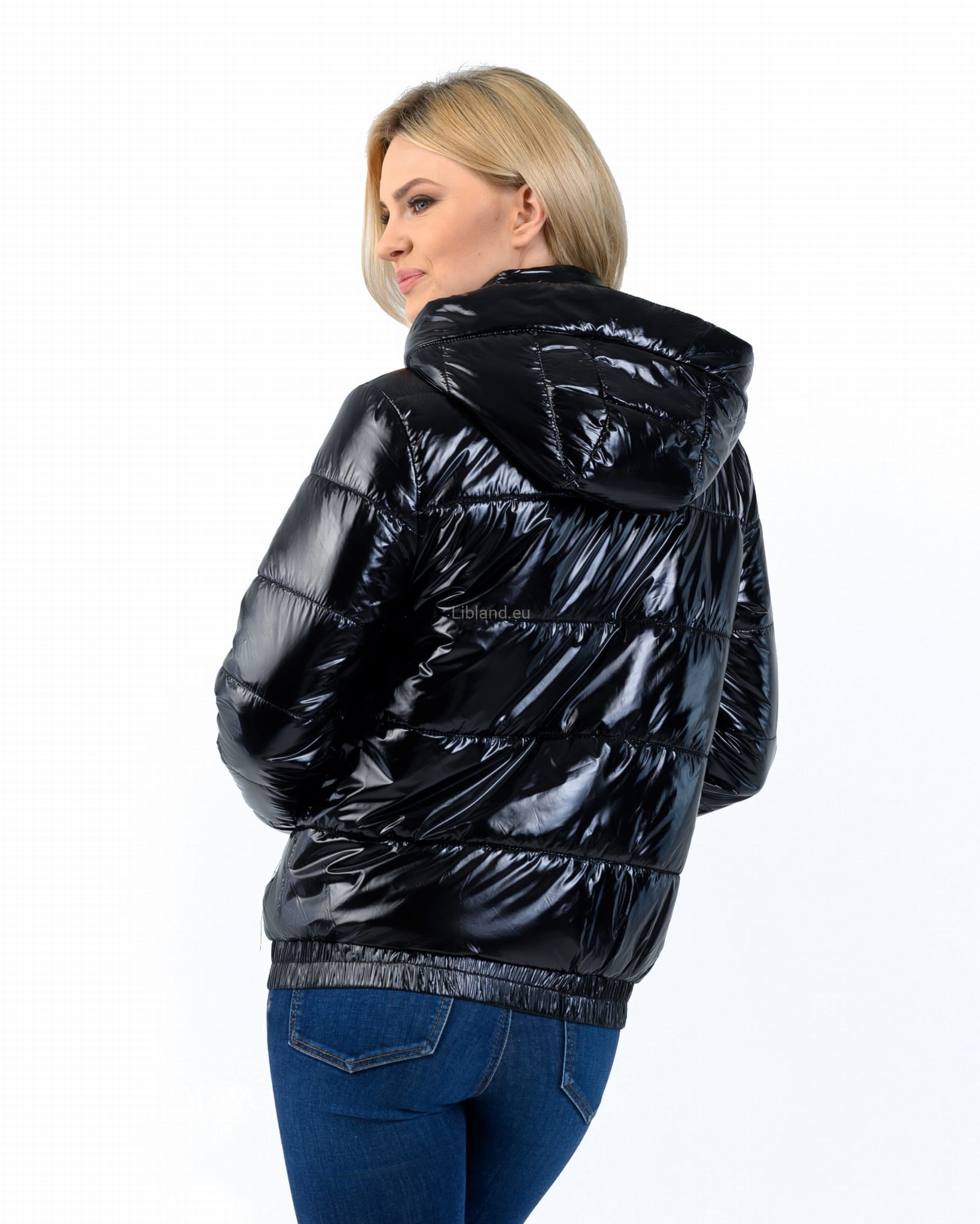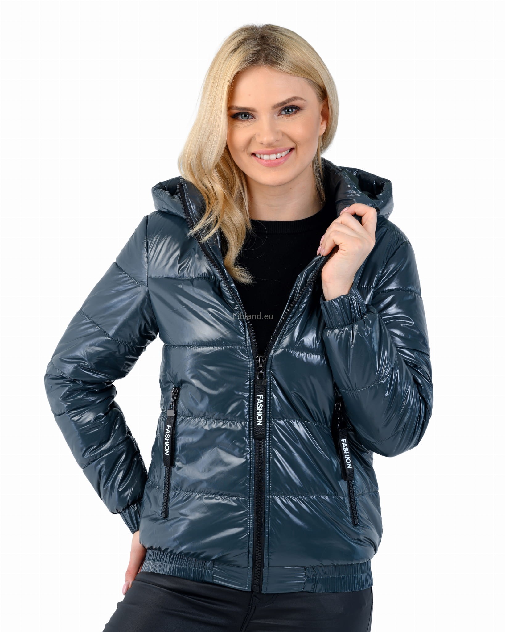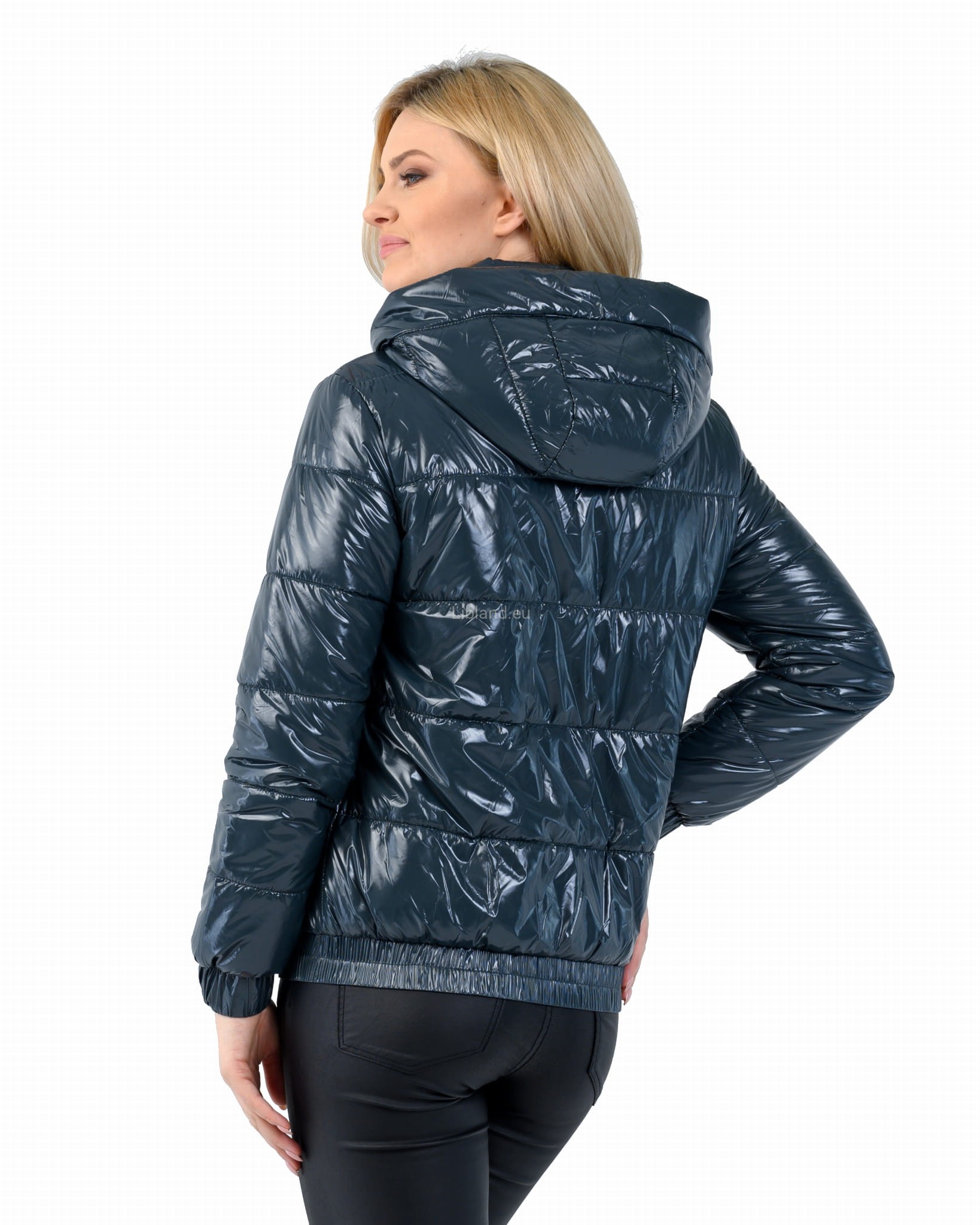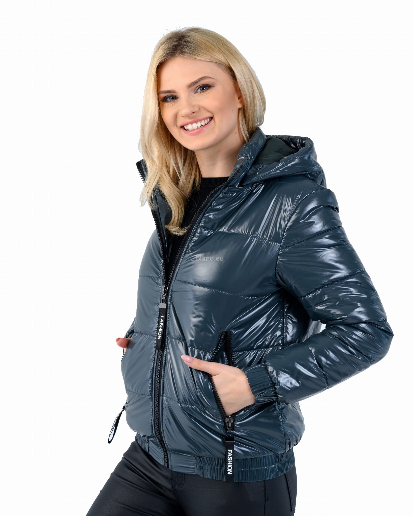 Wygodna kurtka damska przejściowa z miękkiego błyszczącego nylonu ze stójką i odpinanym kapturem.