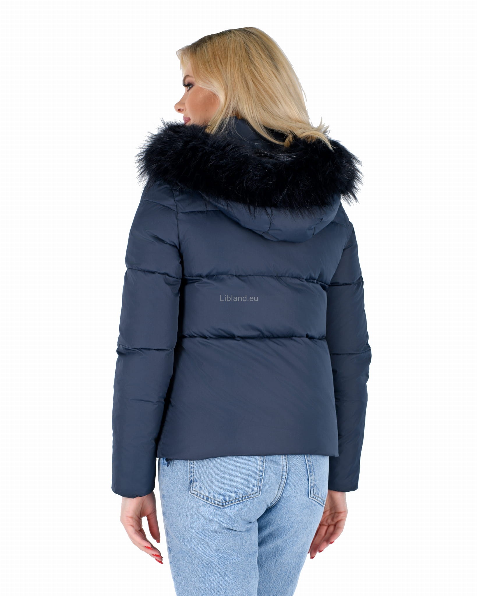 Pikowana damska kurtka z kapturem z odpinanym futerkiem.