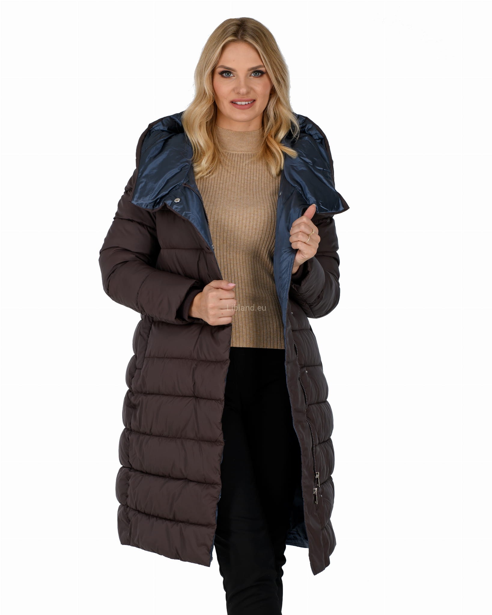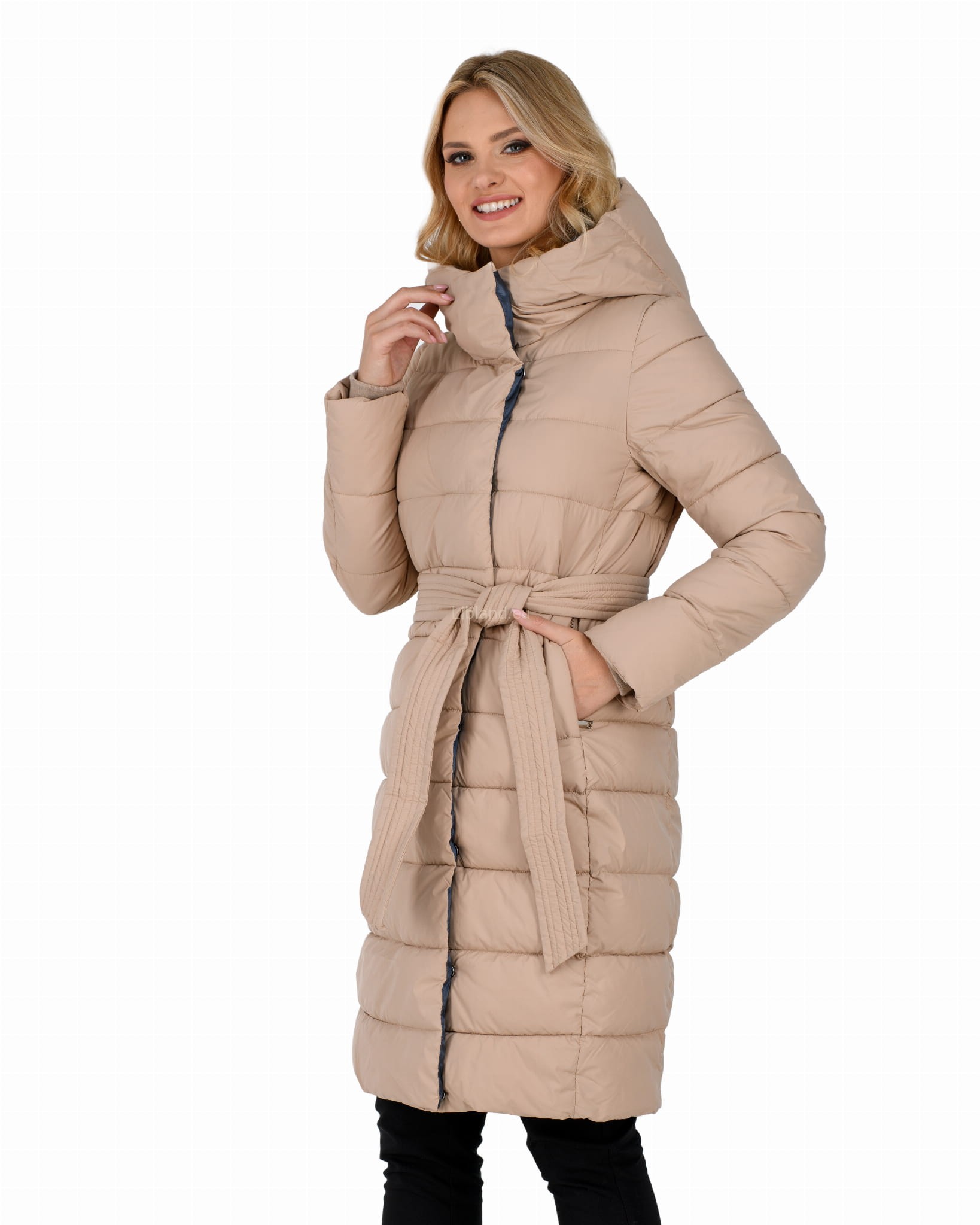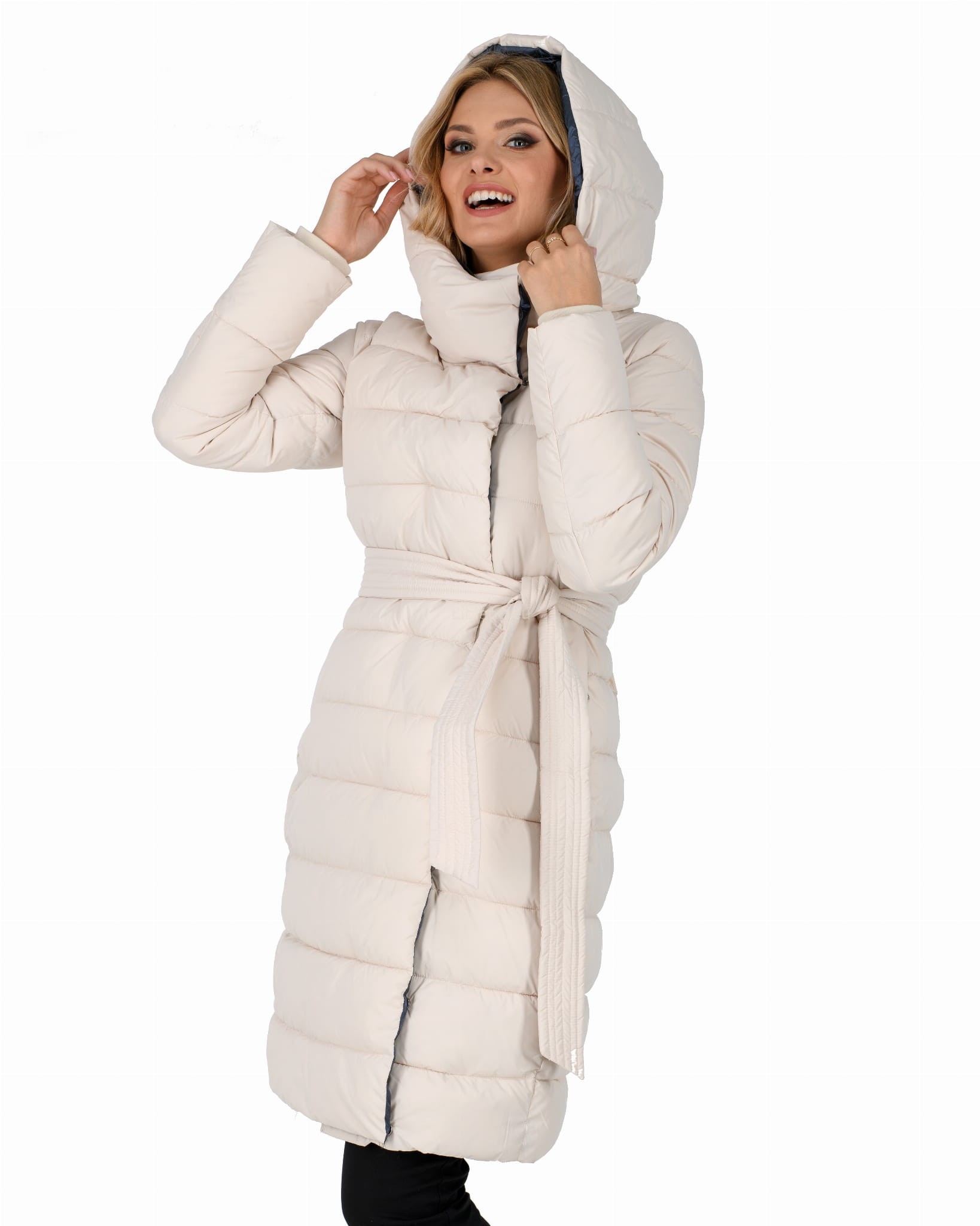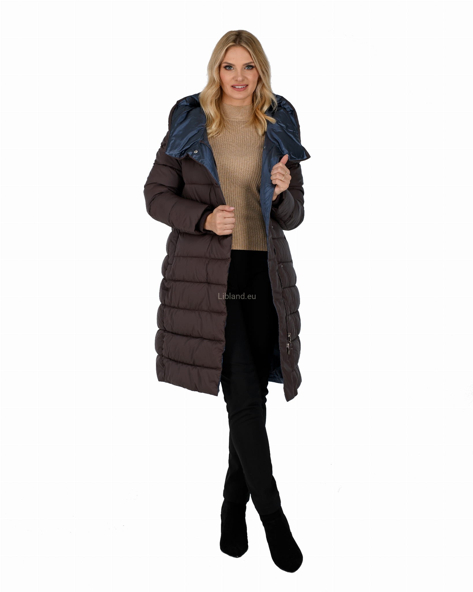 Ocieplany damski płaszcz zimowy z głębokim kapturem w formie komina.