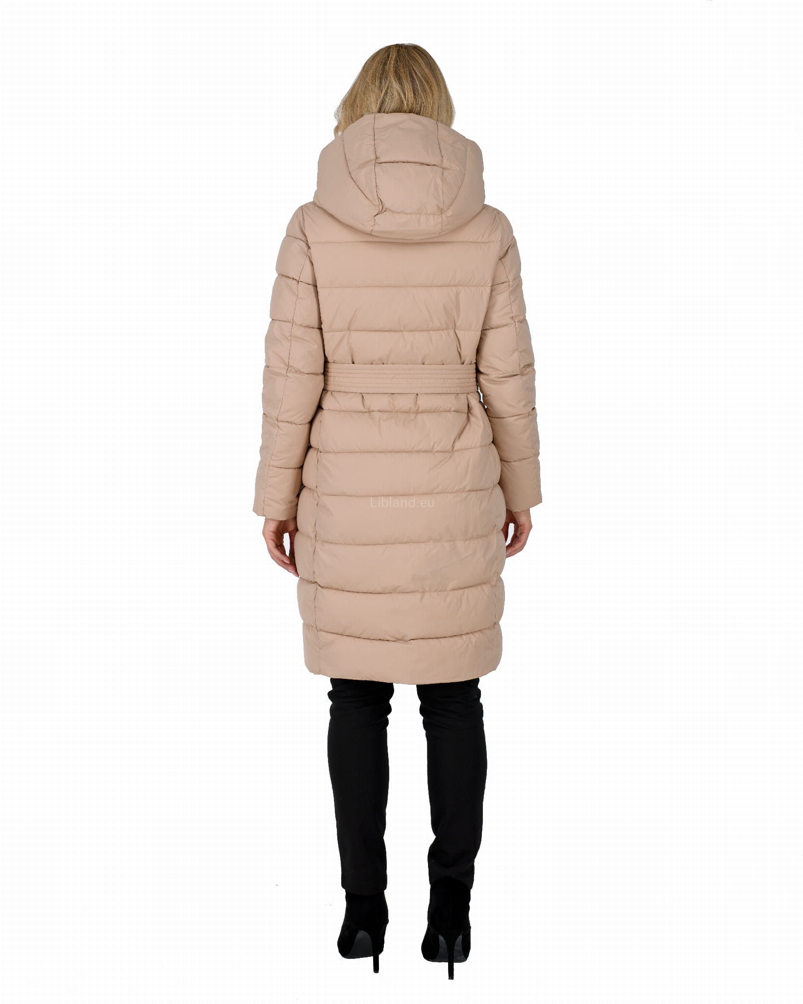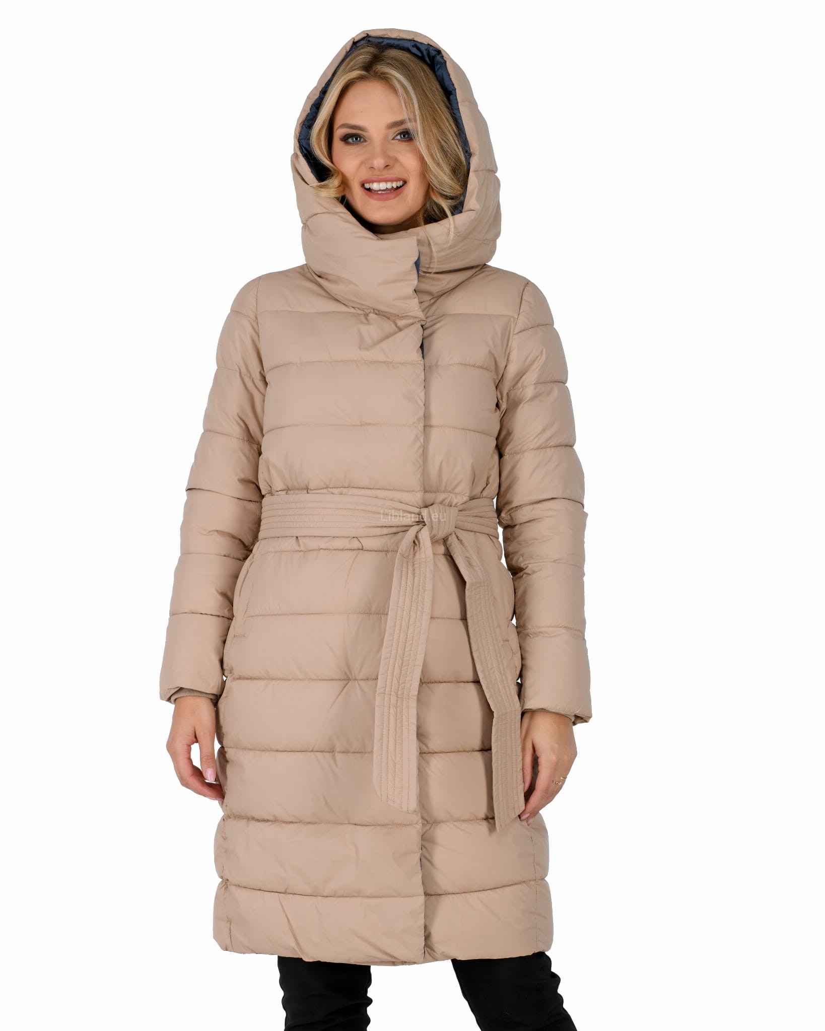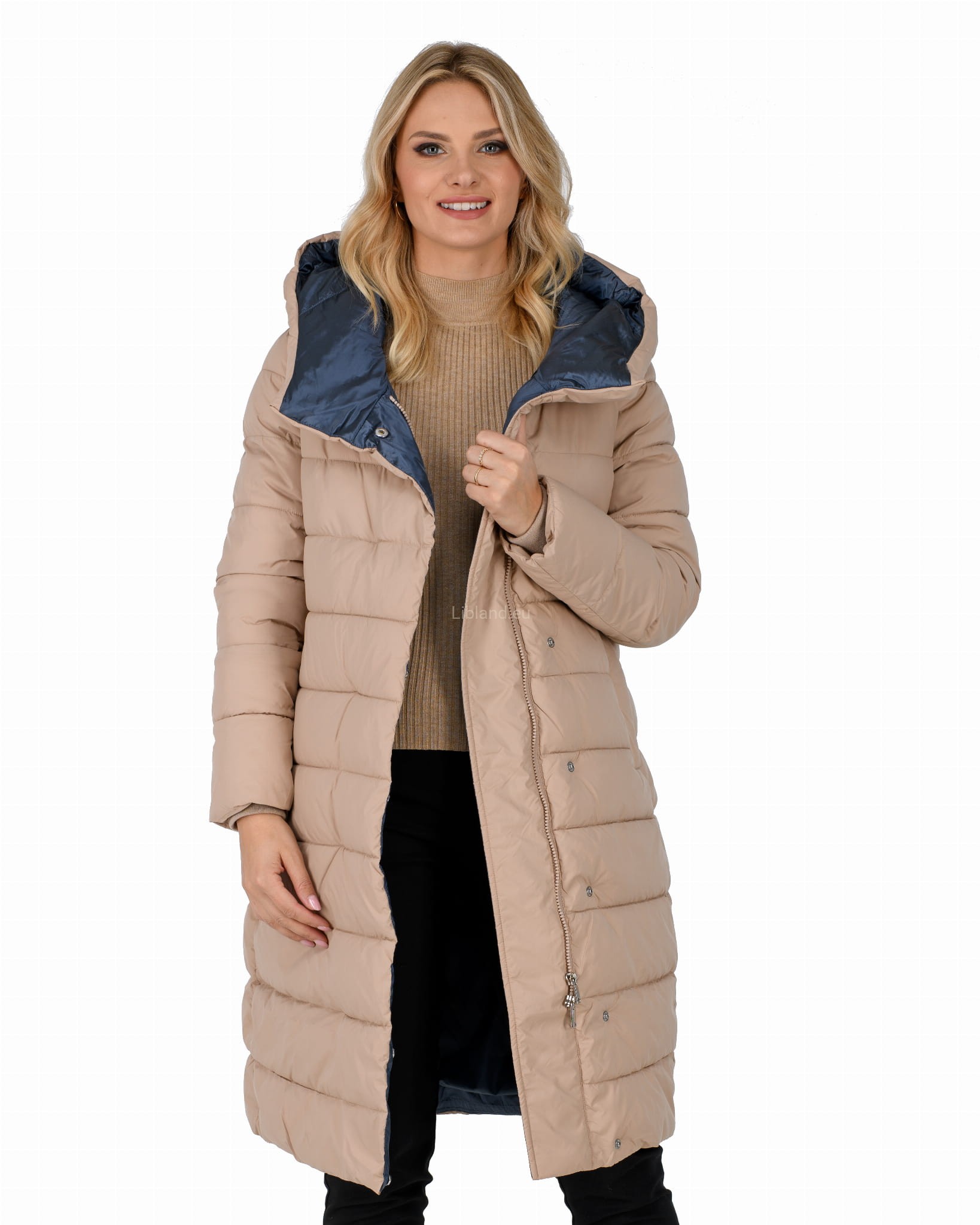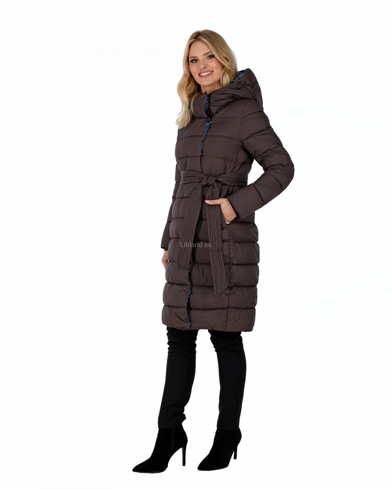 Ocieplany damski płaszcz zimowy z głębokim kapturem w formie komina.
