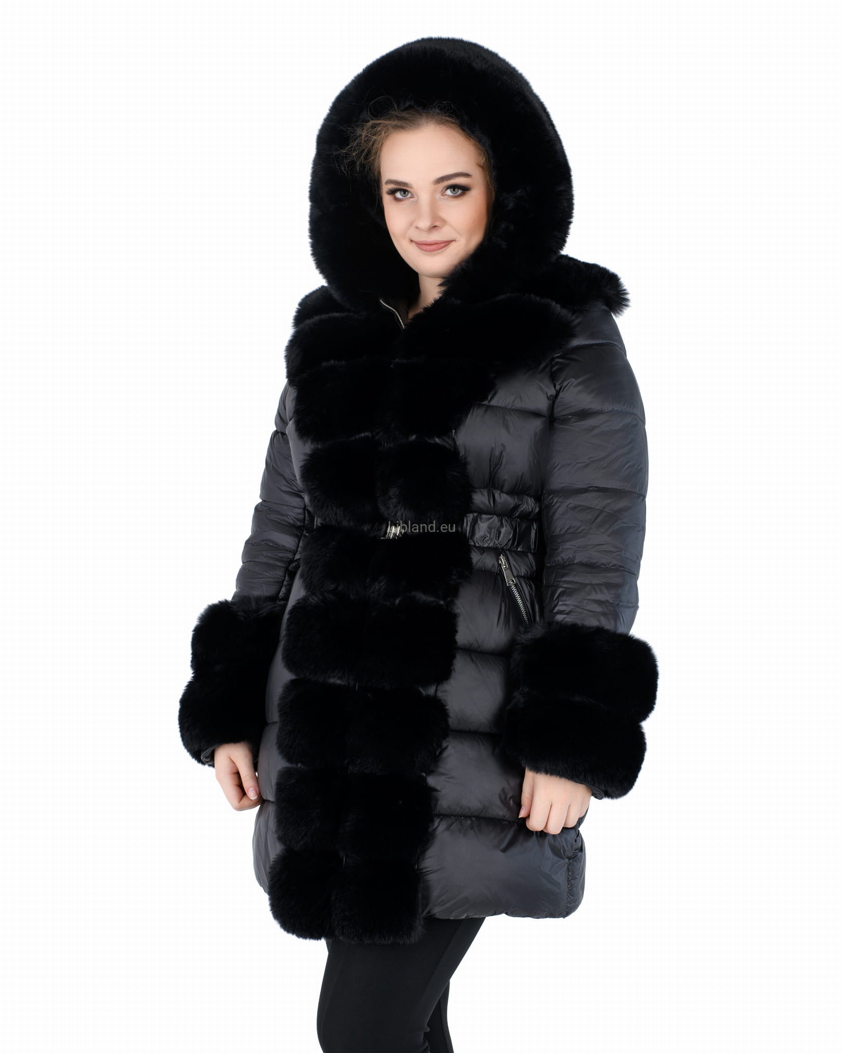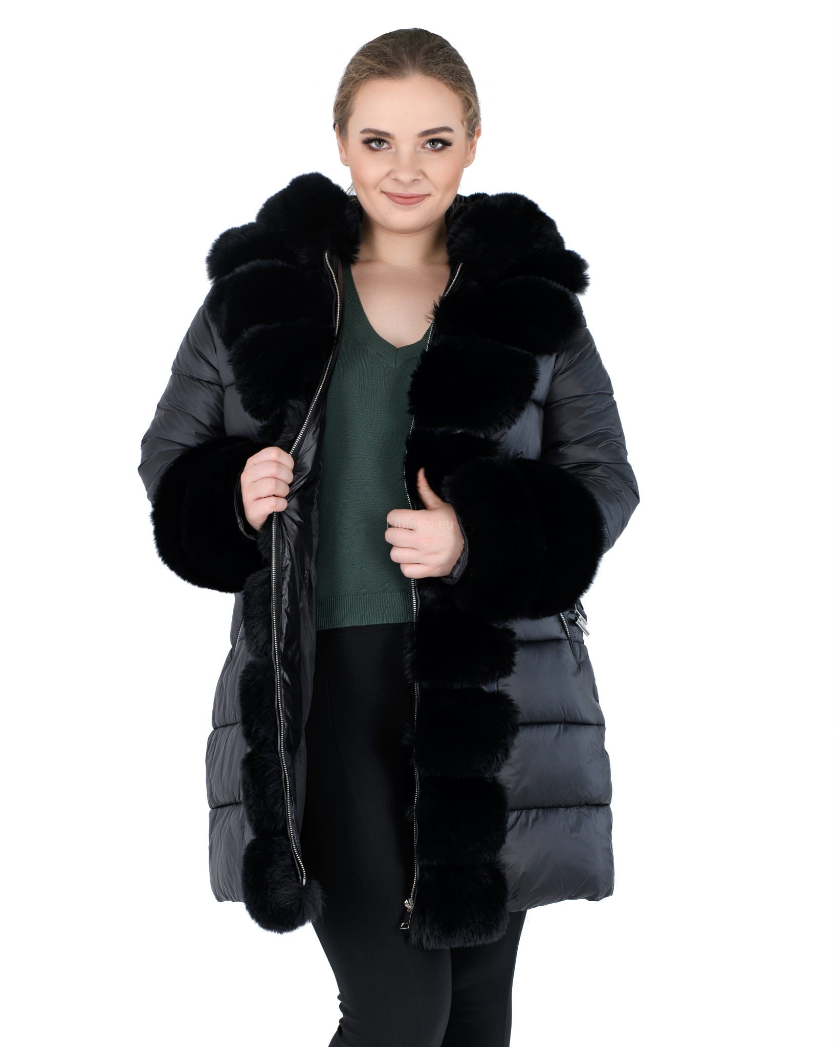 Zimowa pikowana kurtka damska z futrzanym kapturem i futerkiem na przodzie i rękawach: