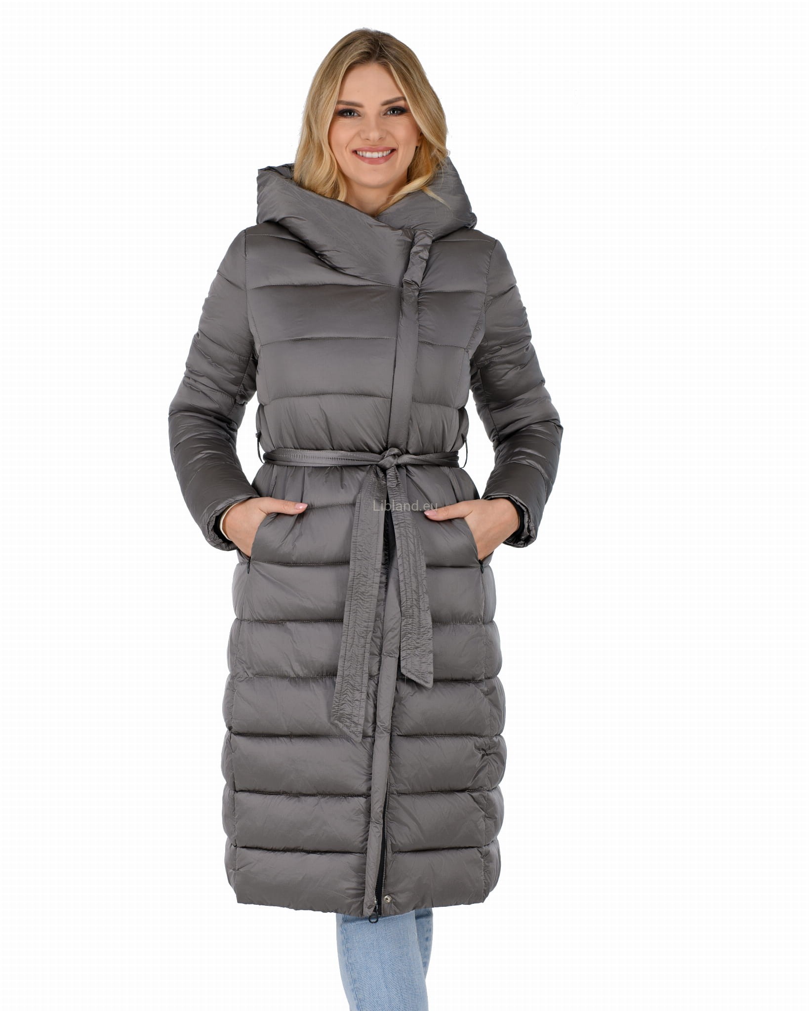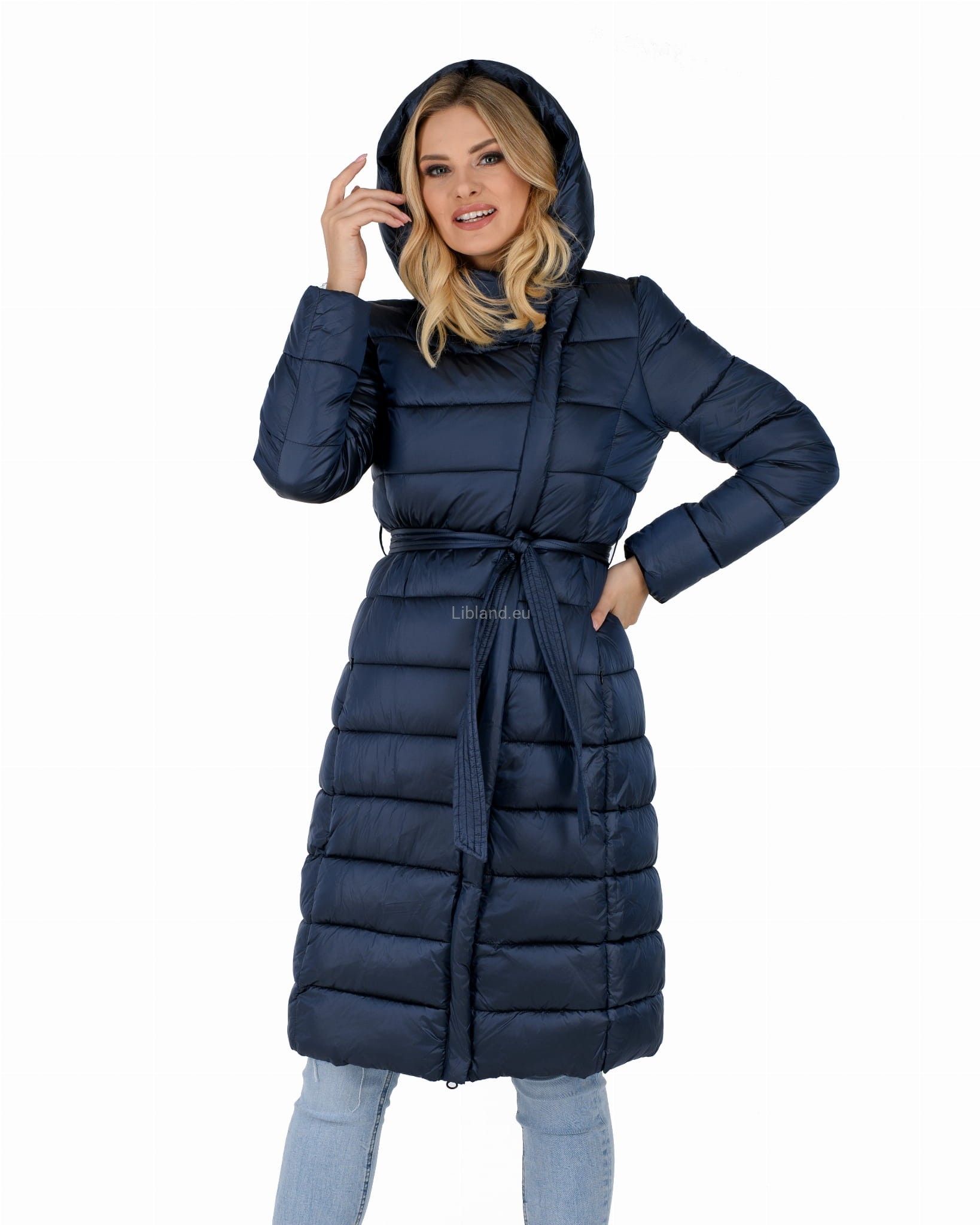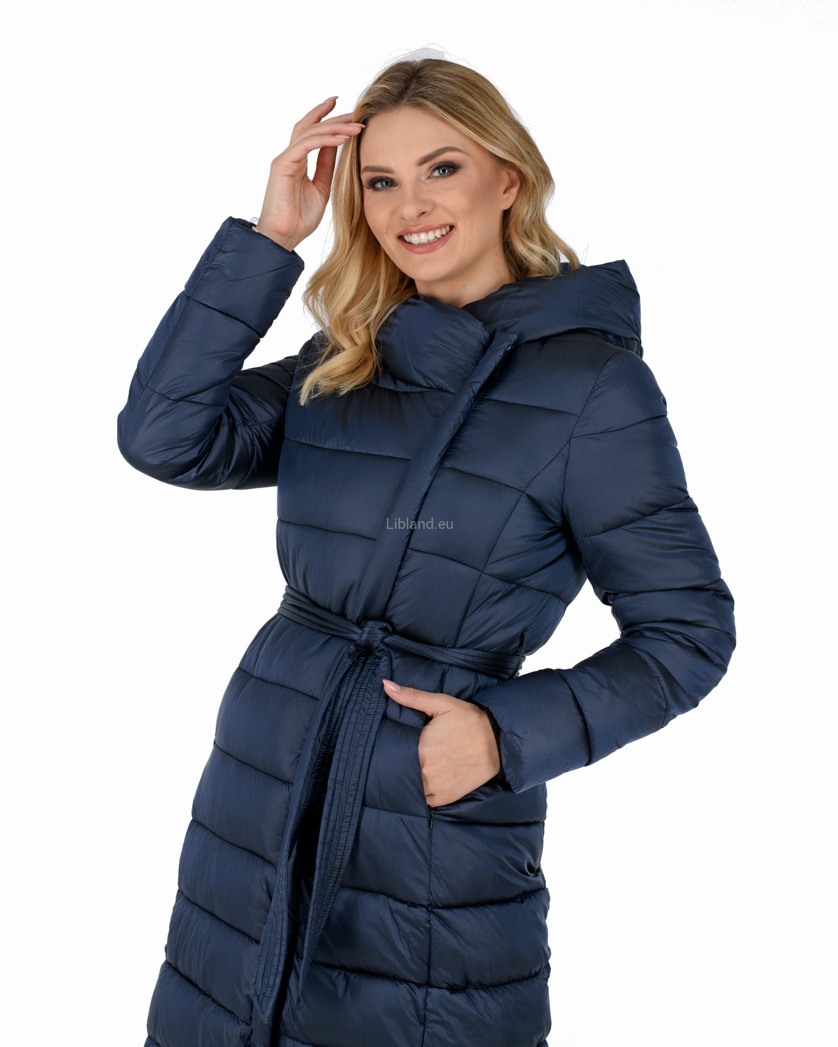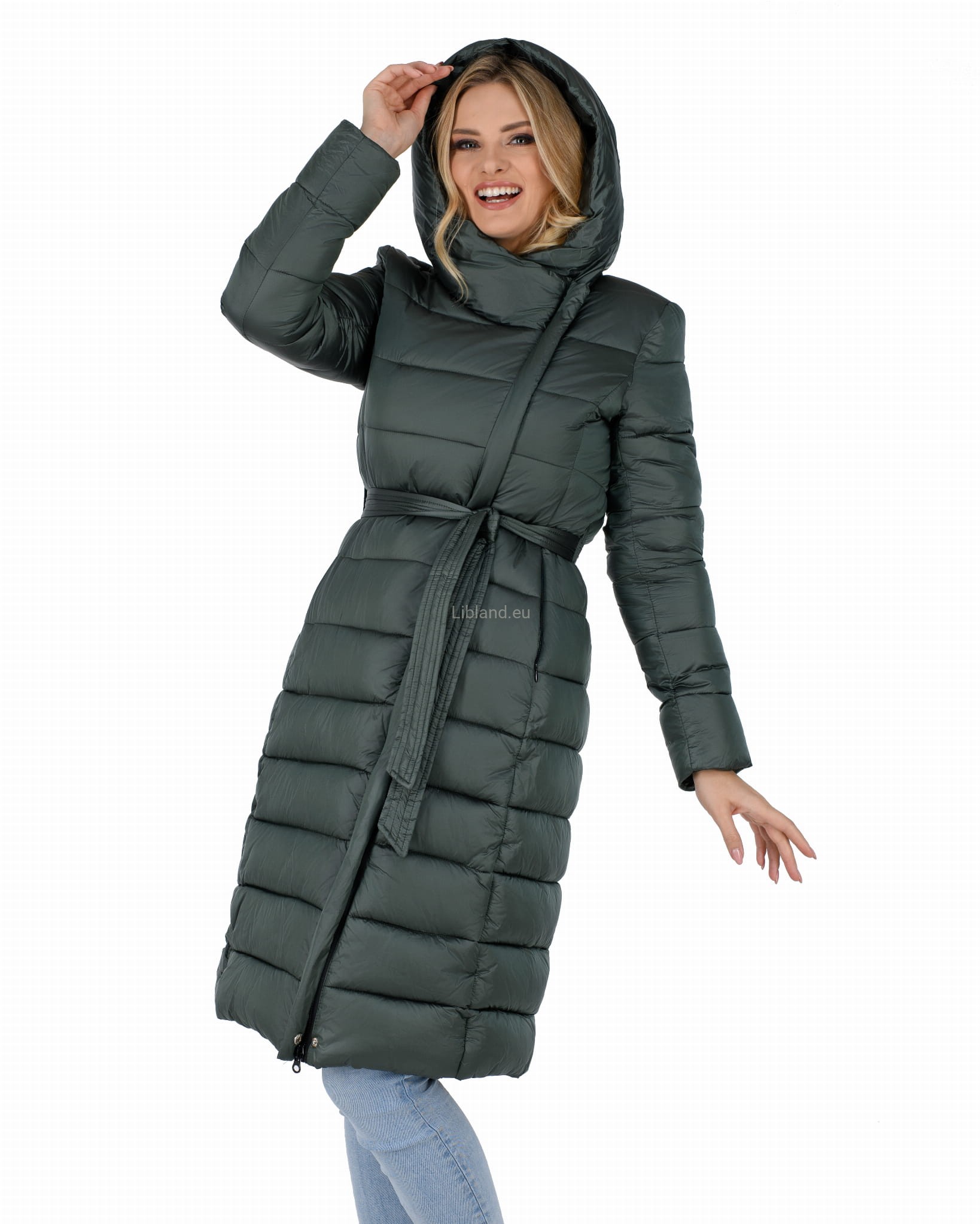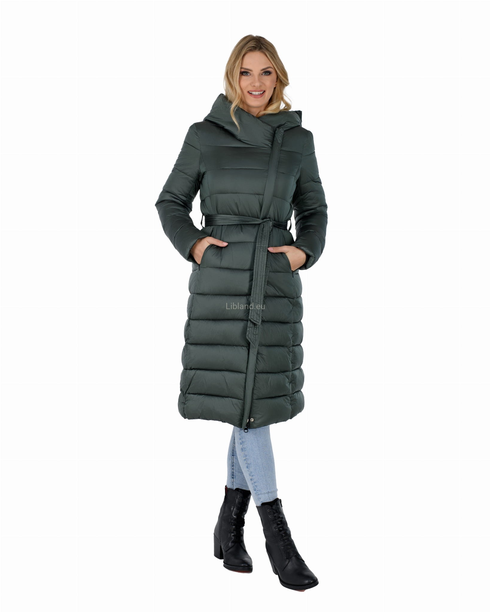 Ocieplany płaszcz damski zimowy z asymetrycznym zapięciem i paskiem zawiązywanym na przodzie.