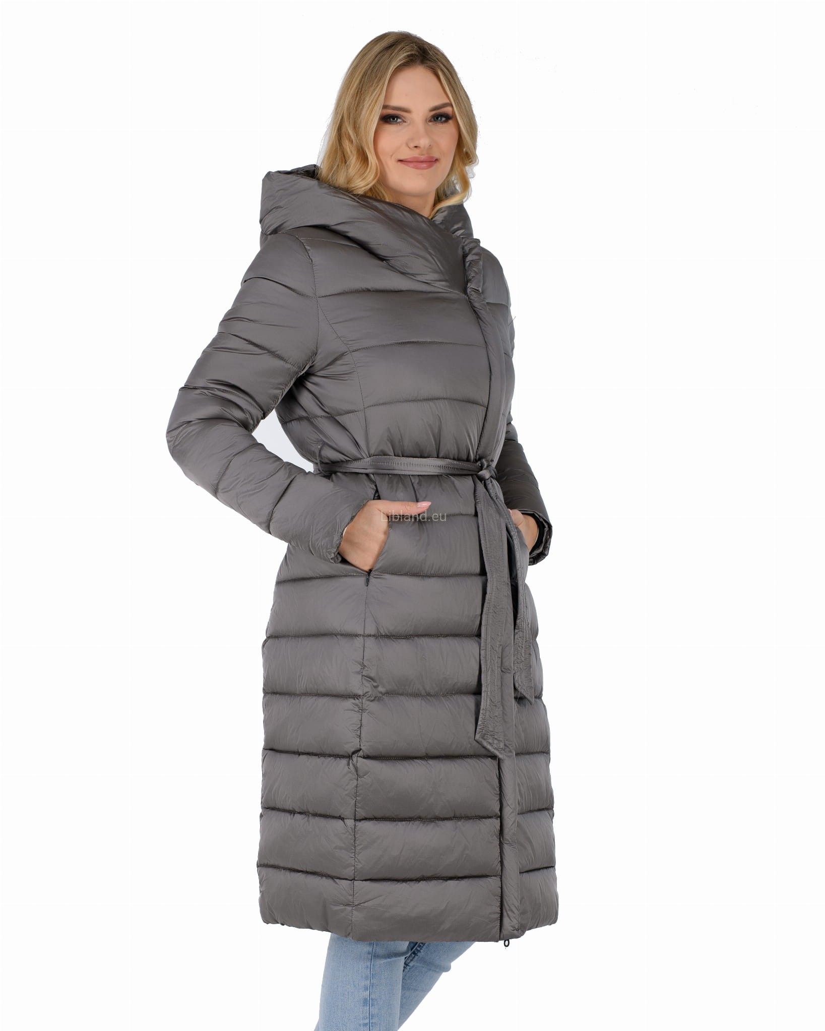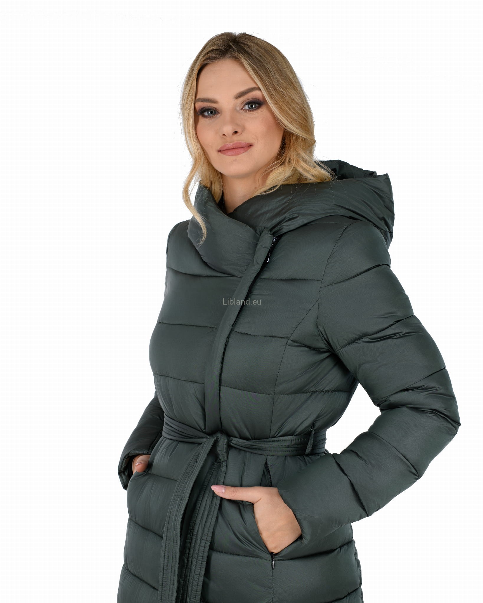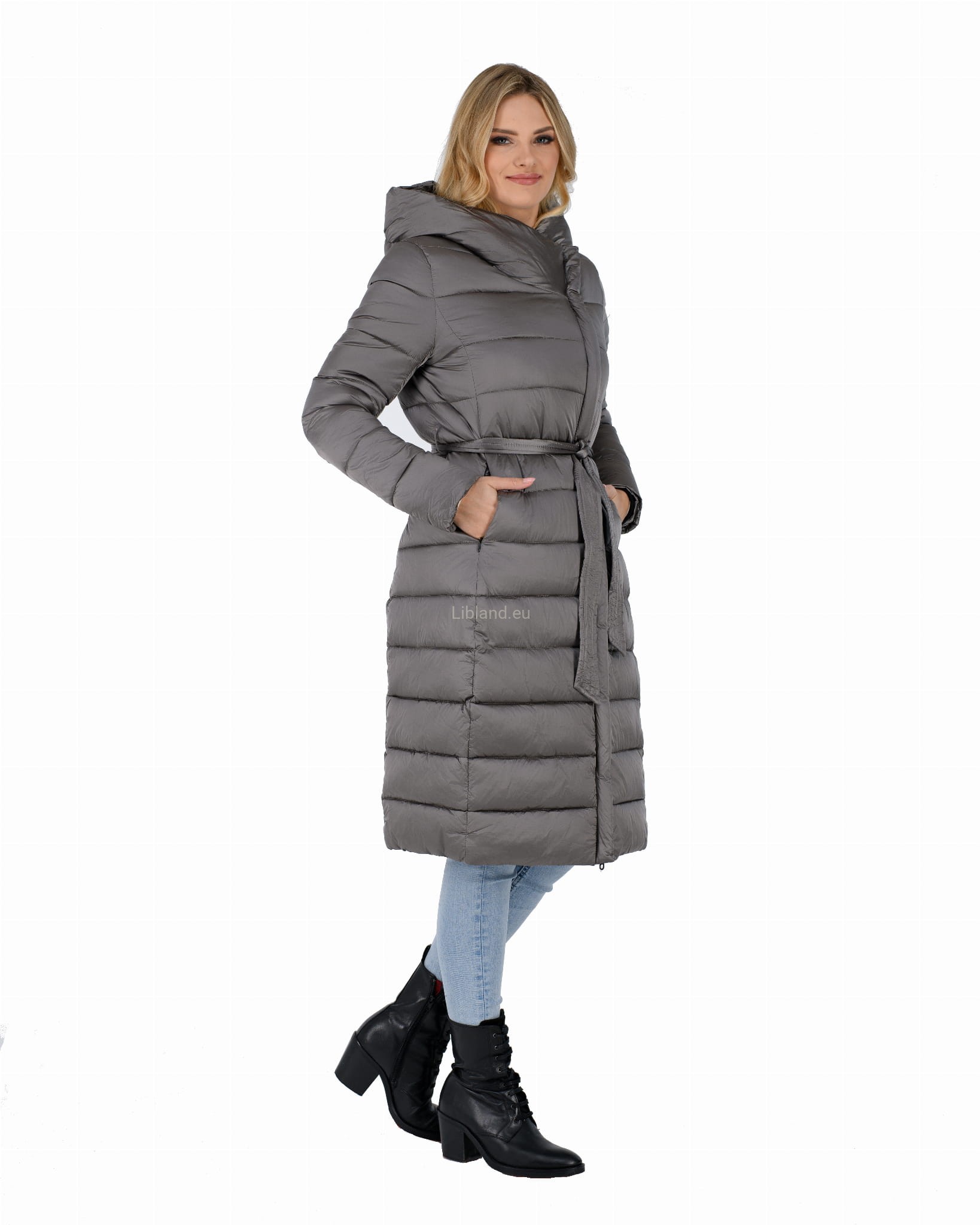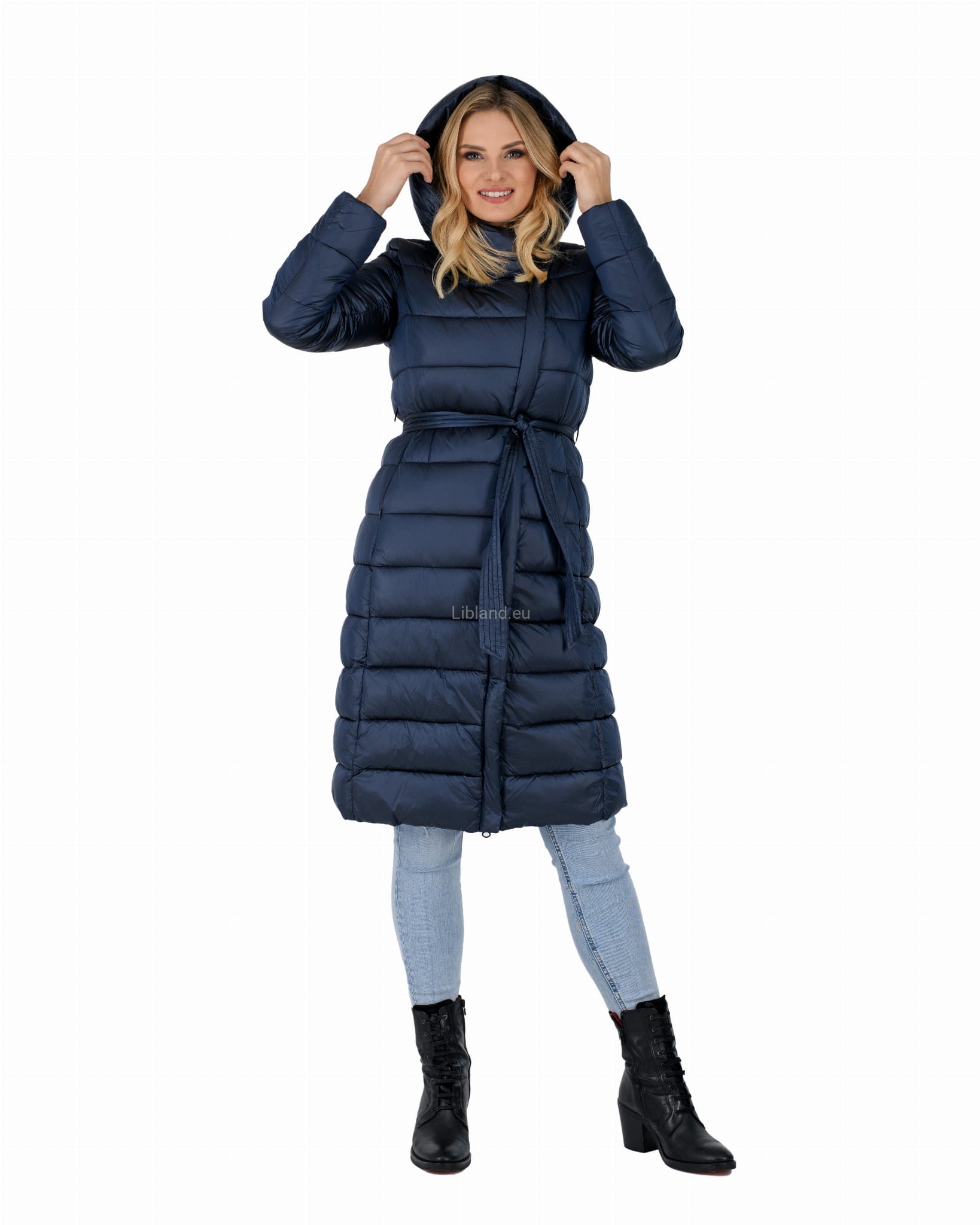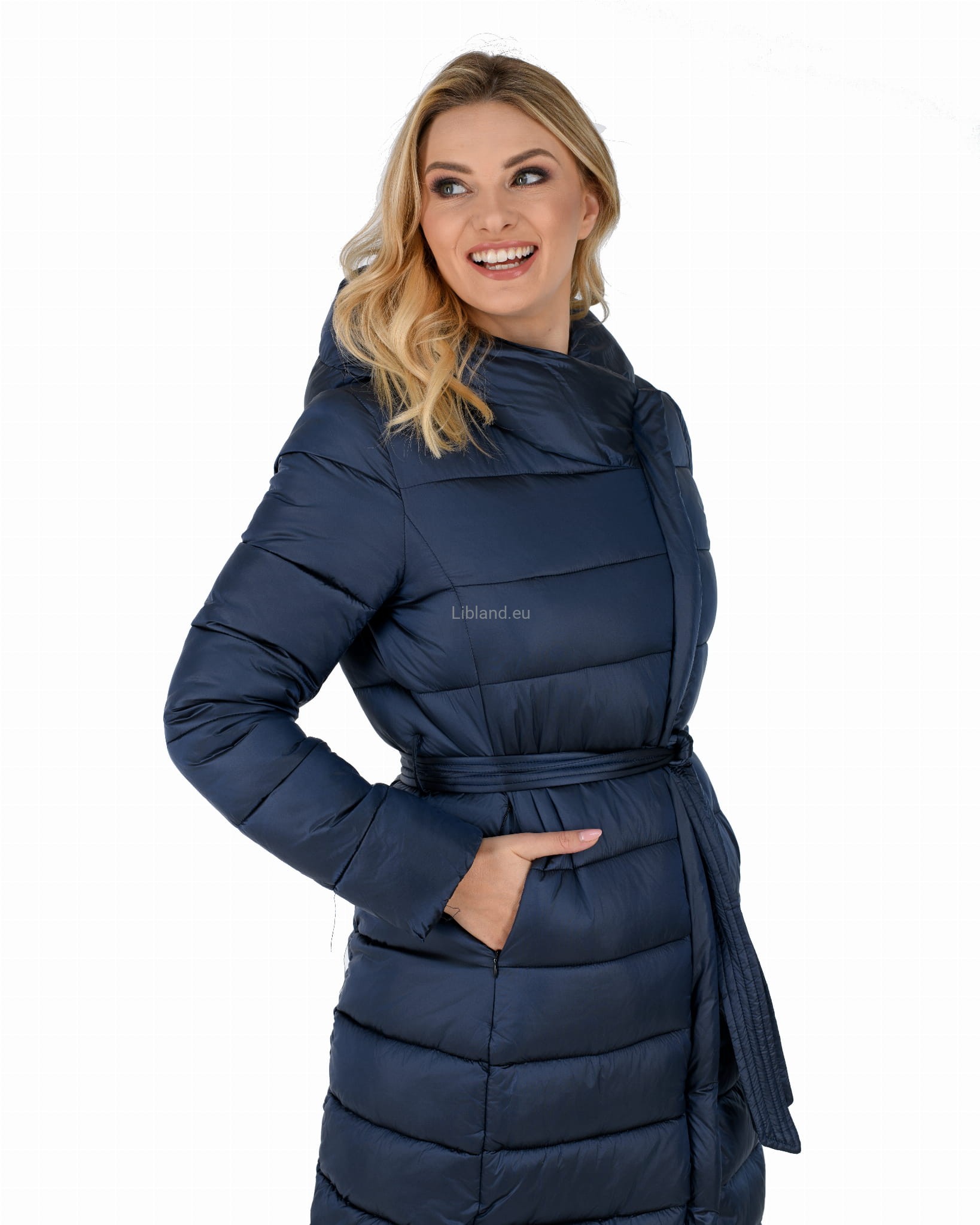 Ocieplany płaszcz damski zimowy z asymetrycznym zapięciem i paskiem zawiązywanym na przodzie.