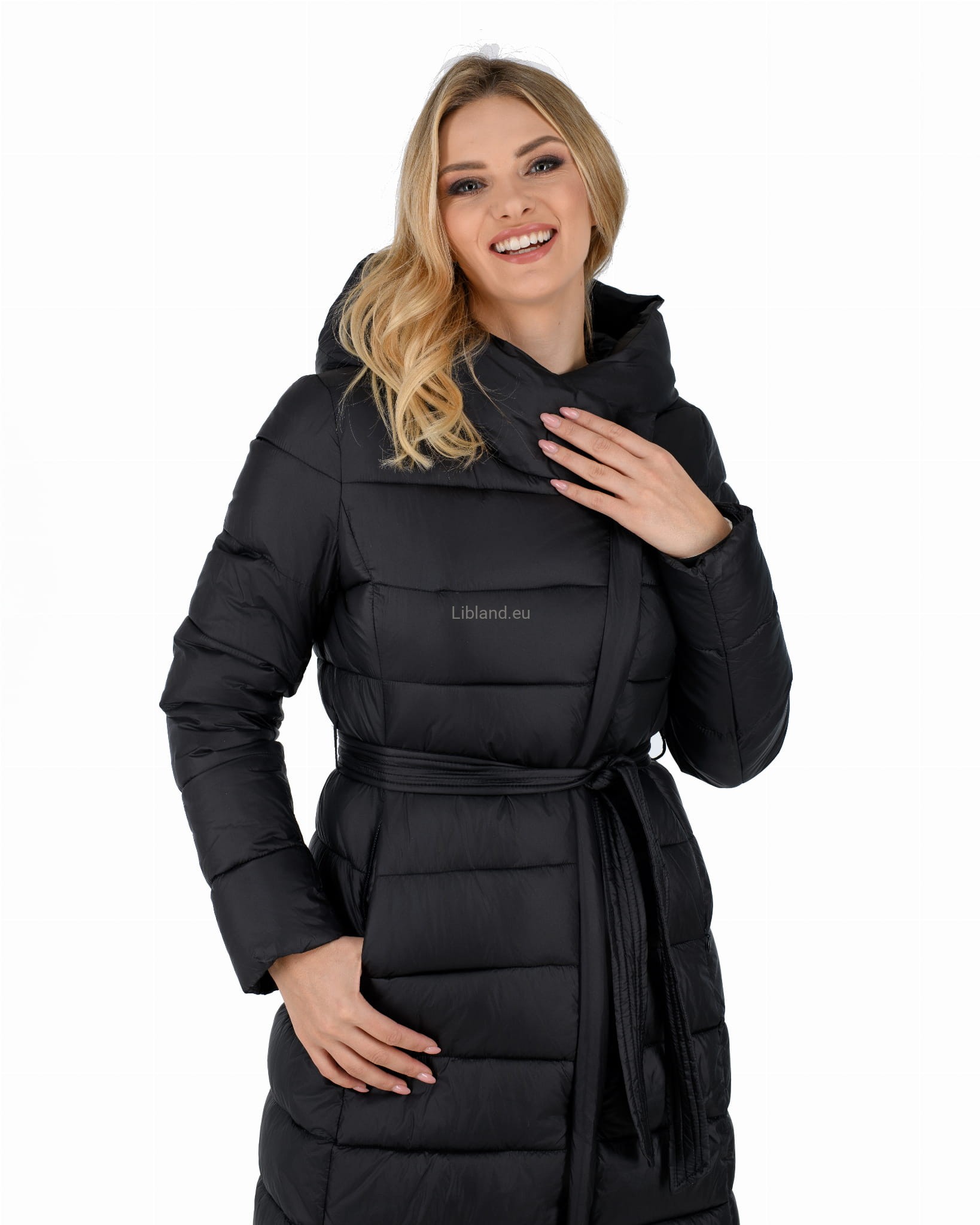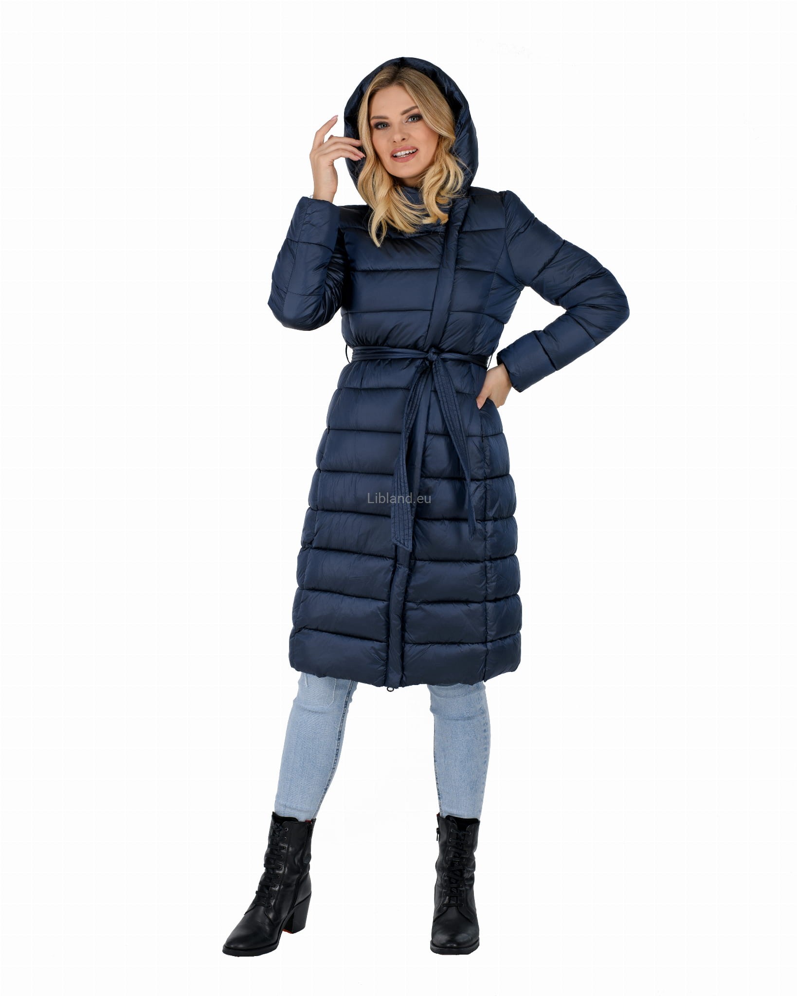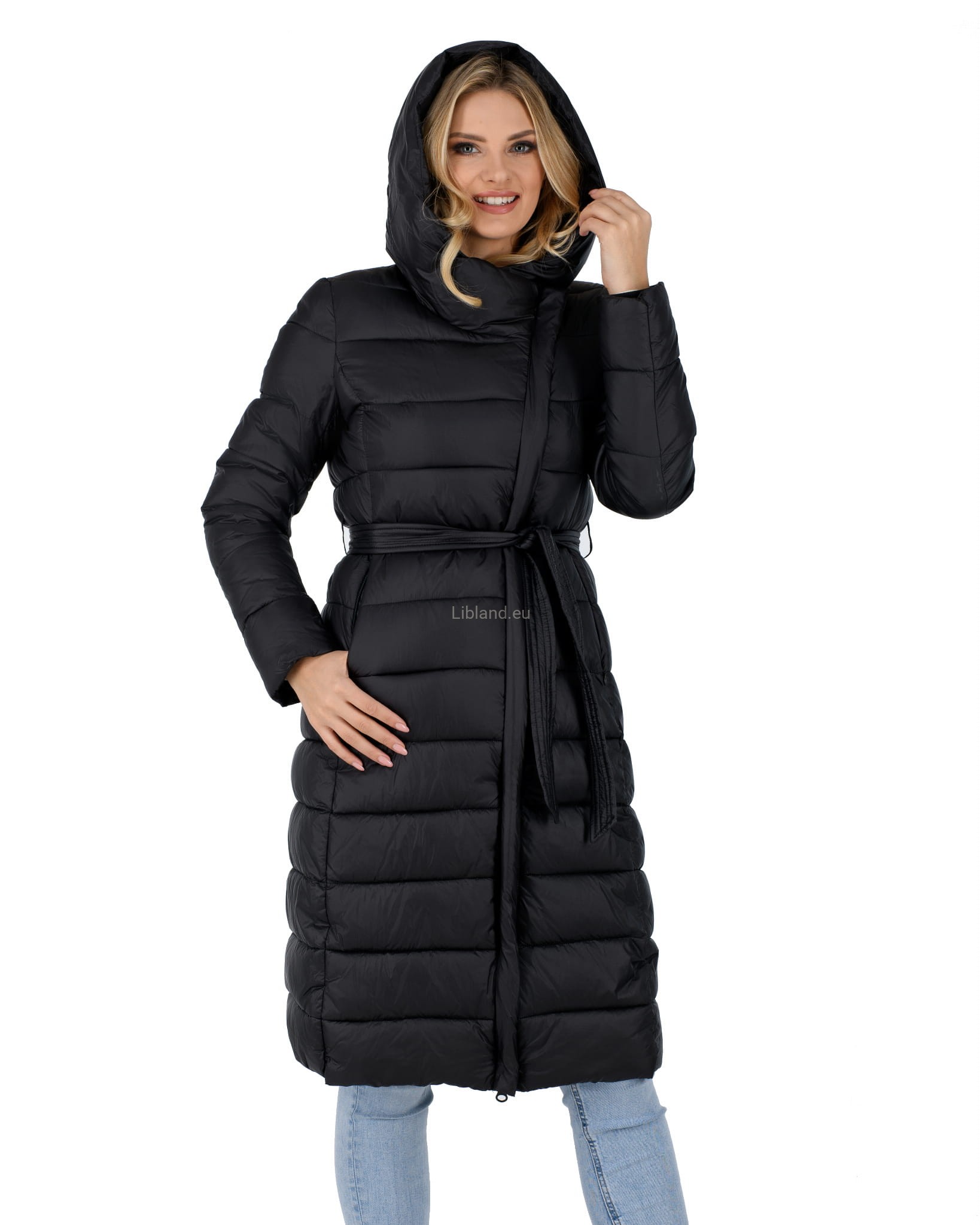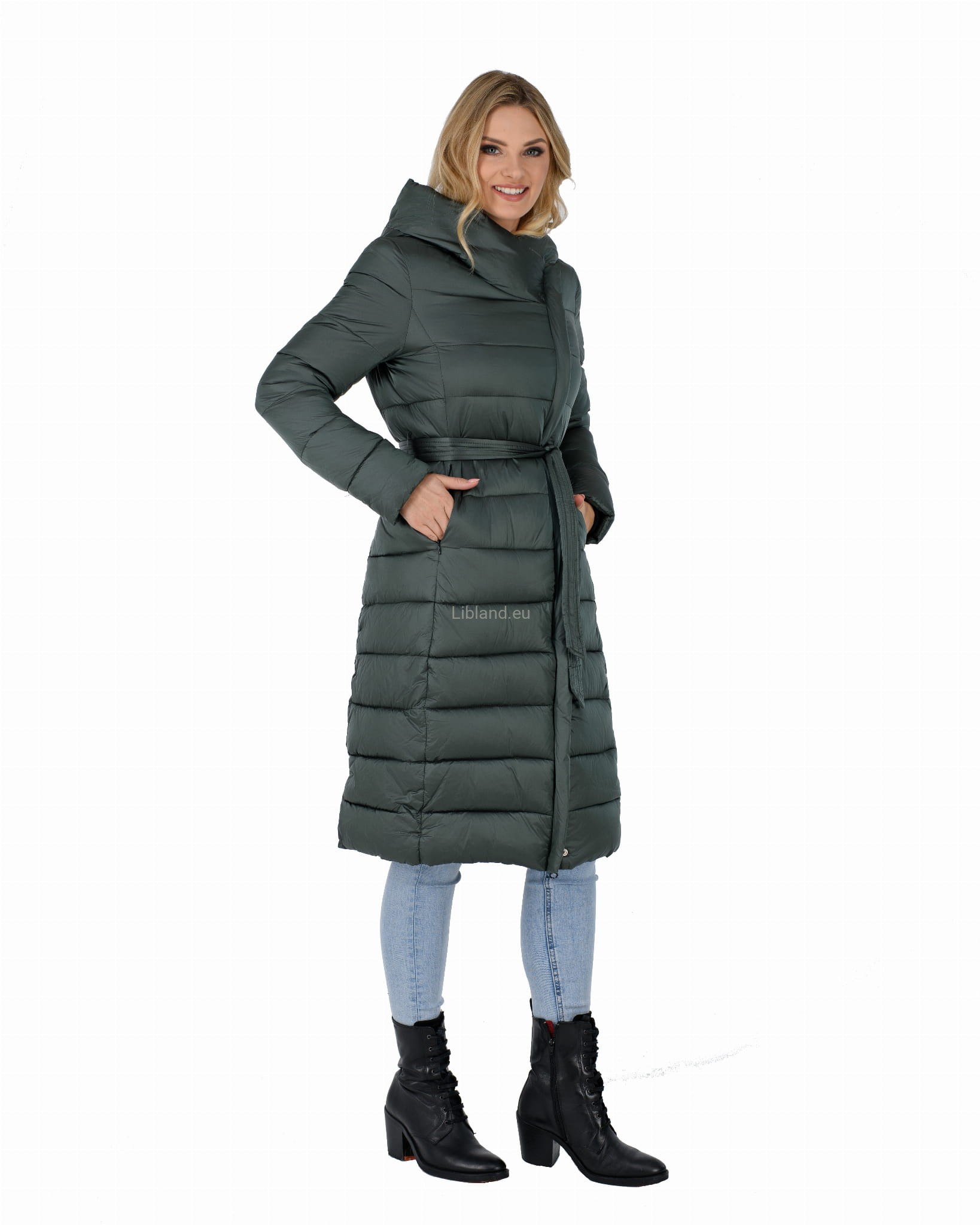 Ocieplany płaszcz damski zimowy z asymetrycznym zapięciem i paskiem zawiązywanym na przodzie.