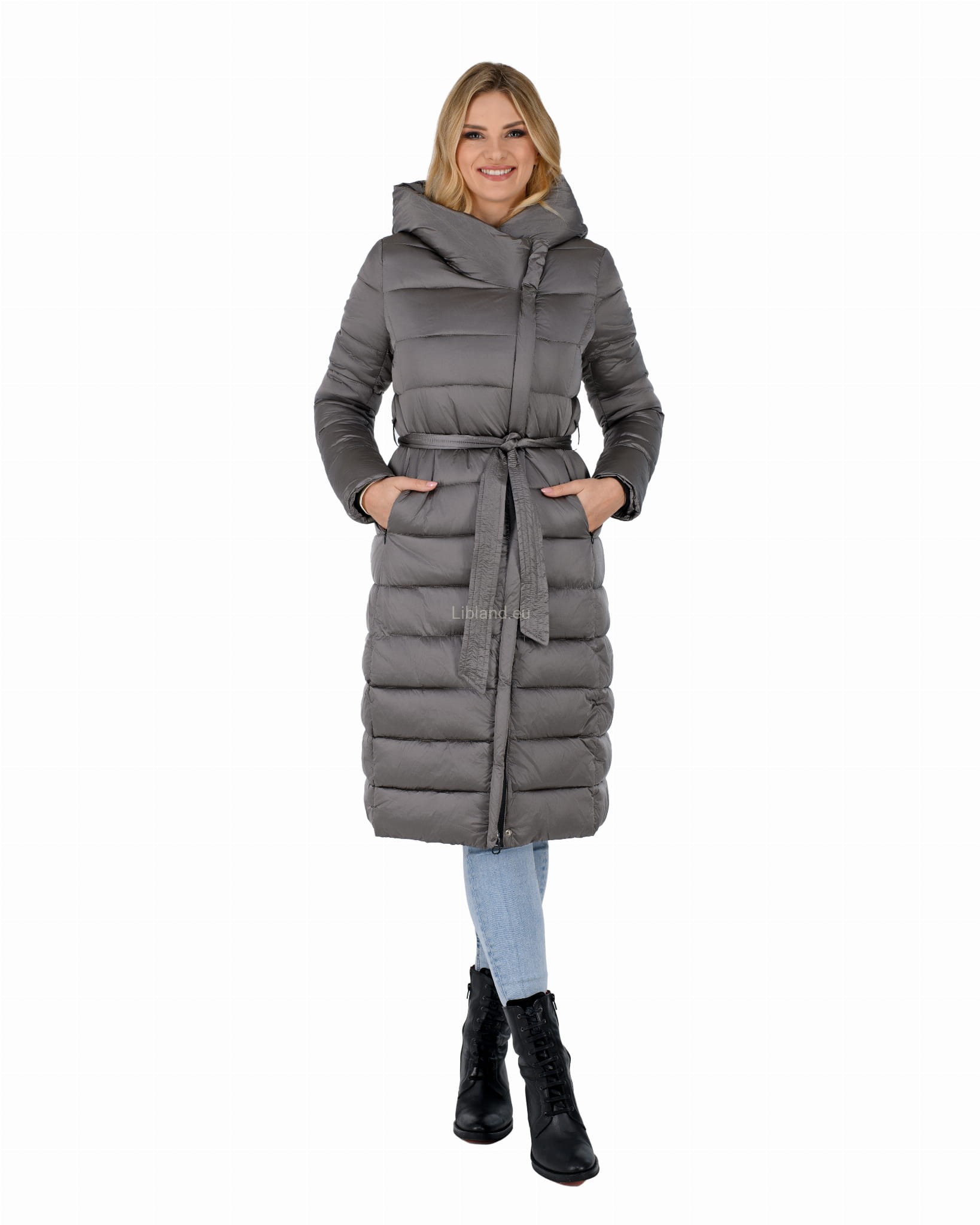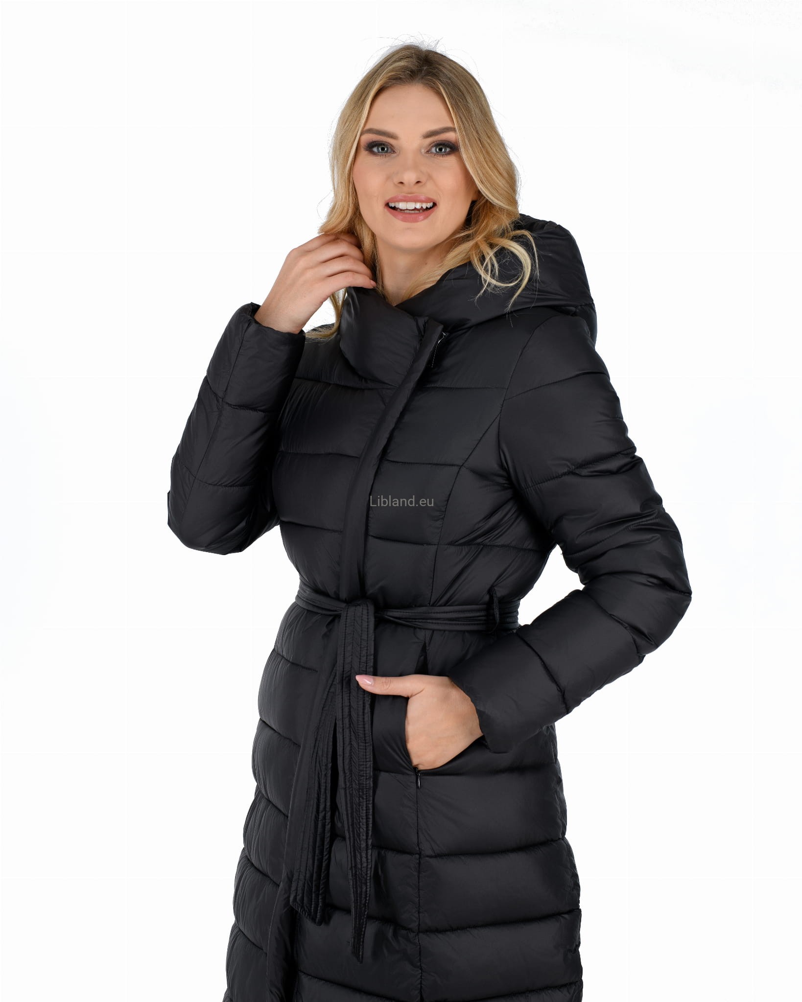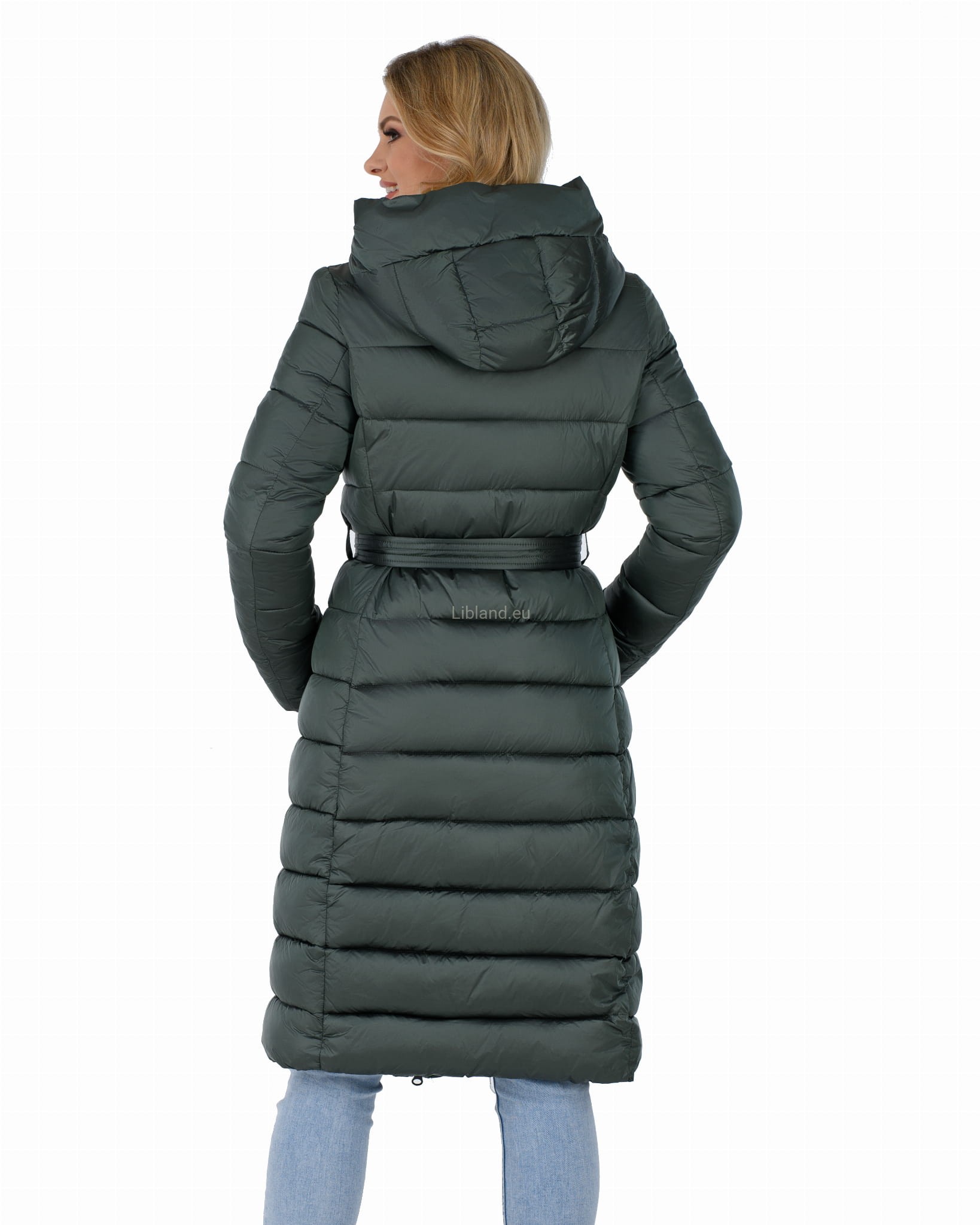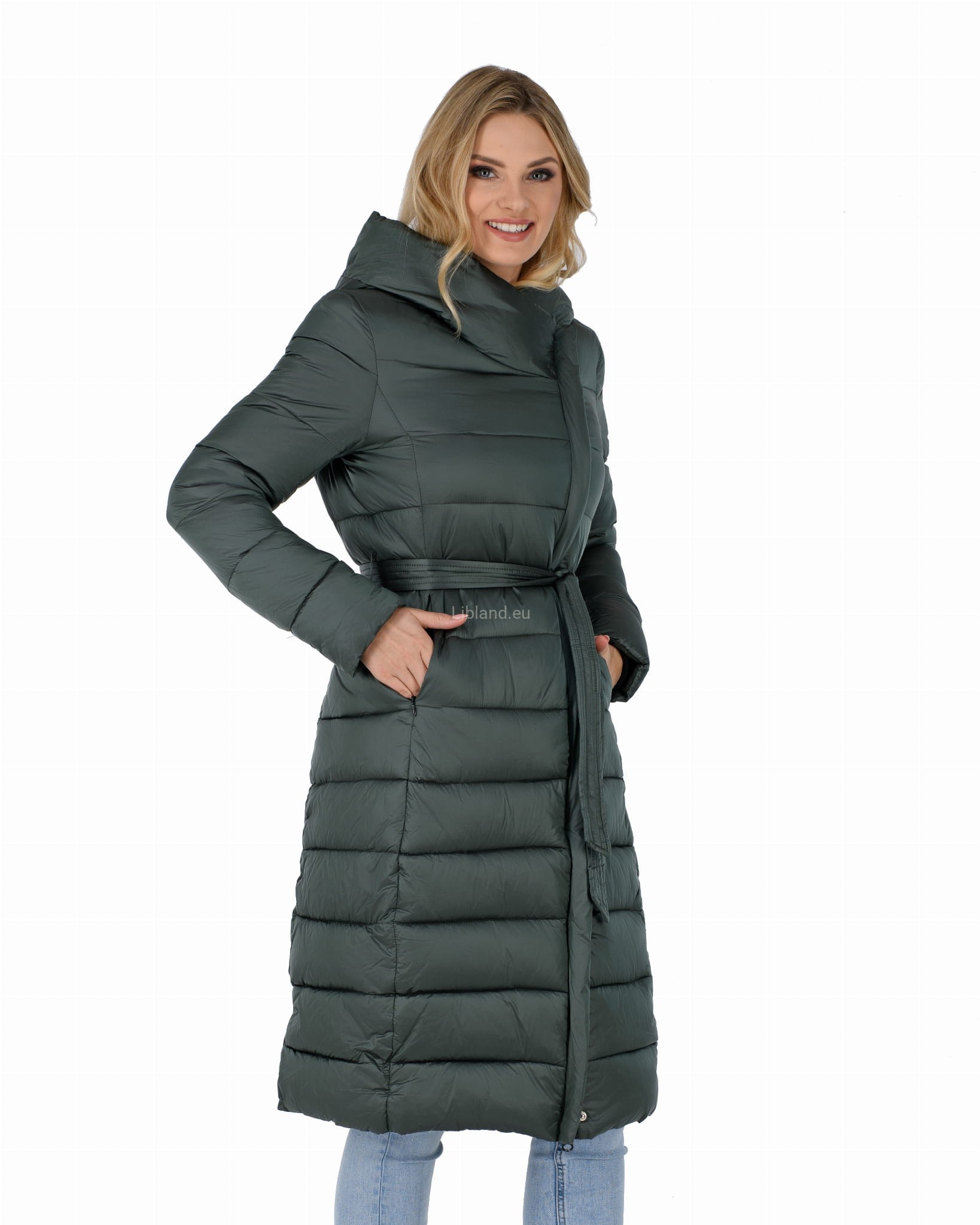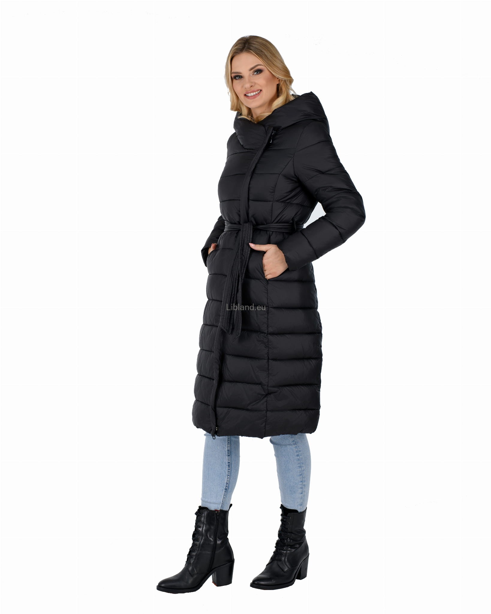 Ocieplany płaszcz damski zimowy z asymetrycznym zapięciem i paskiem zawiązywanym na przodzie.
