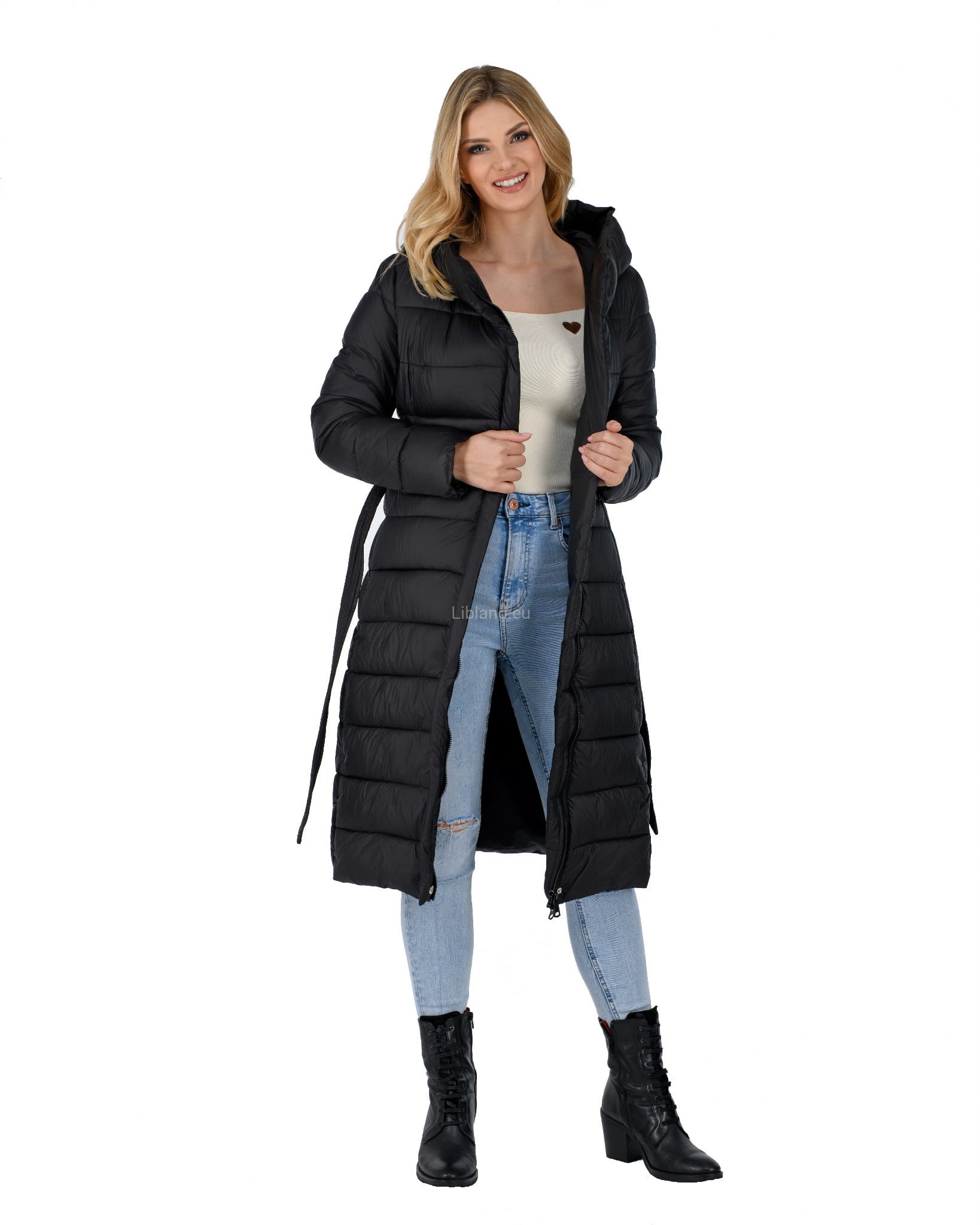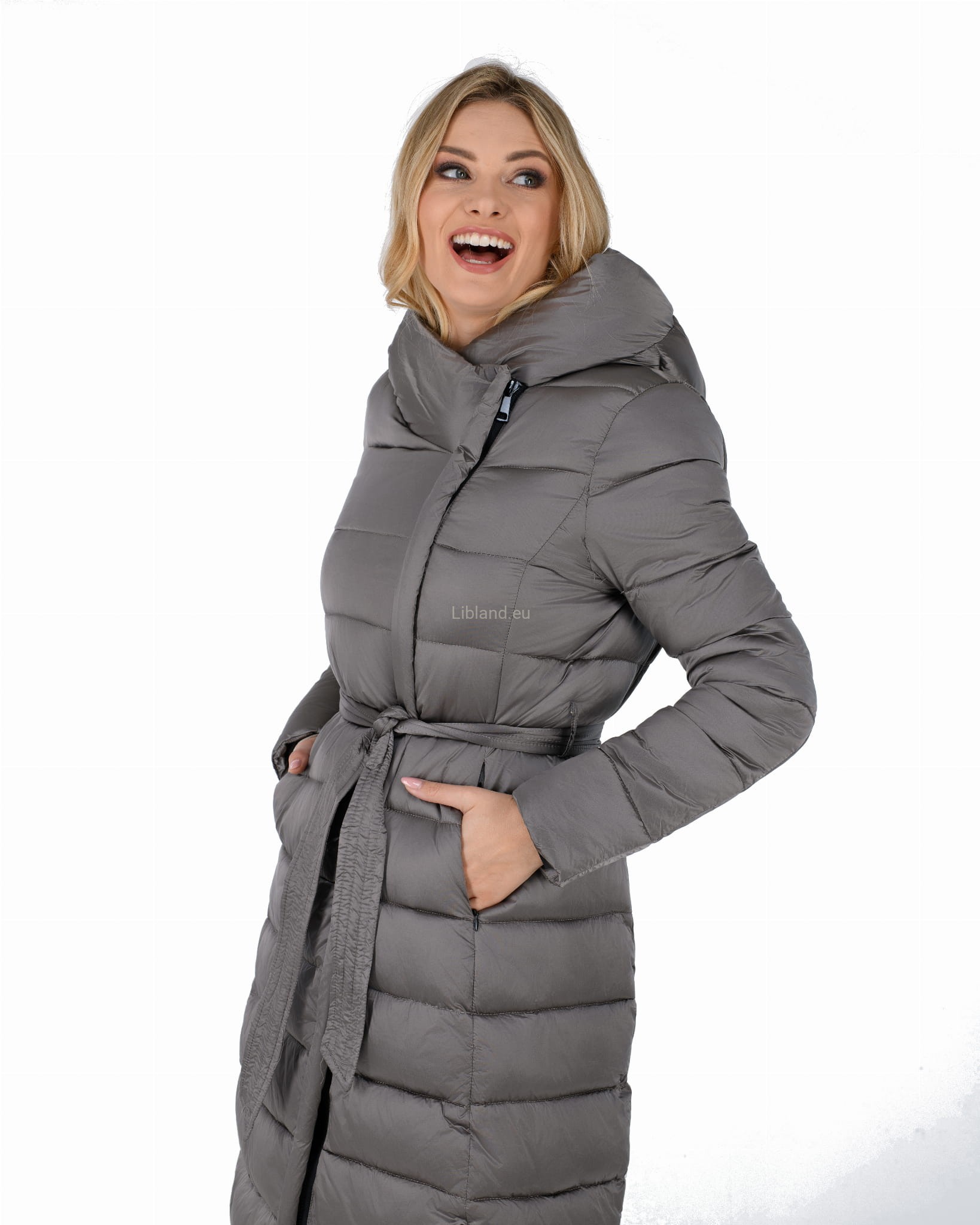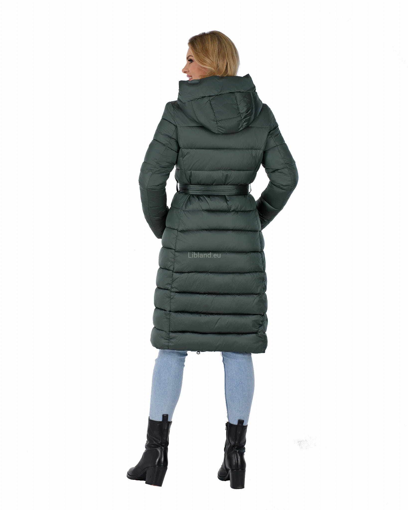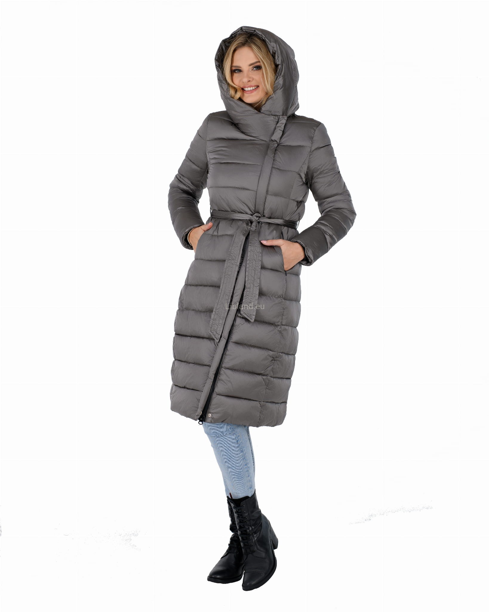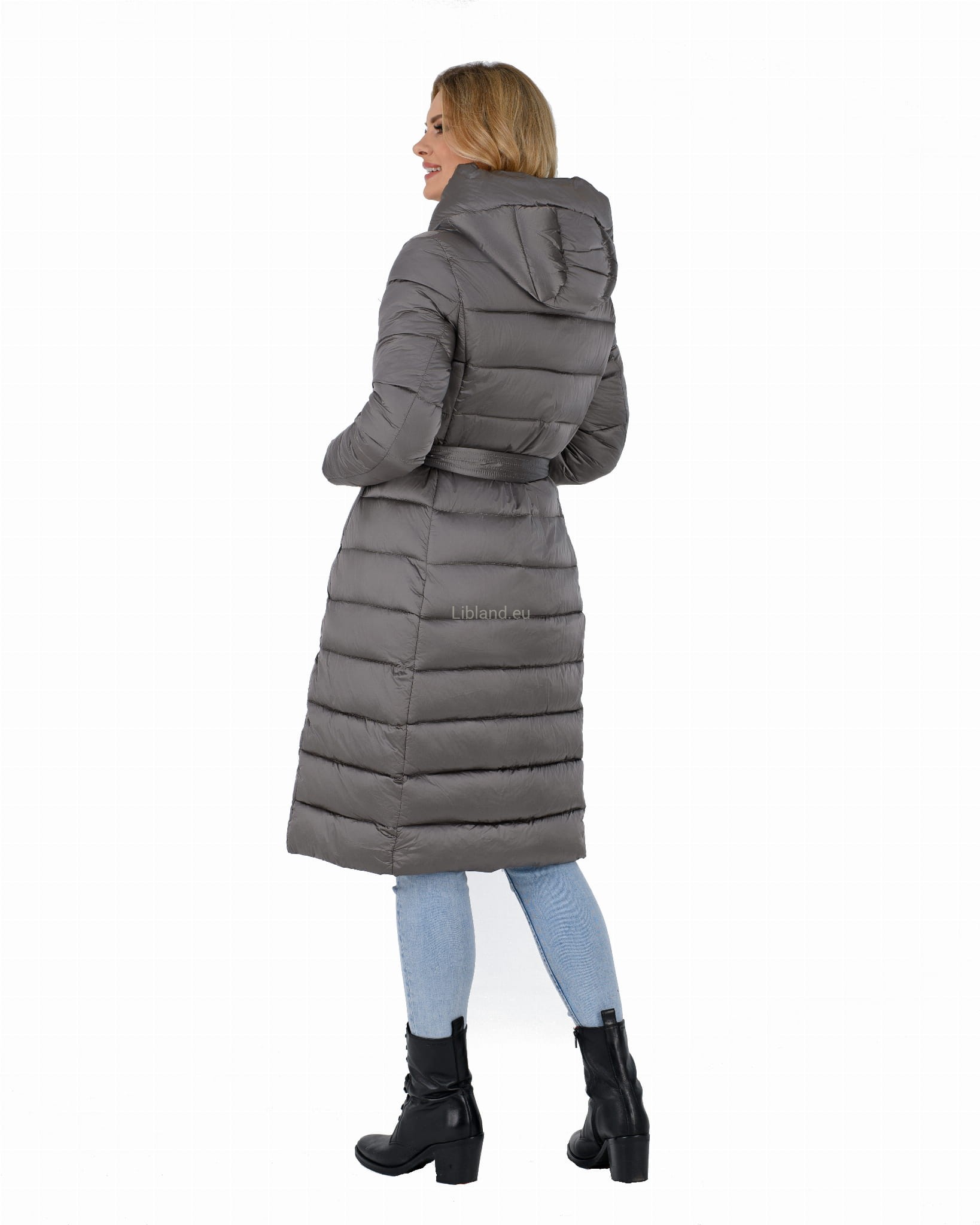 Ocieplany płaszcz damski zimowy z asymetrycznym zapięciem i paskiem zawiązywanym na przodzie.