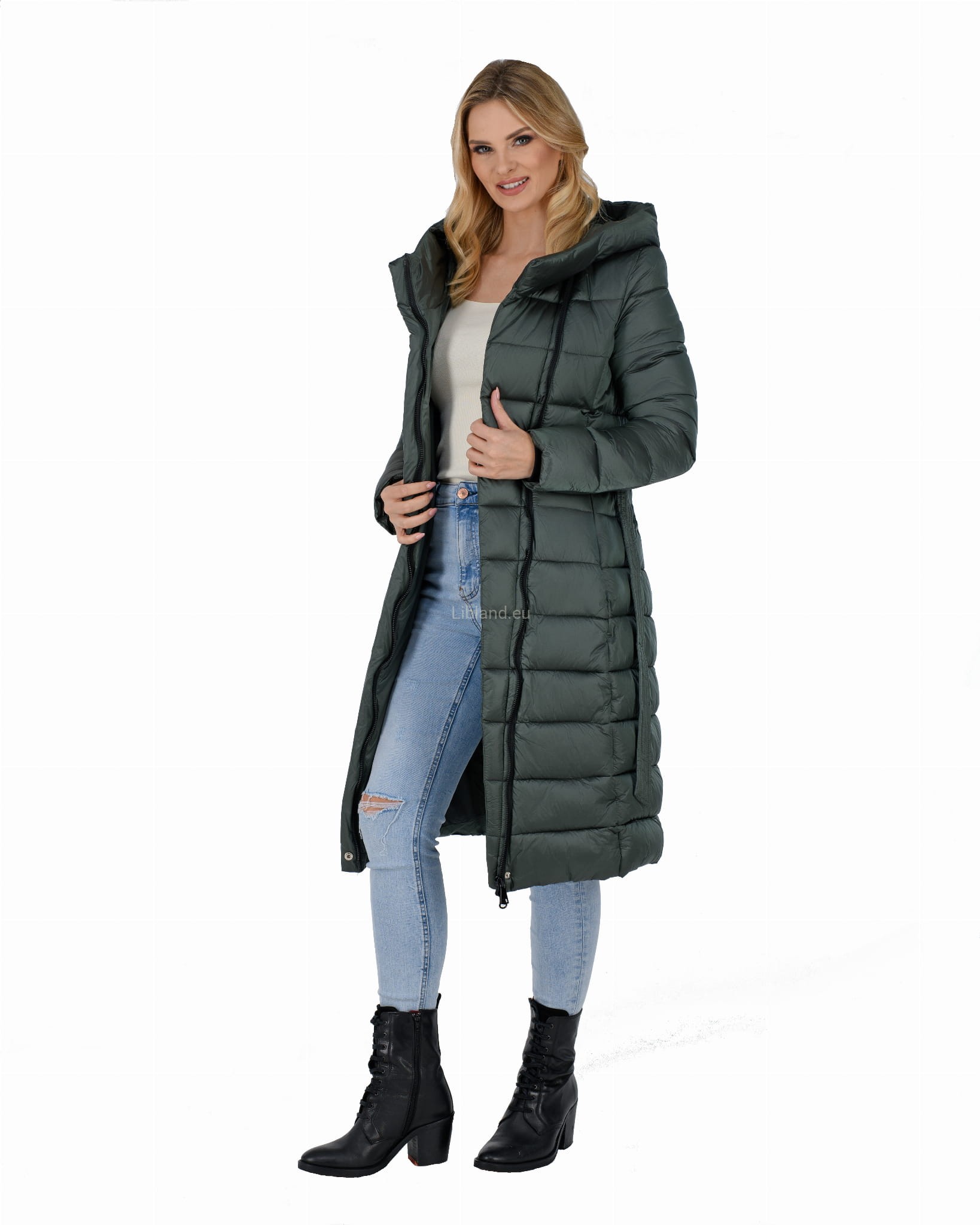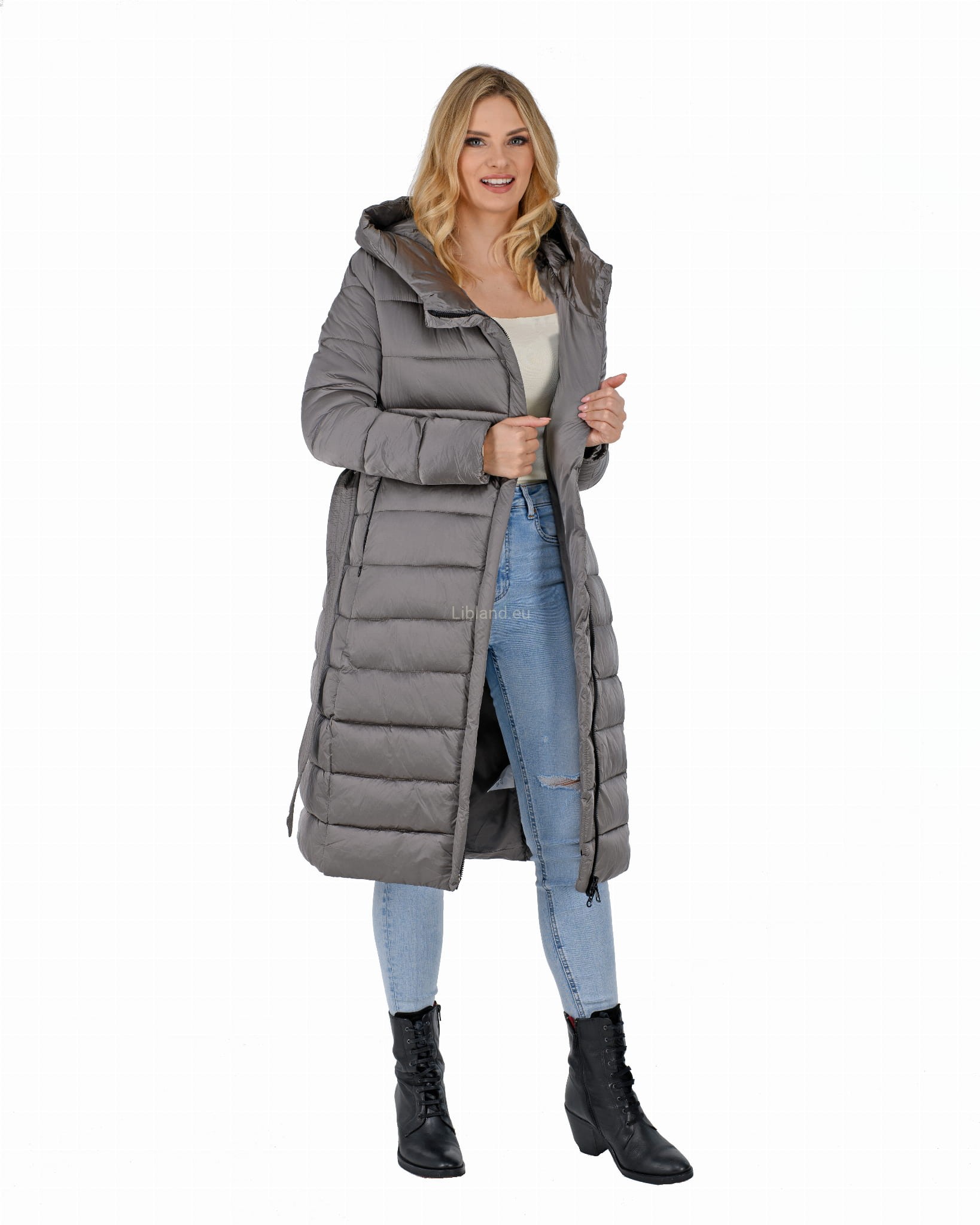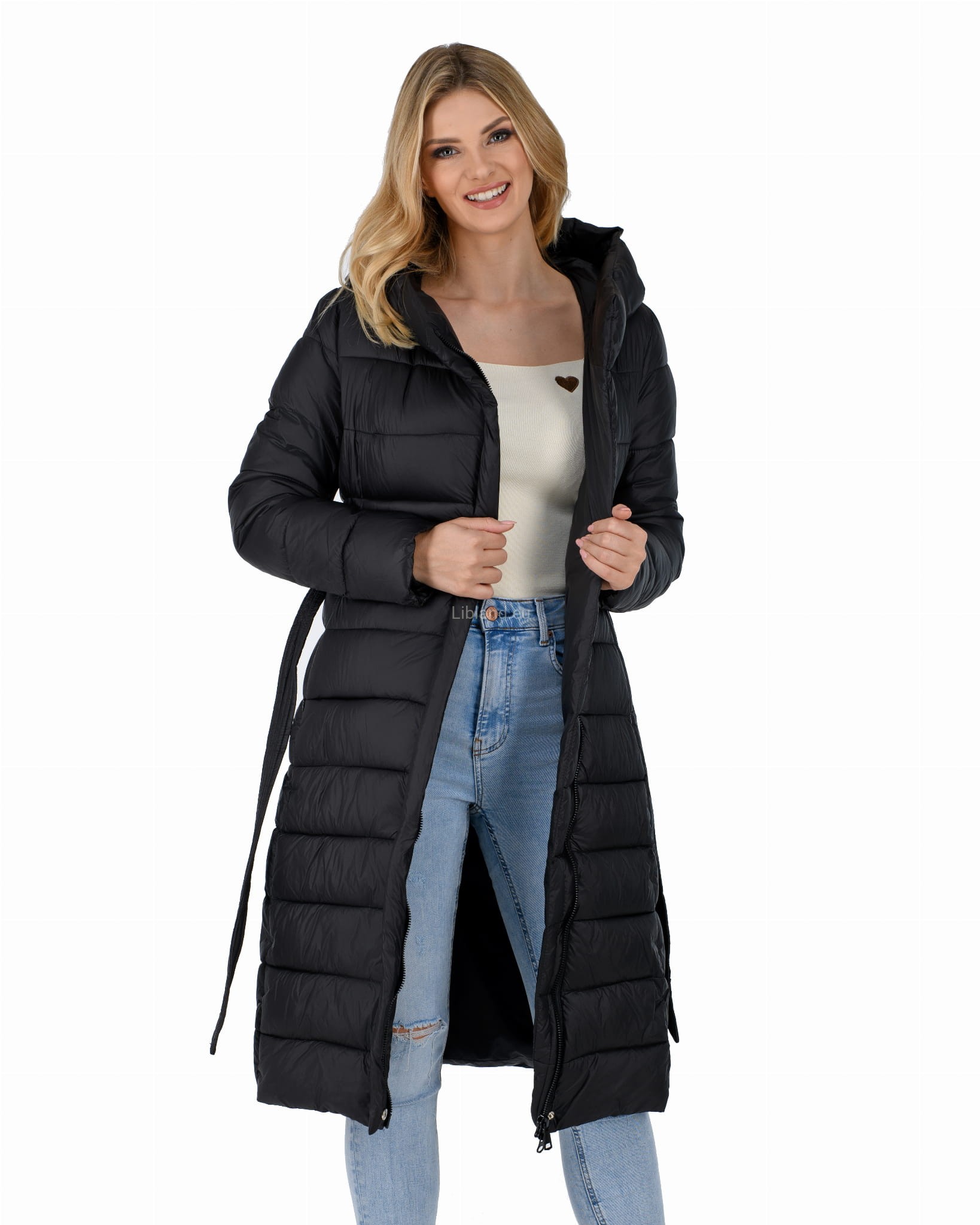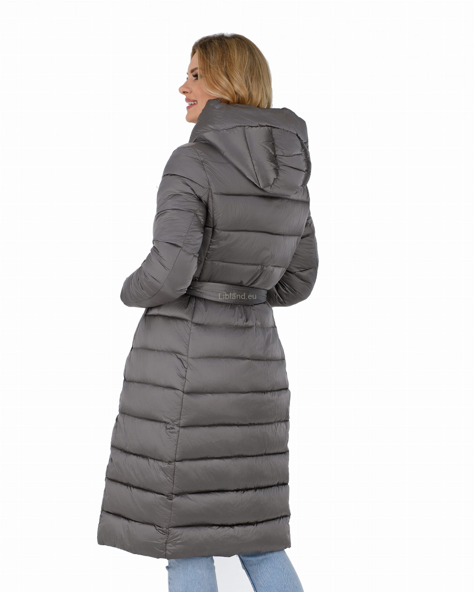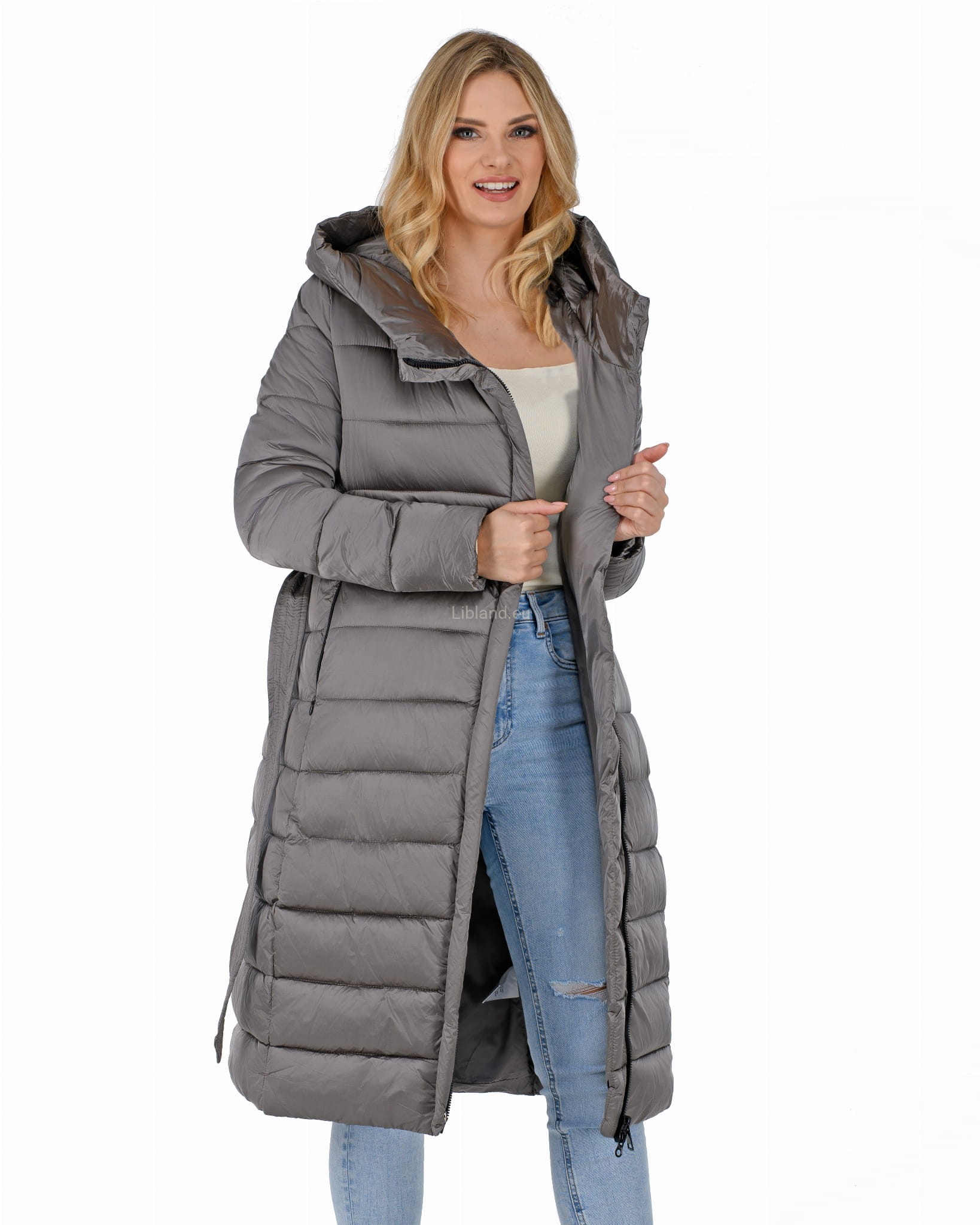 Ocieplany płaszcz damski zimowy z asymetrycznym zapięciem i paskiem zawiązywanym na przodzie.