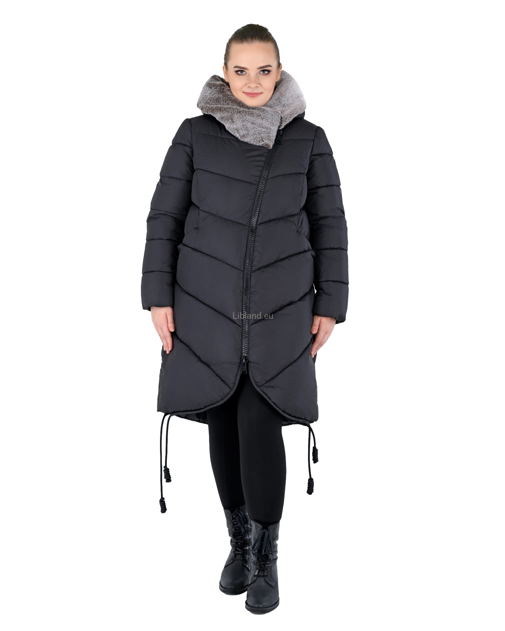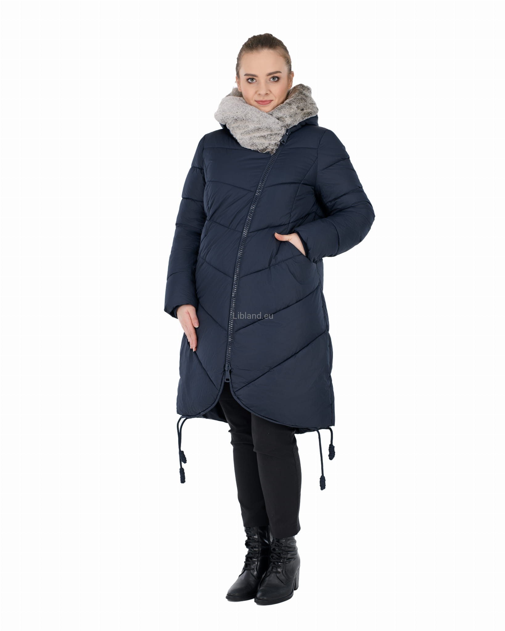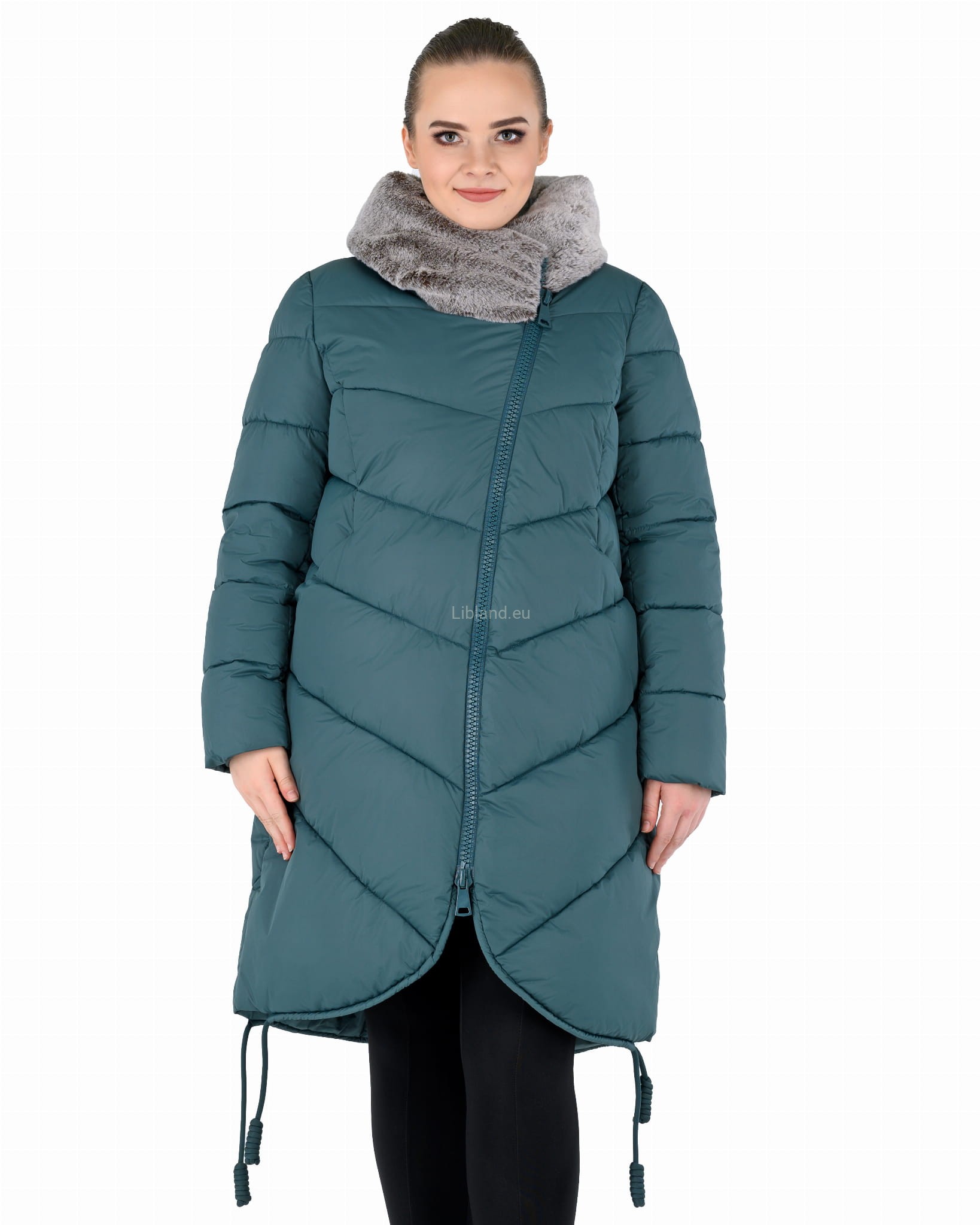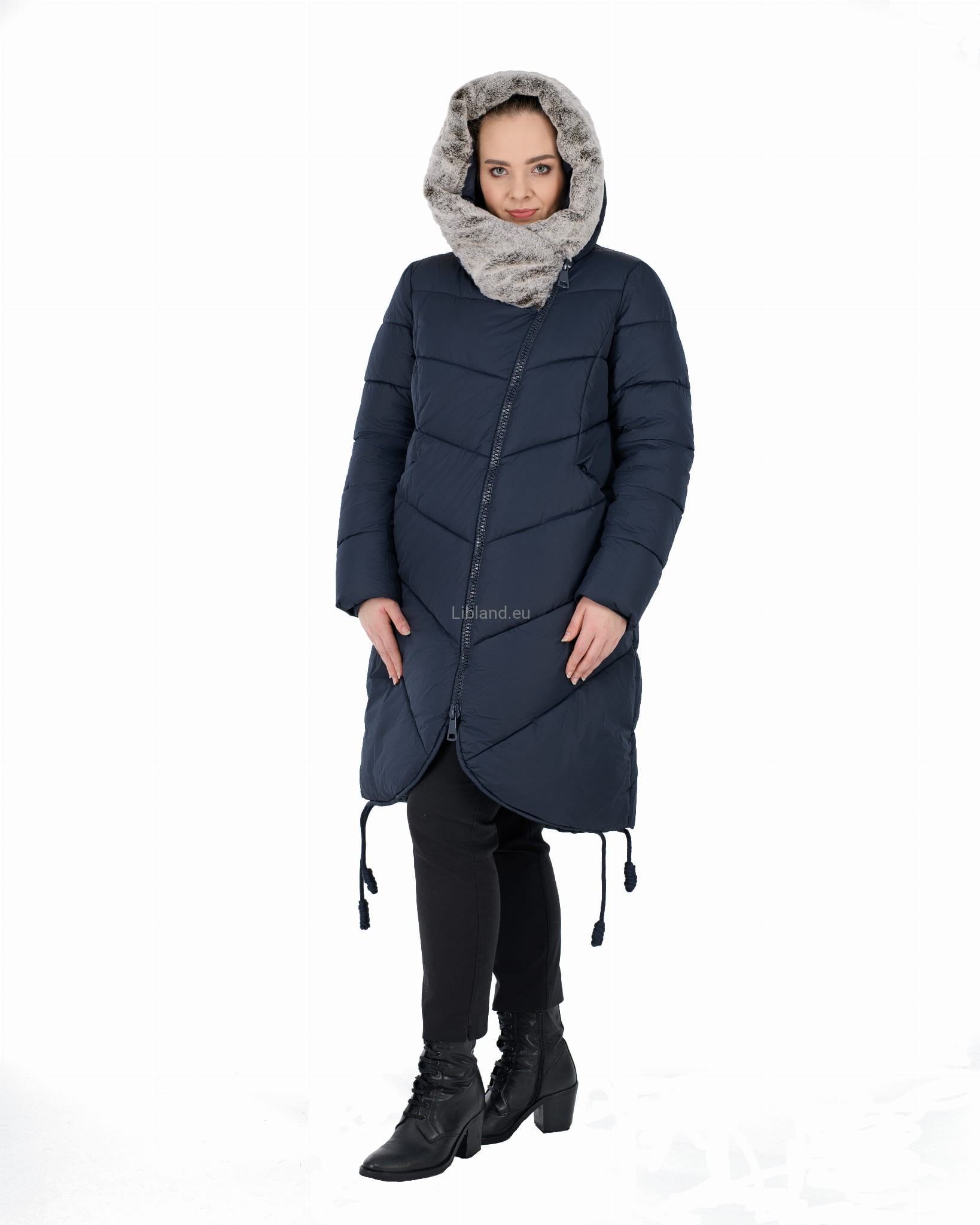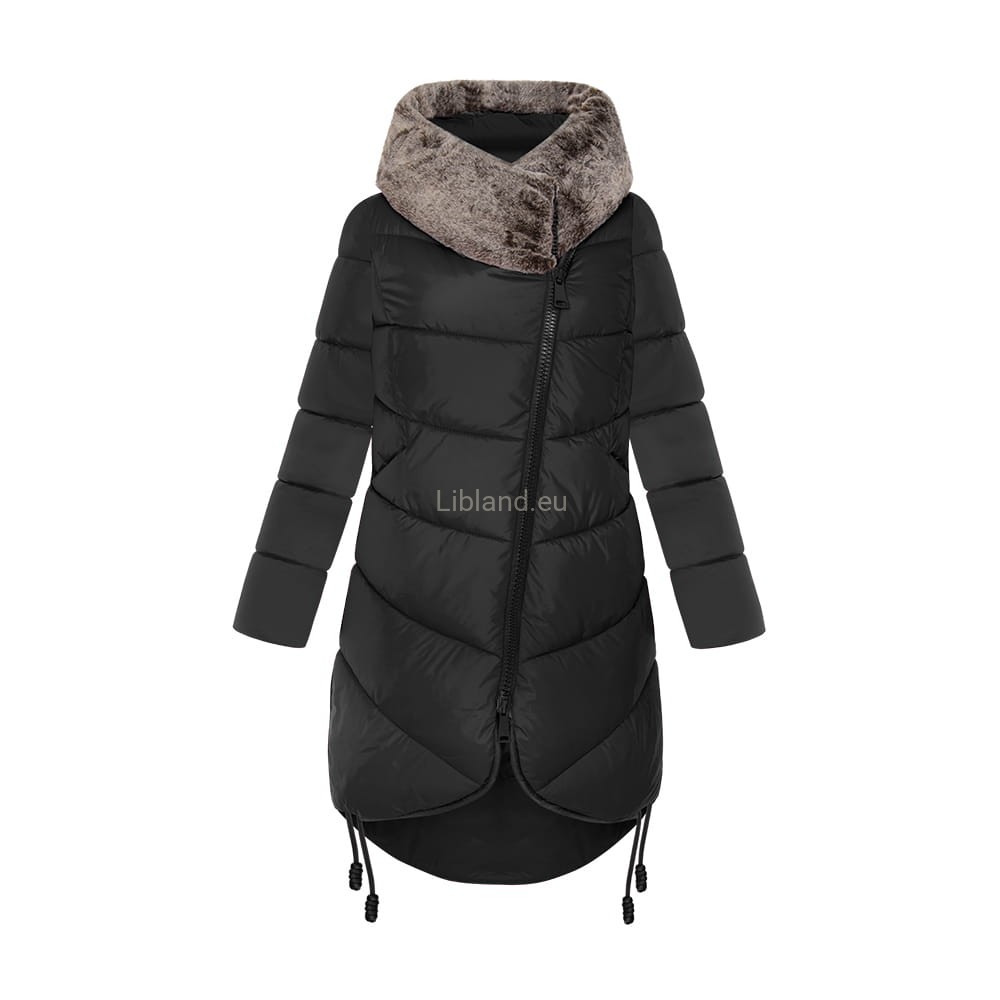 Ocieplany damski płaszcz zimowy z futrzanym kołnierzem i ozdobnym asymetrycznym suwakiem rozsuwanym od dołu i od góry.