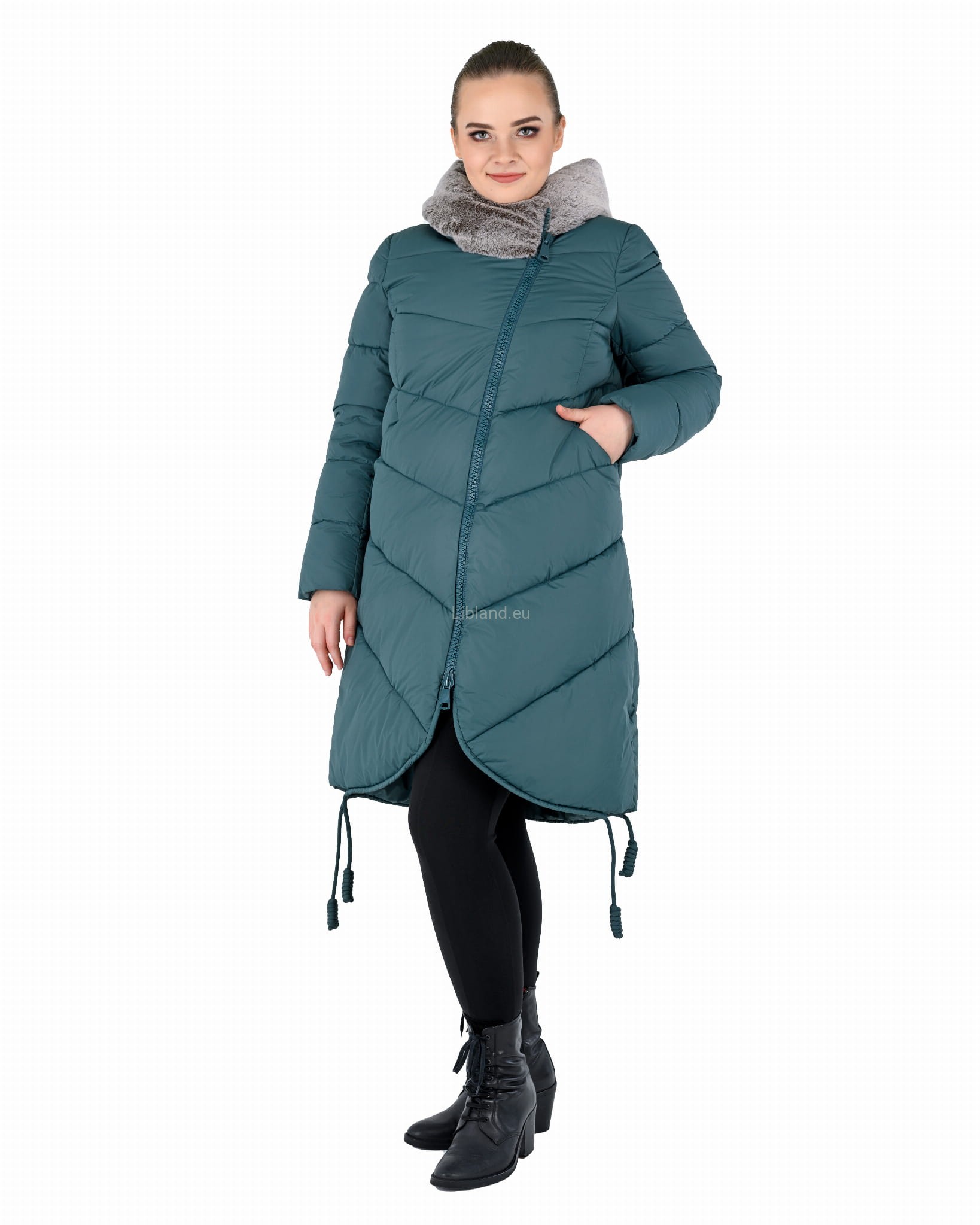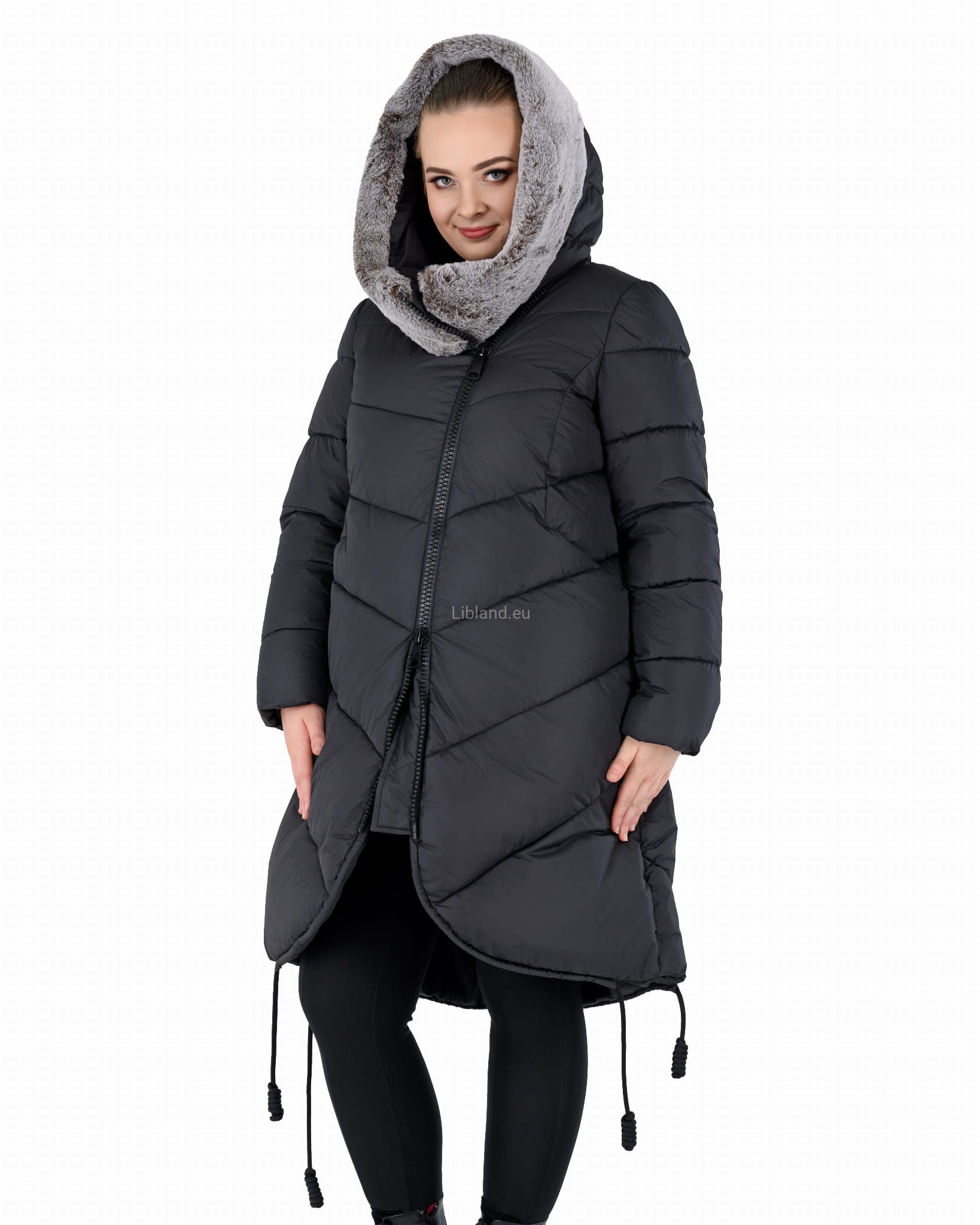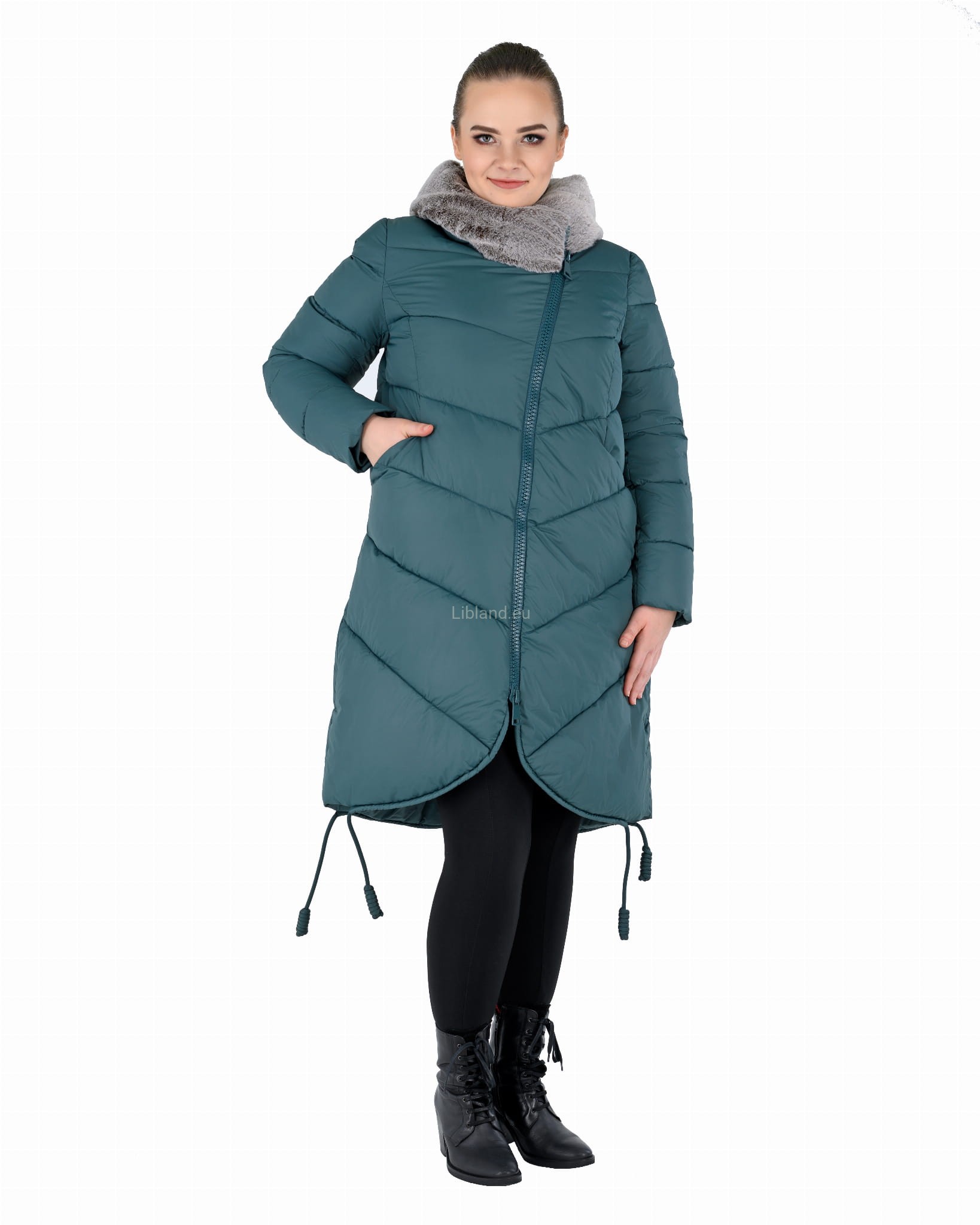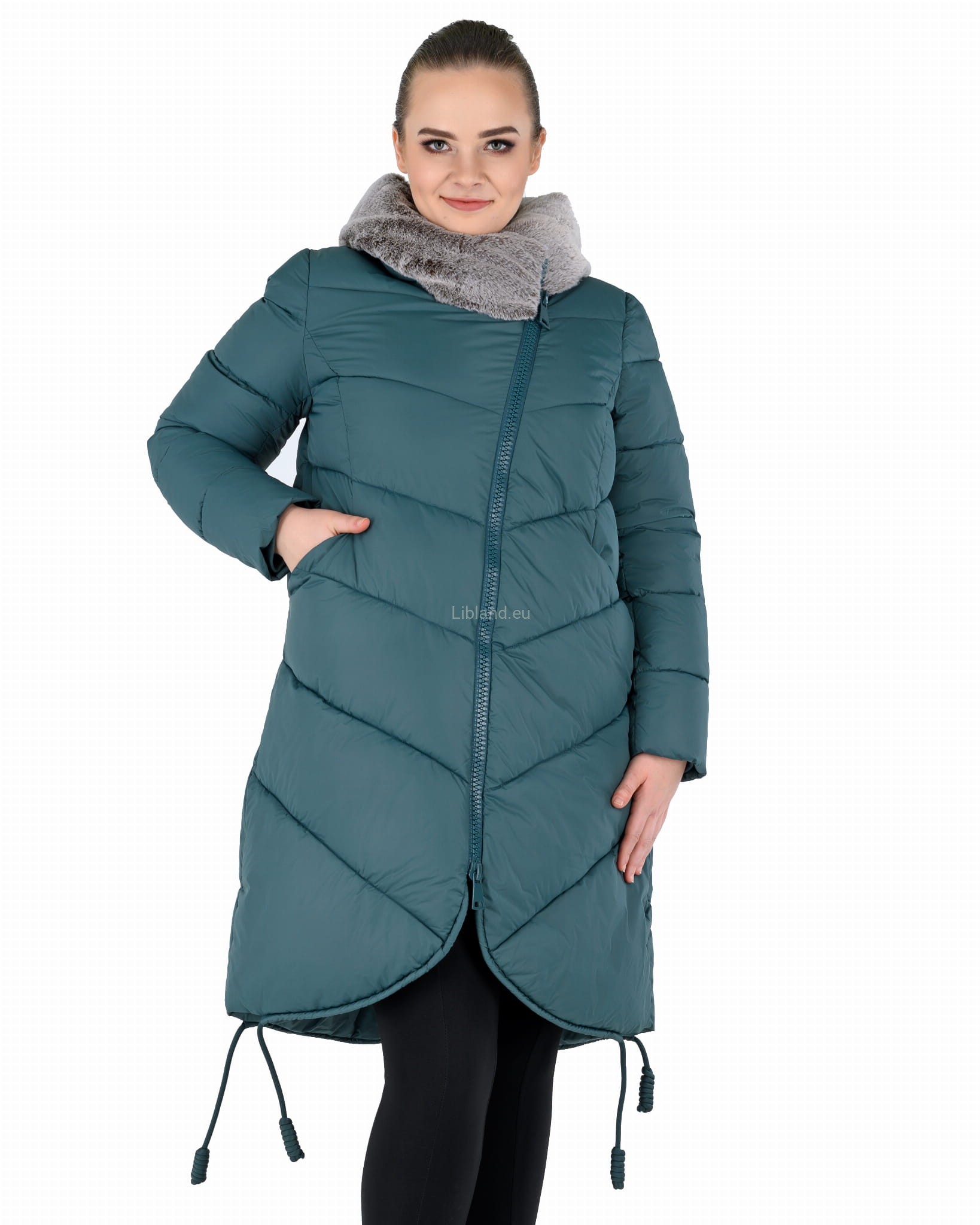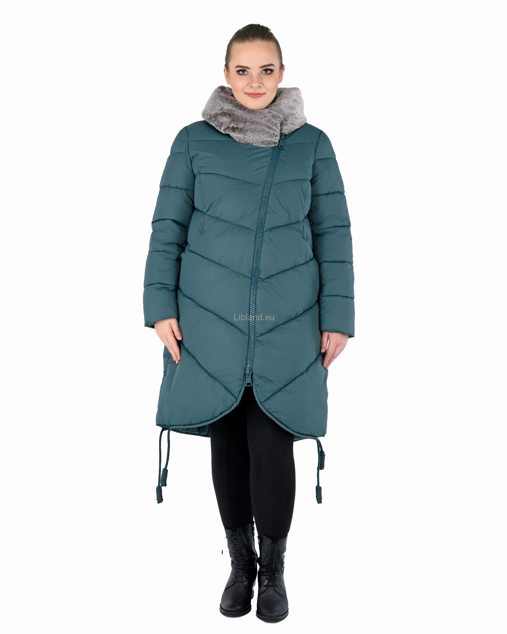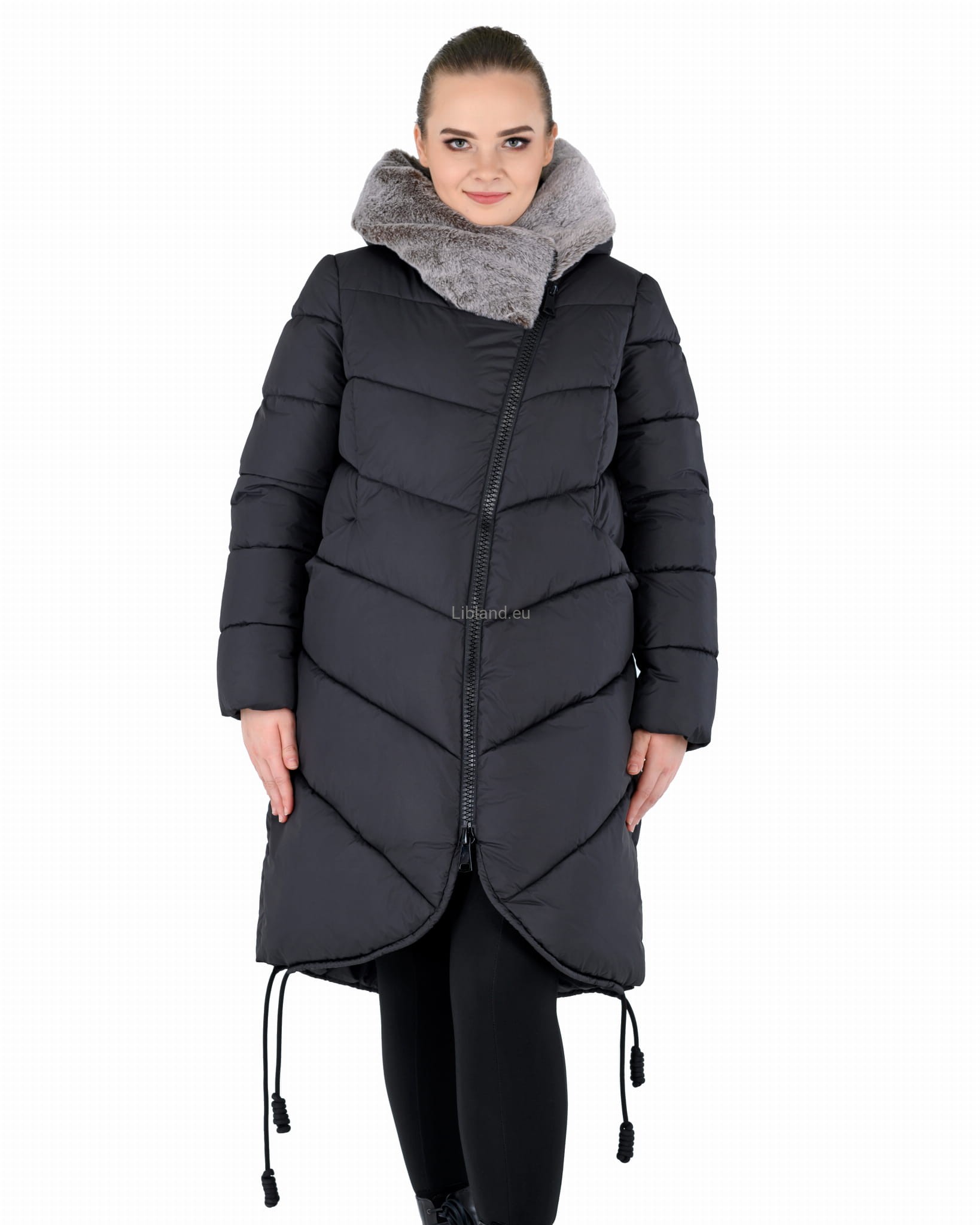 Ocieplany damski płaszcz zimowy z futrzanym kołnierzem i ozdobnym asymetrycznym suwakiem rozsuwanym od dołu i od góry.