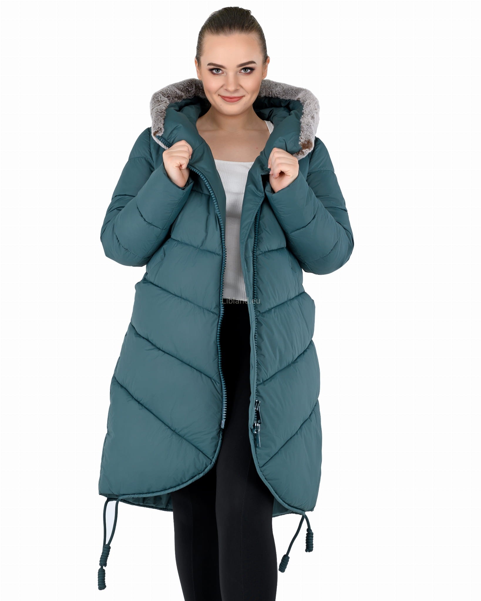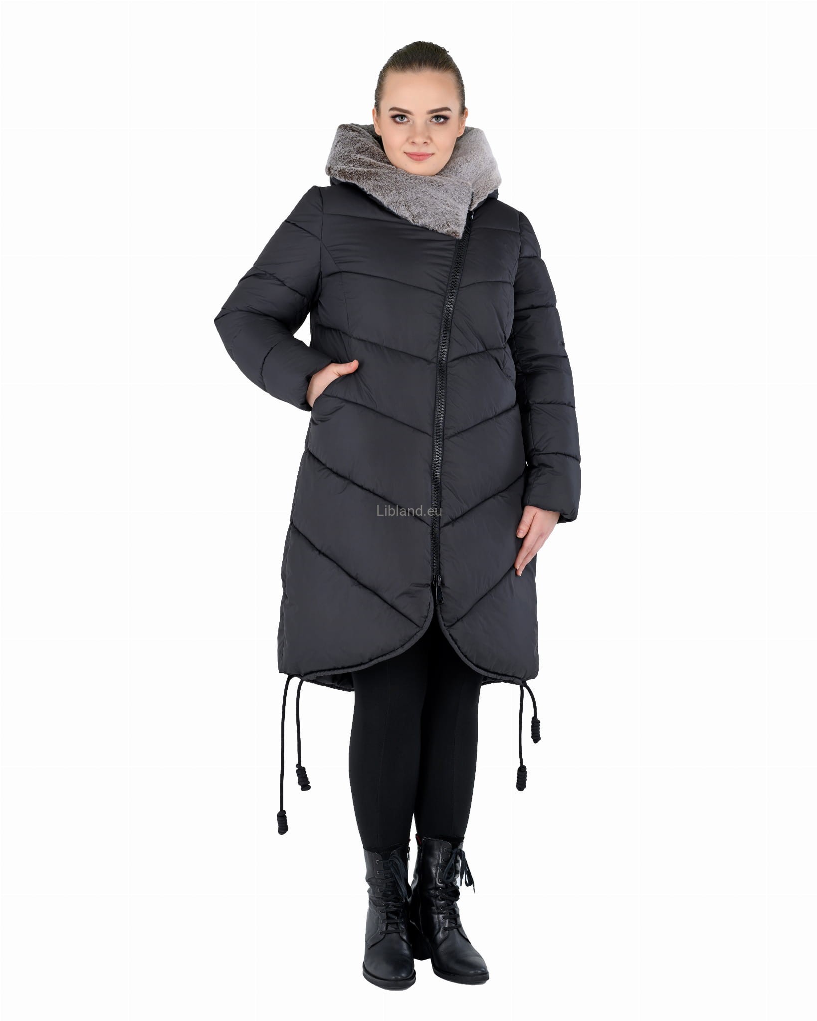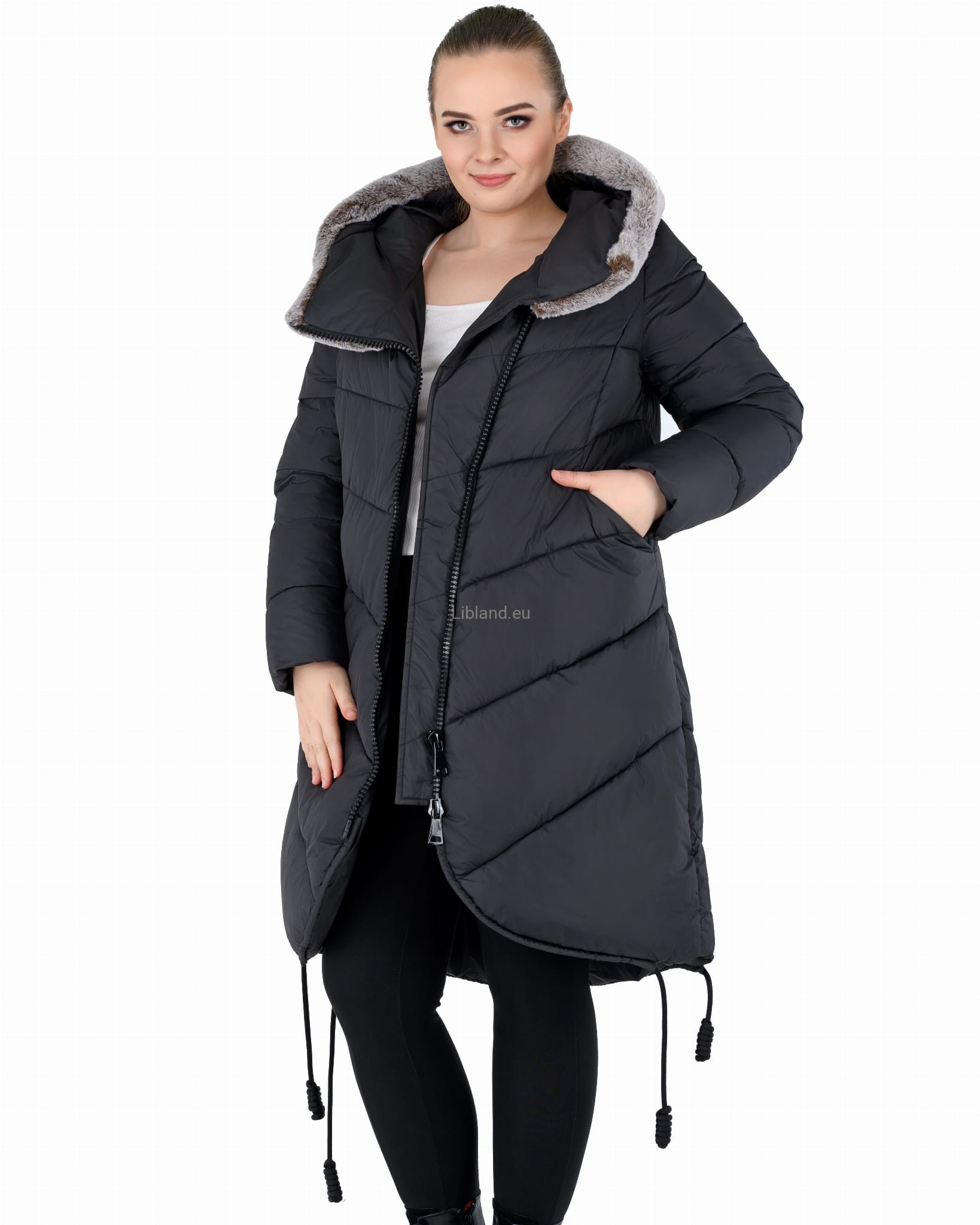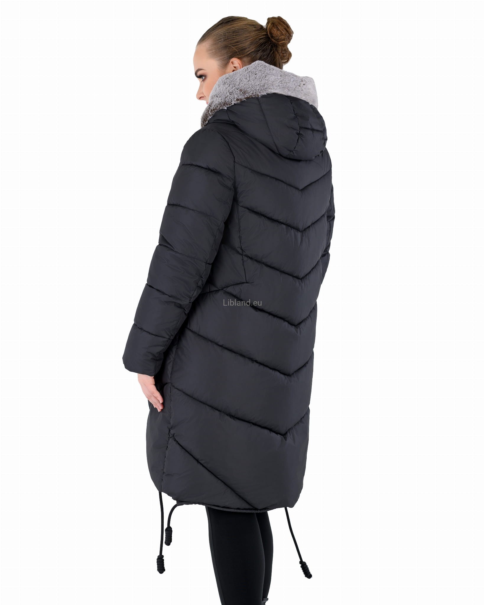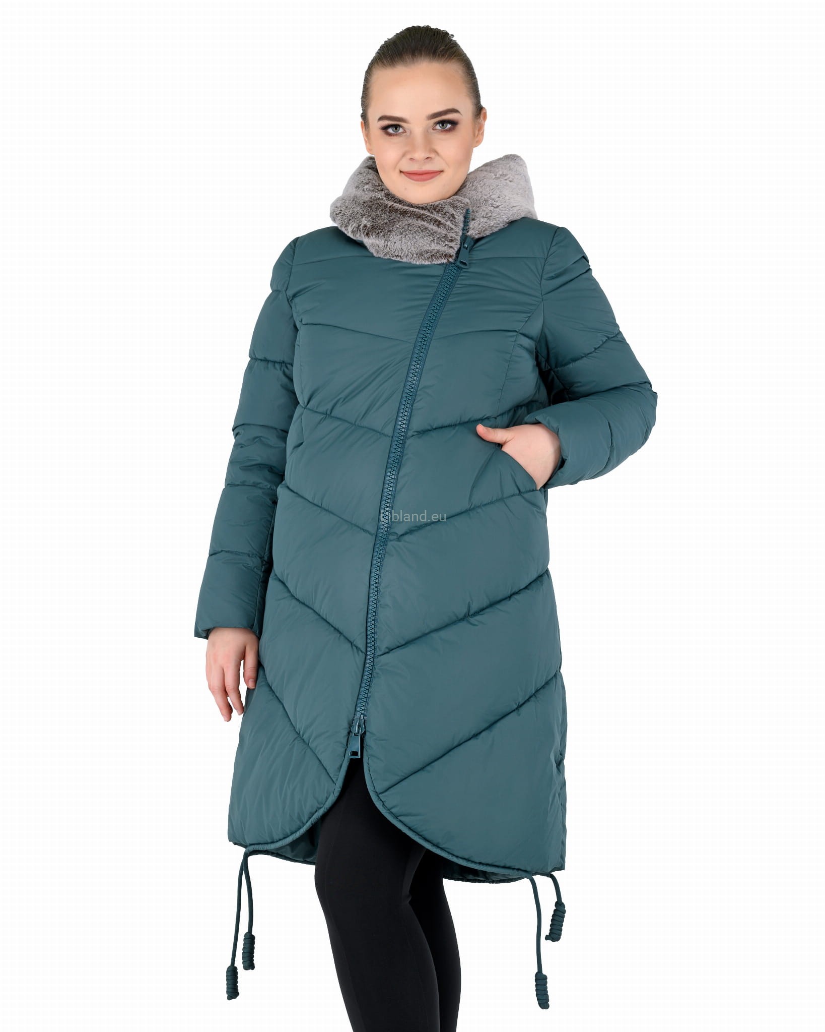 Ocieplany damski płaszcz zimowy z futrzanym kołnierzem i ozdobnym asymetrycznym suwakiem rozsuwanym od dołu i od góry.