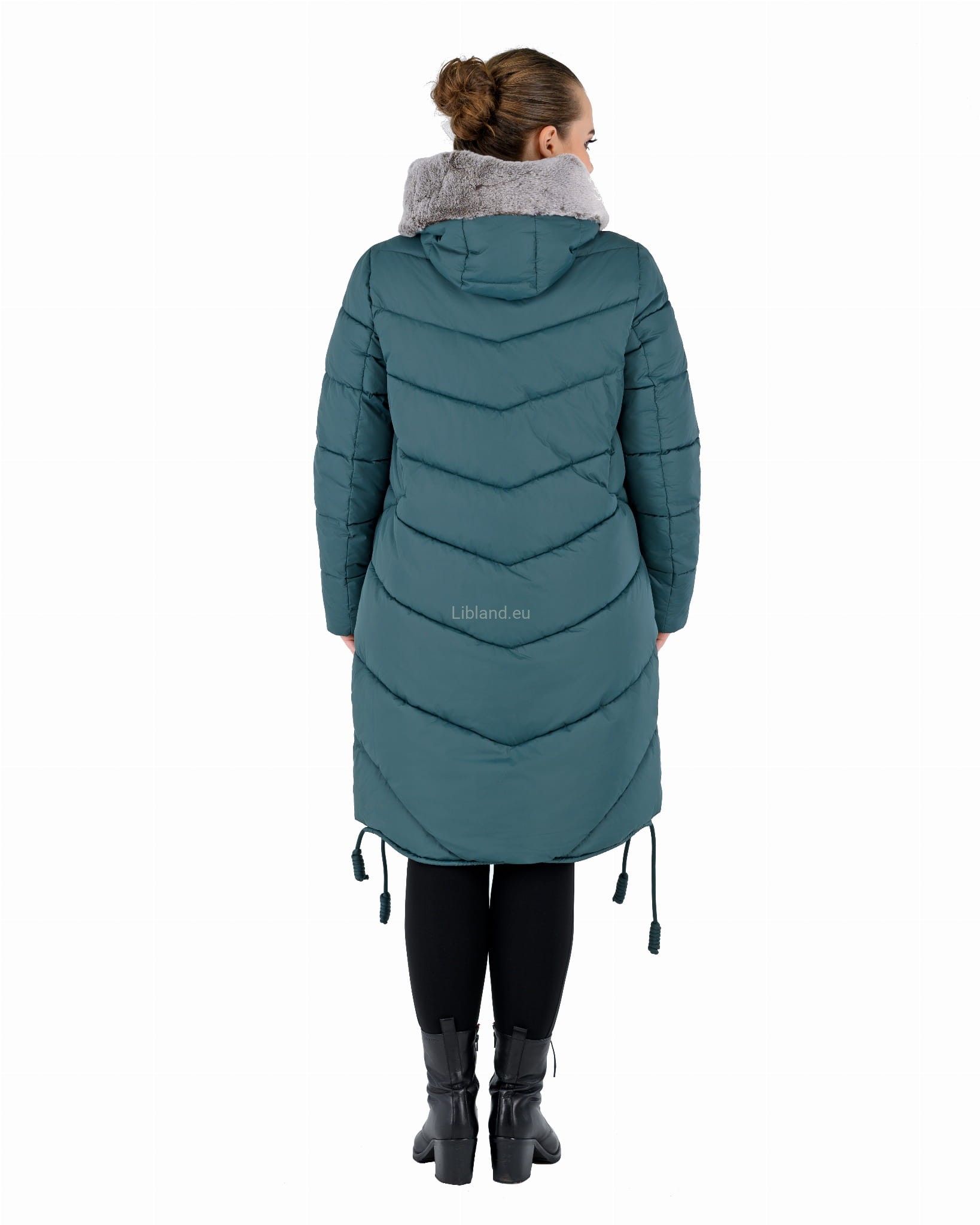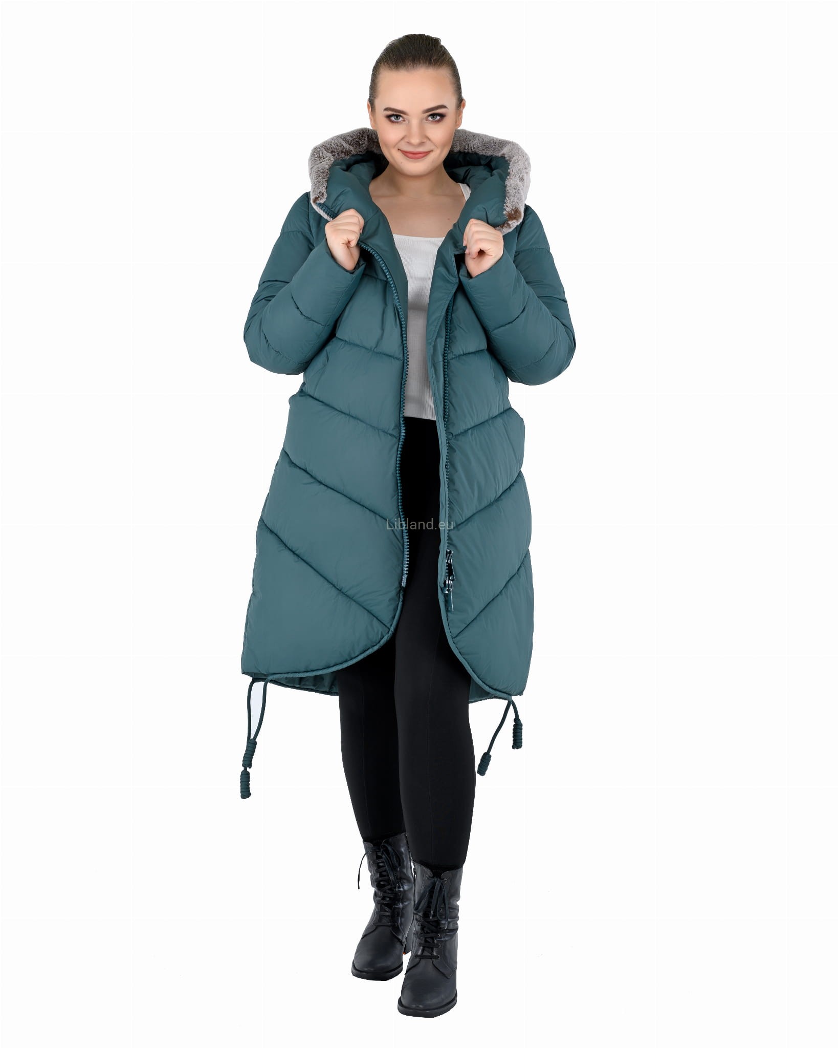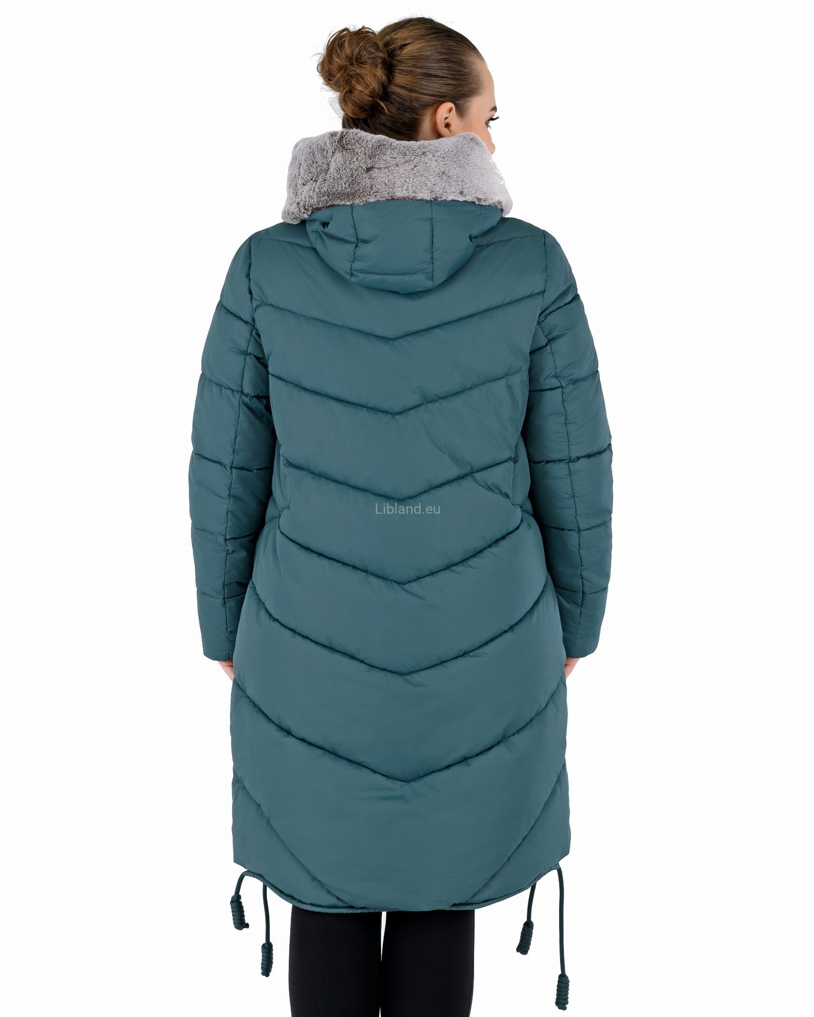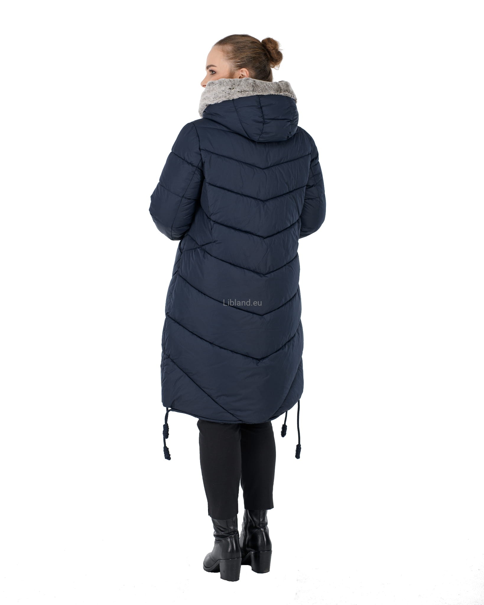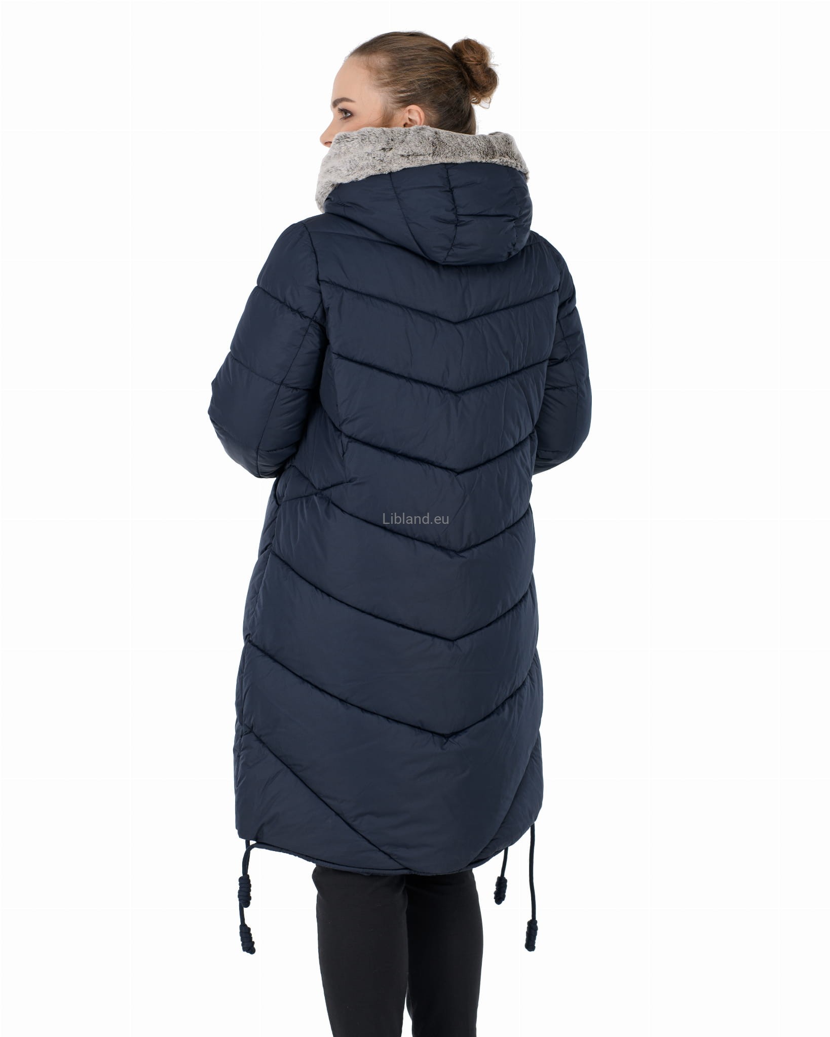 Ocieplany damski płaszcz zimowy z futrzanym kołnierzem i ozdobnym asymetrycznym suwakiem rozsuwanym od dołu i od góry.