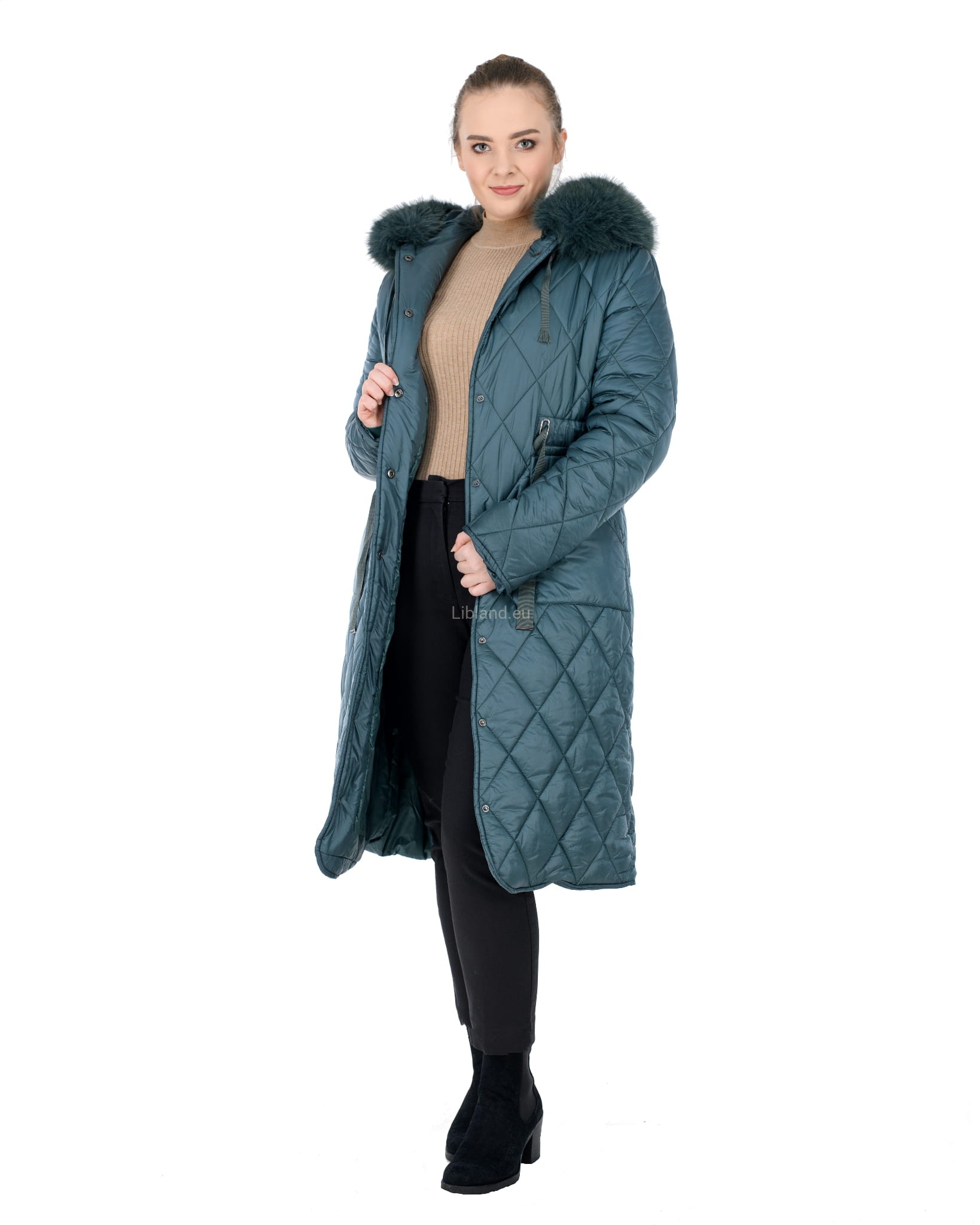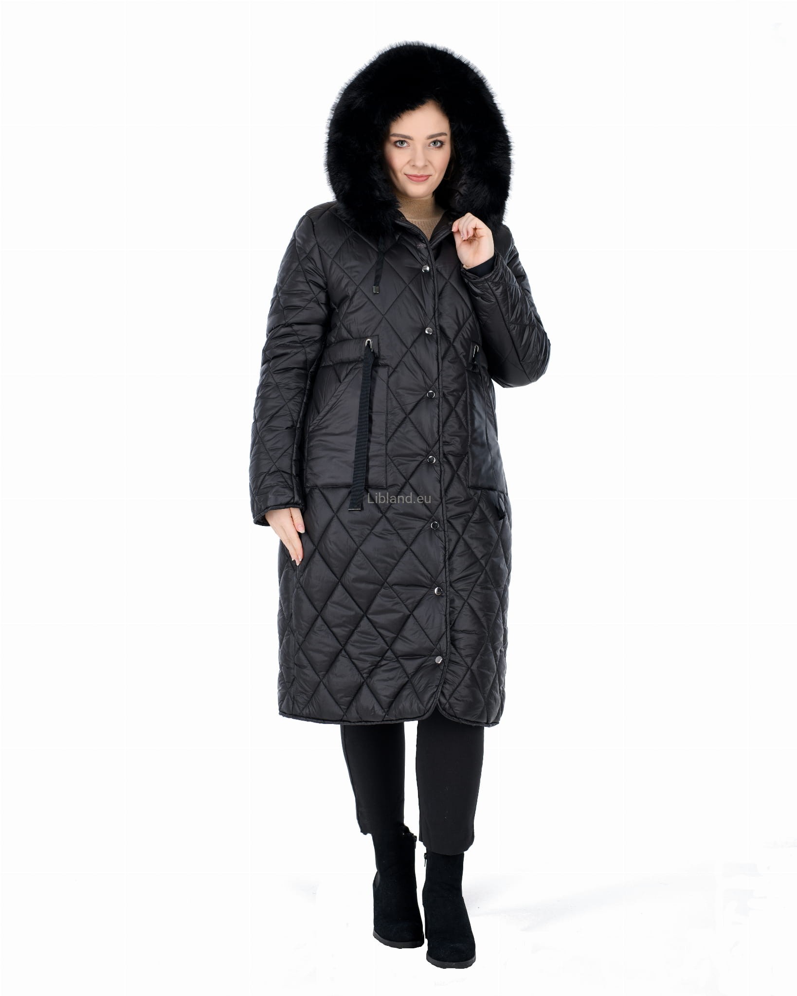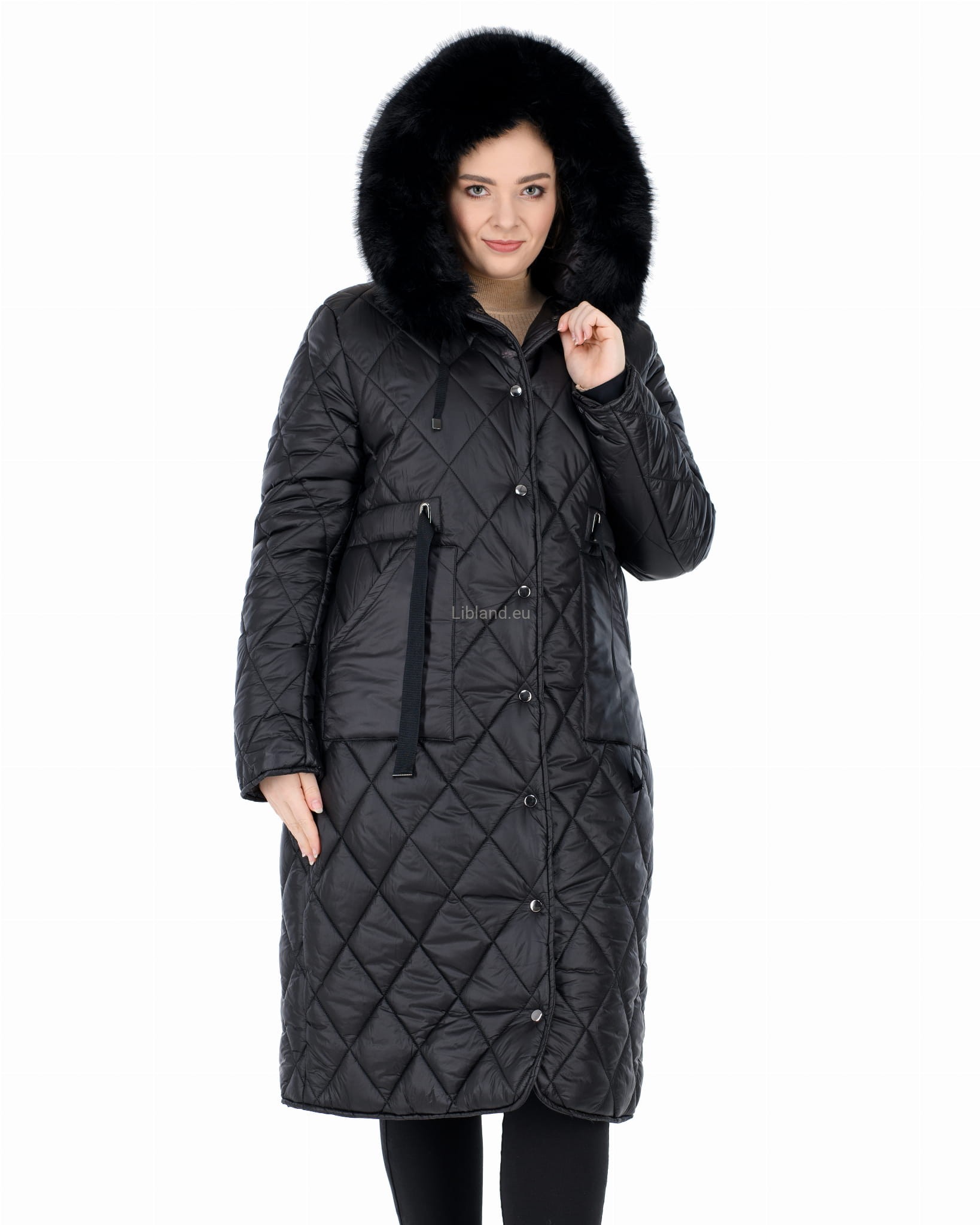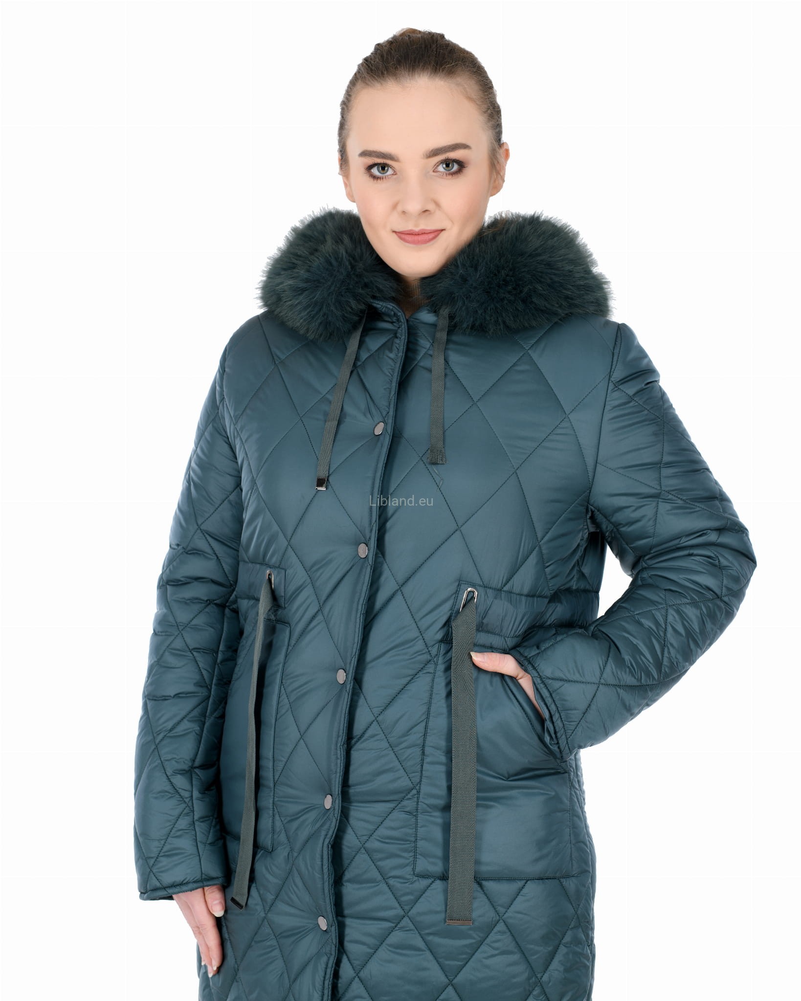 Ocieplany damski płaszcz zimowy z kapturem obszytym futrem i krytym paskiem w talii.