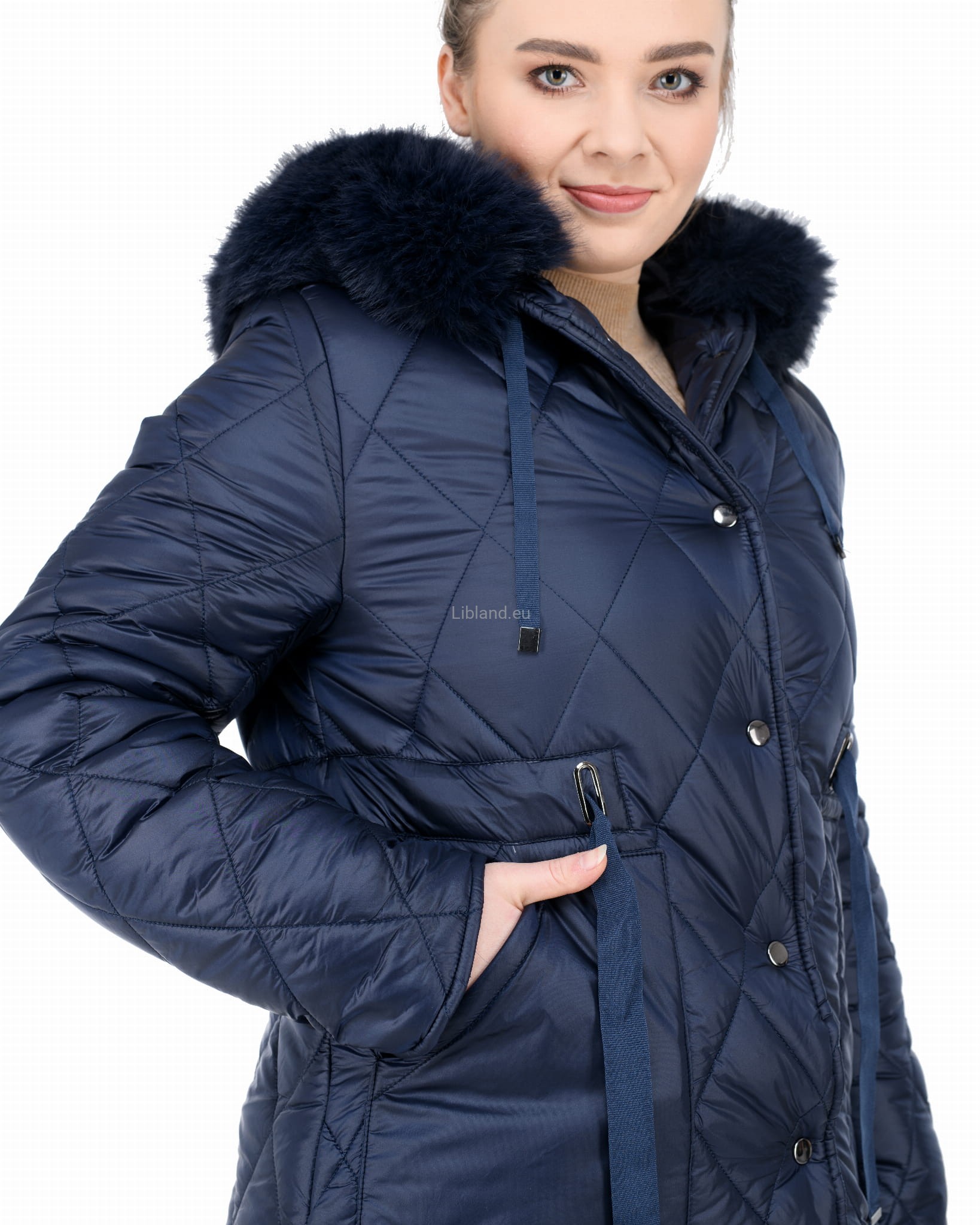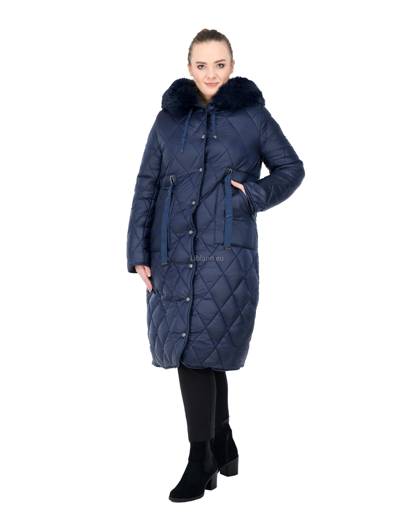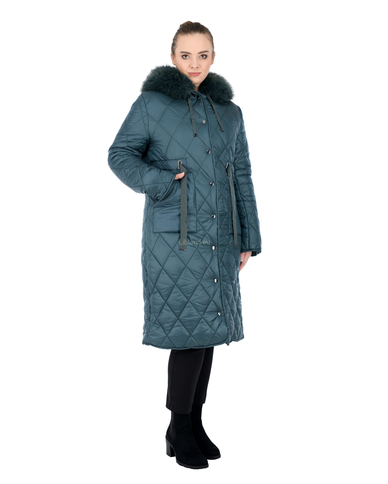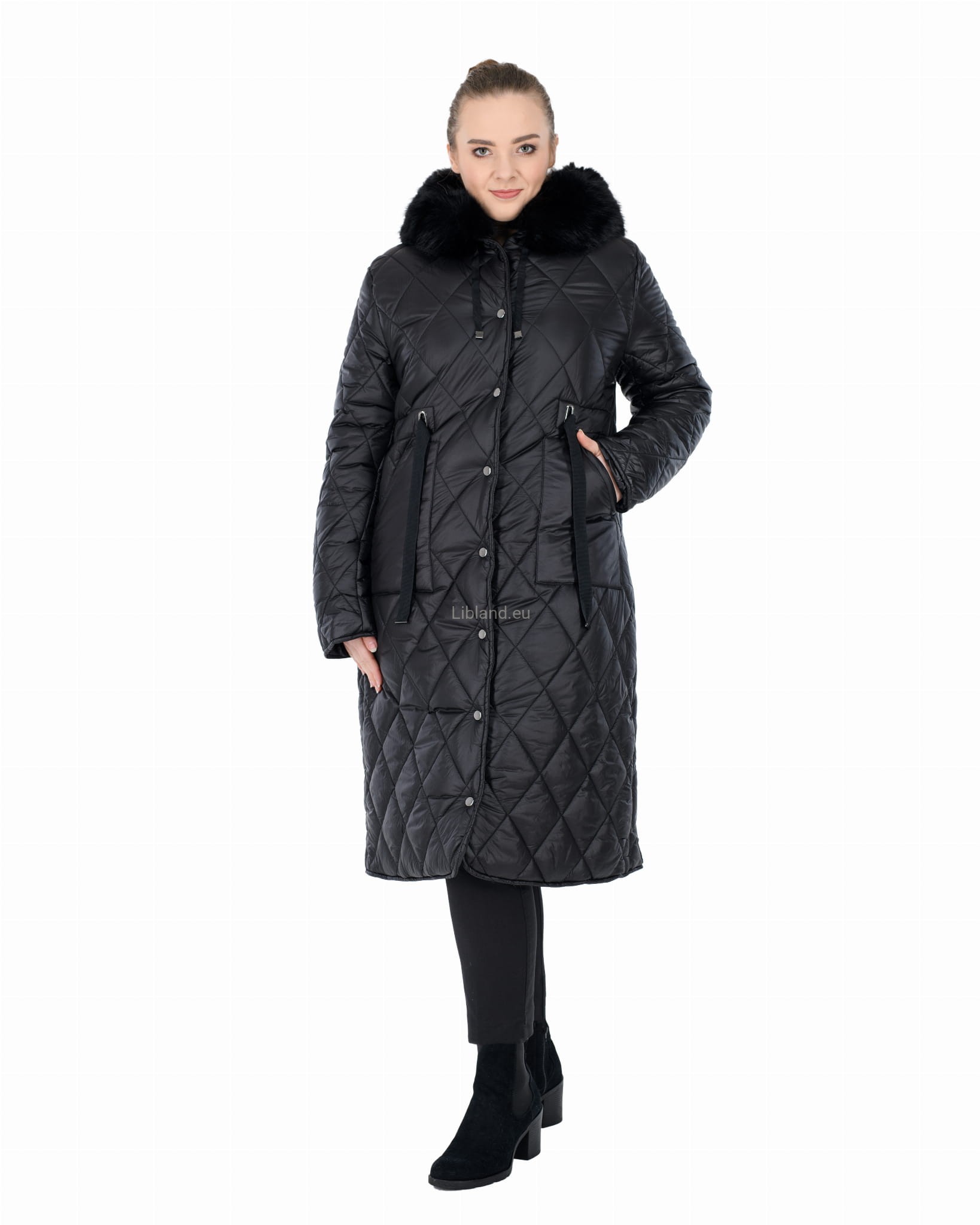 Ocieplany damski płaszcz zimowy z kapturem obszytym futrem i krytym paskiem w talii.