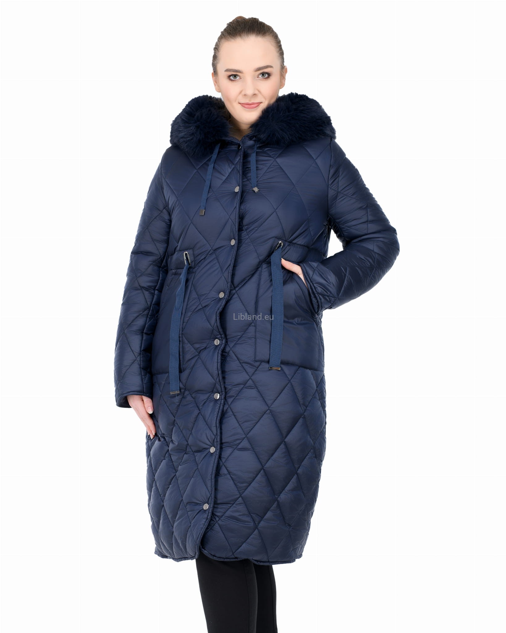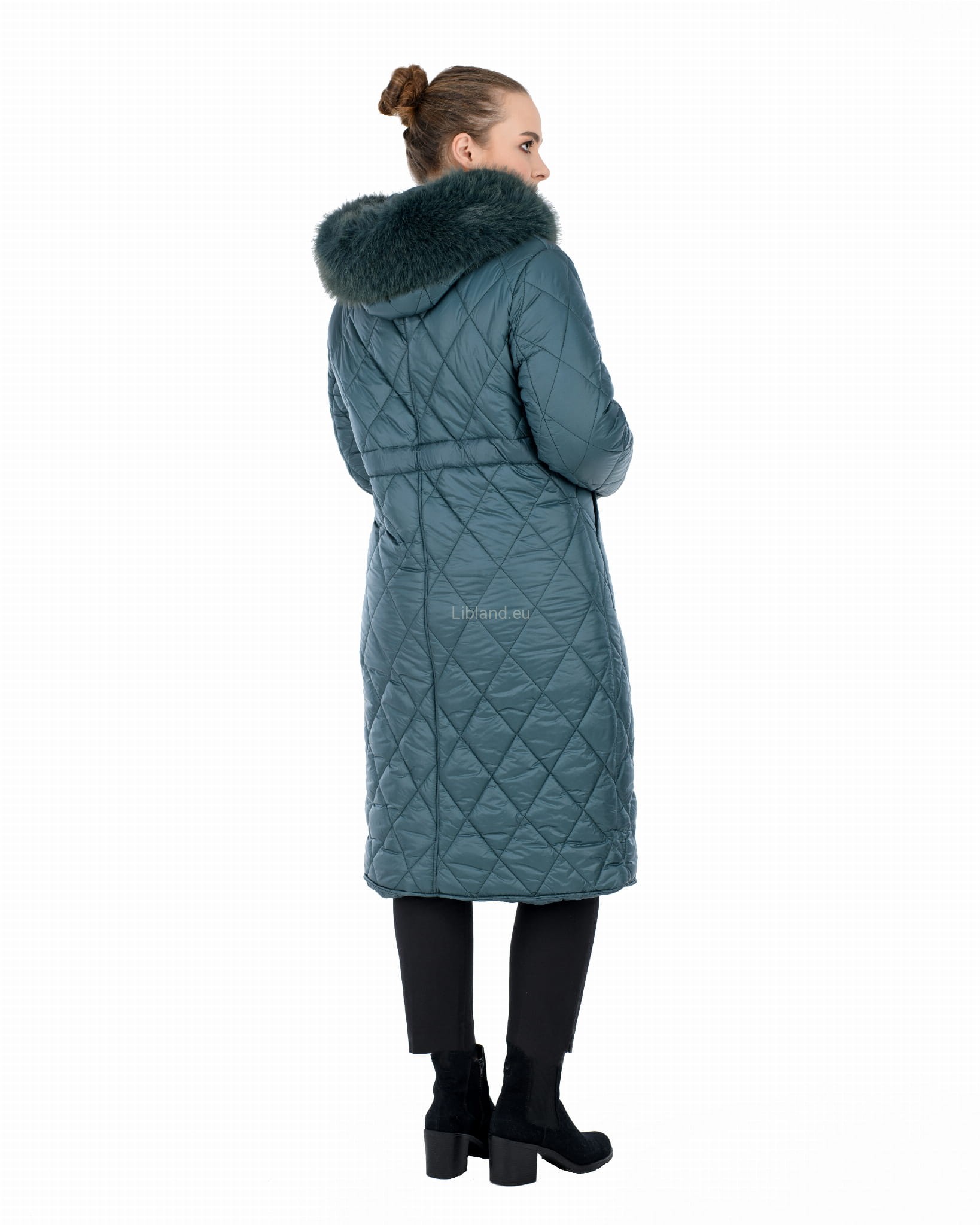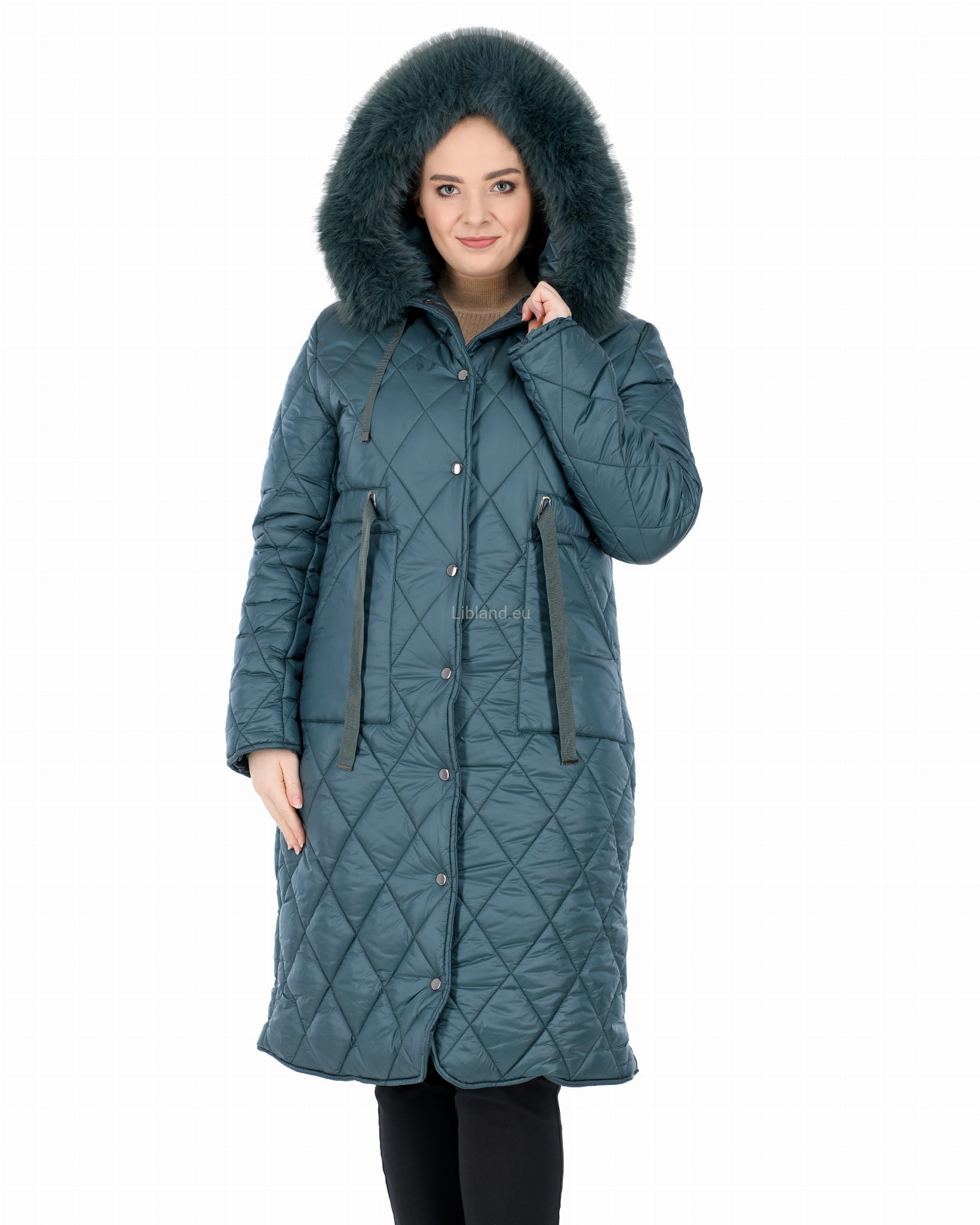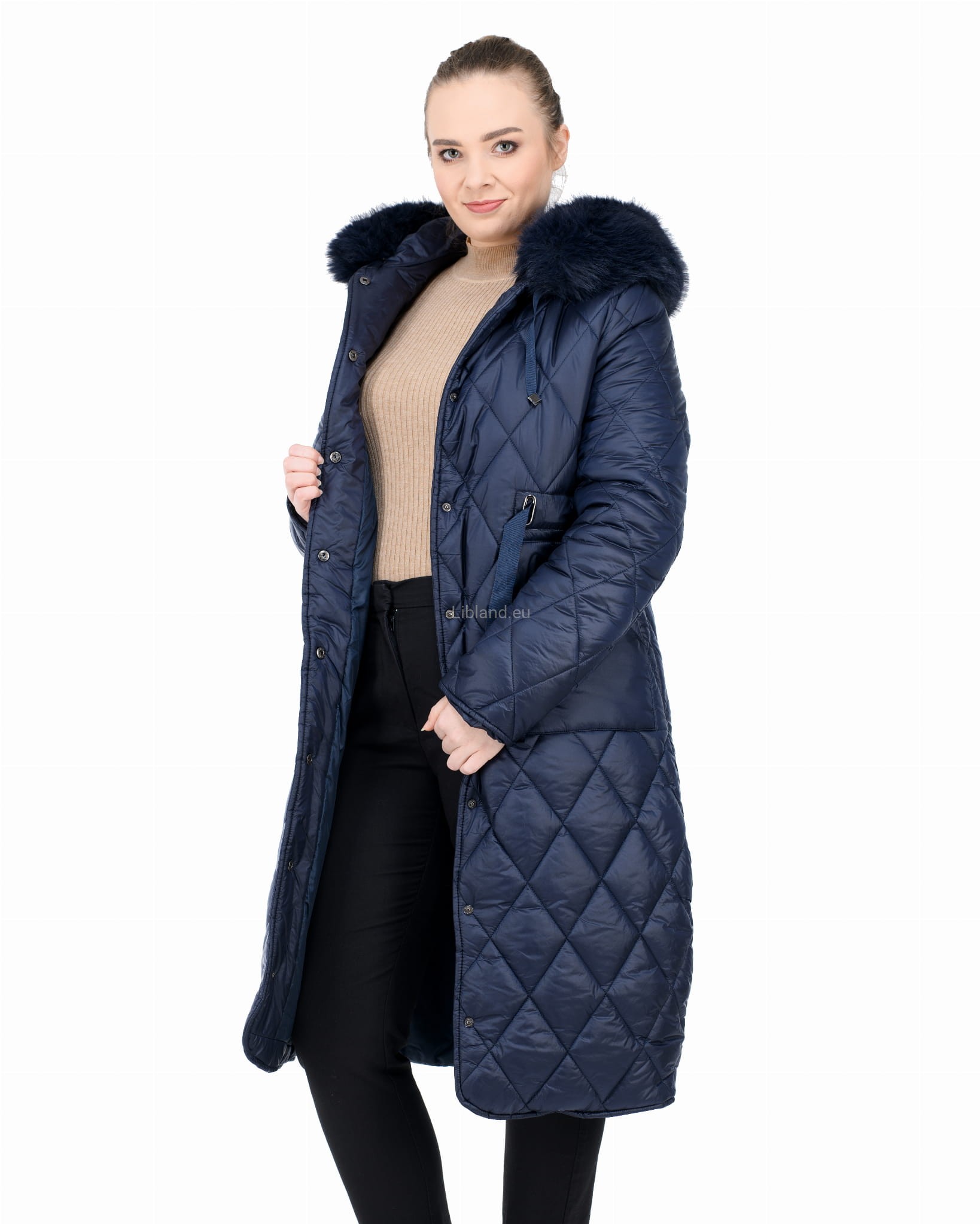 Ocieplany damski płaszcz zimowy z kapturem obszytym futrem i krytym paskiem w talii.