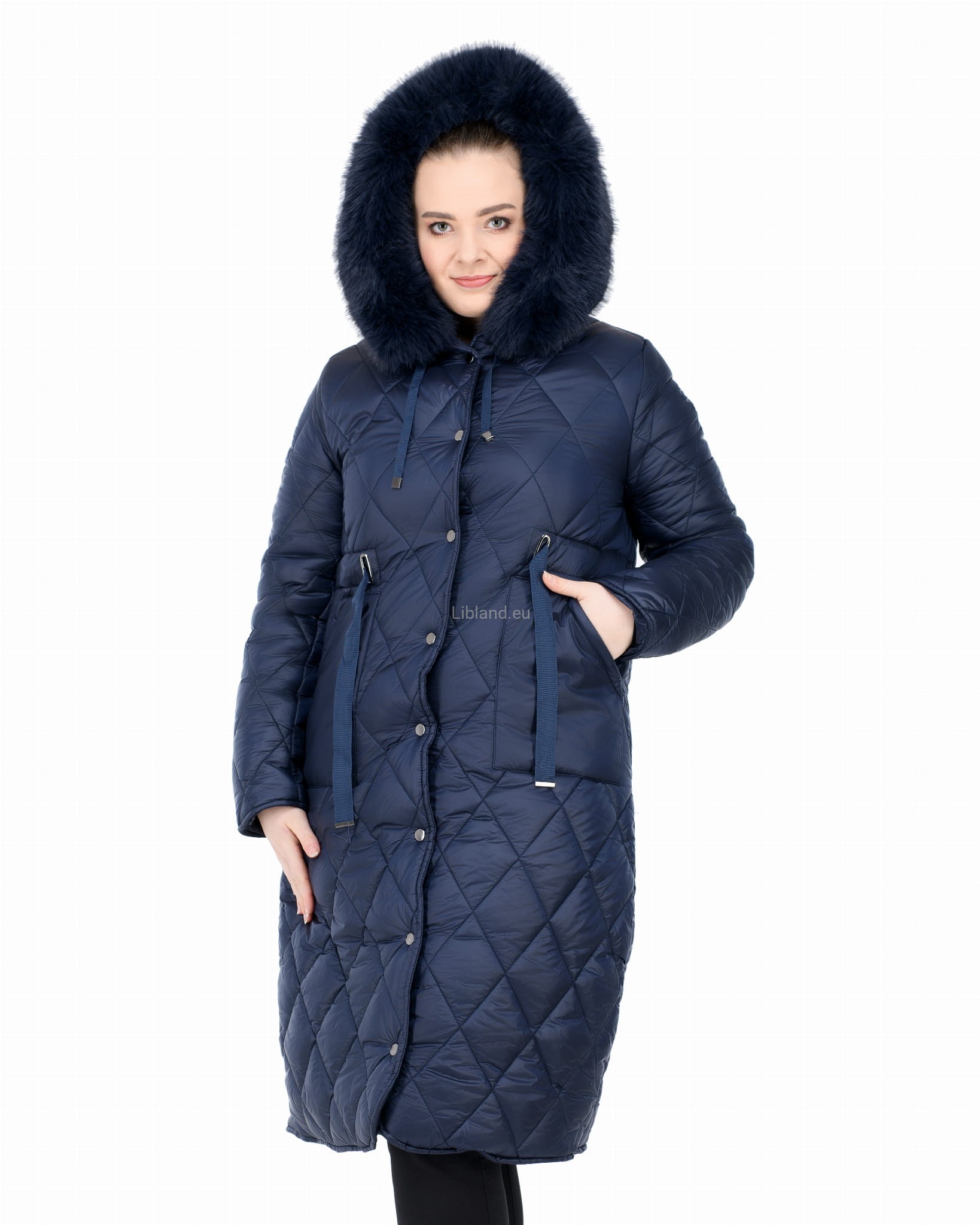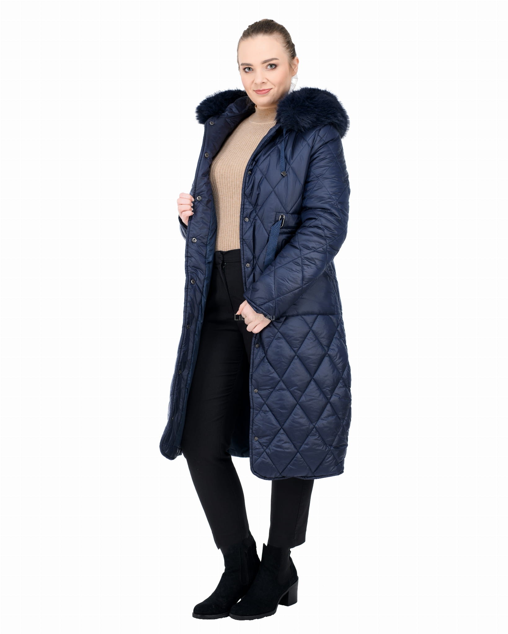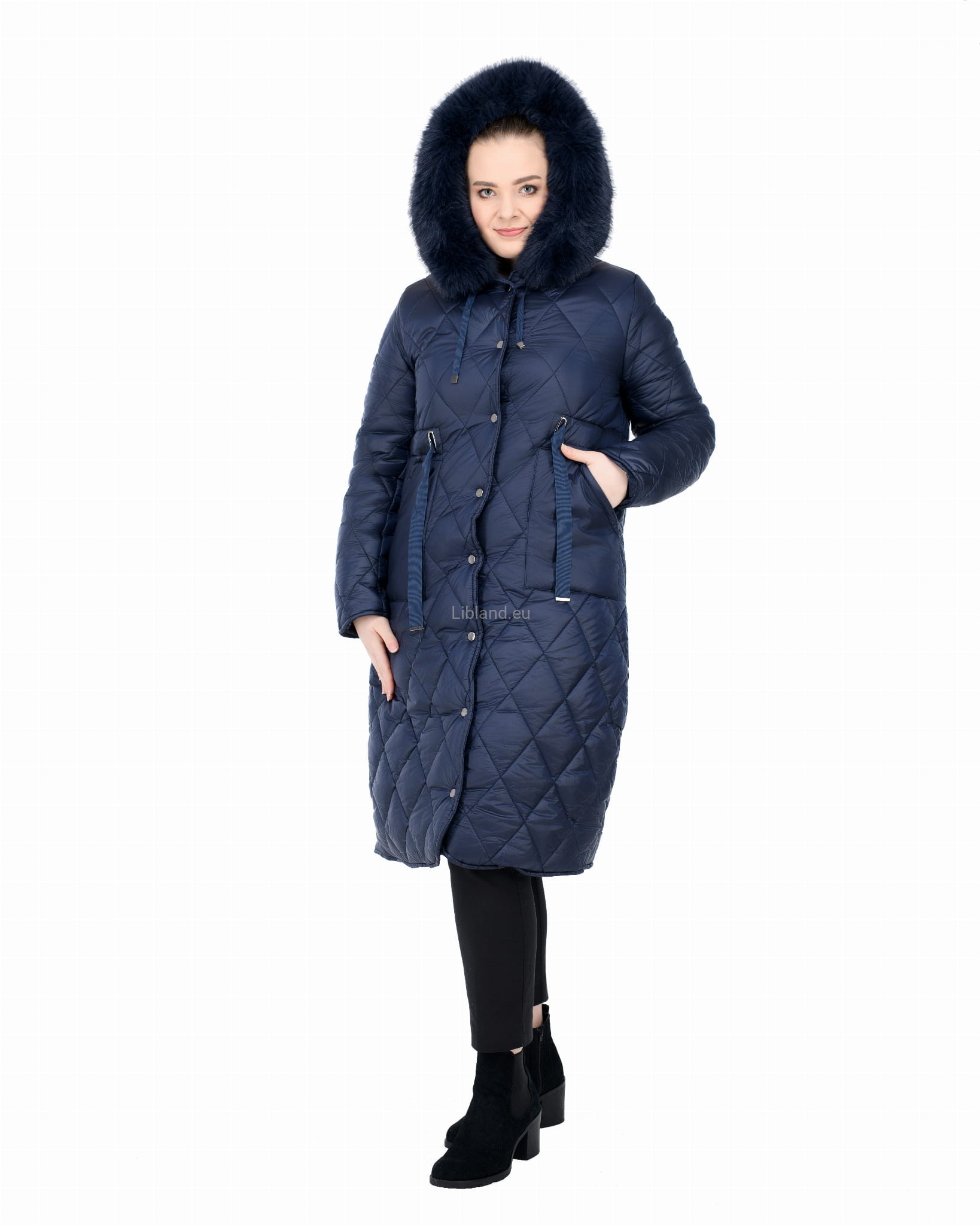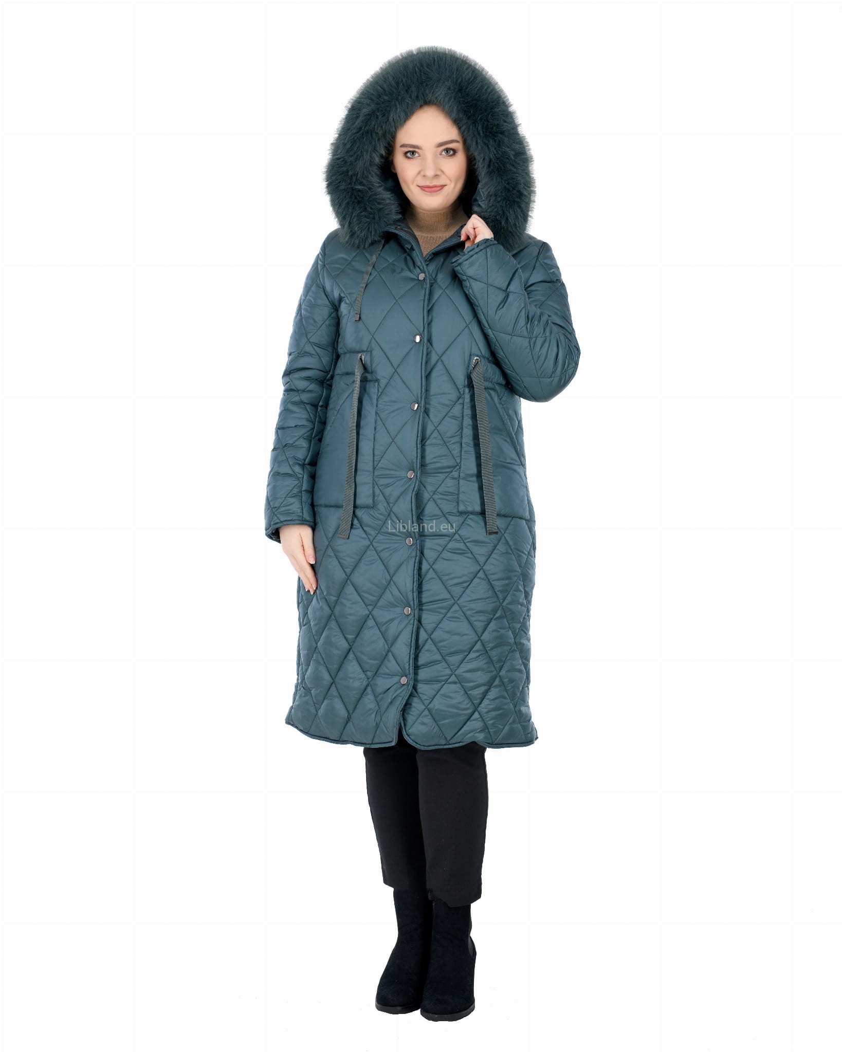 Ocieplany damski płaszcz zimowy z kapturem obszytym futrem i krytym paskiem w talii.