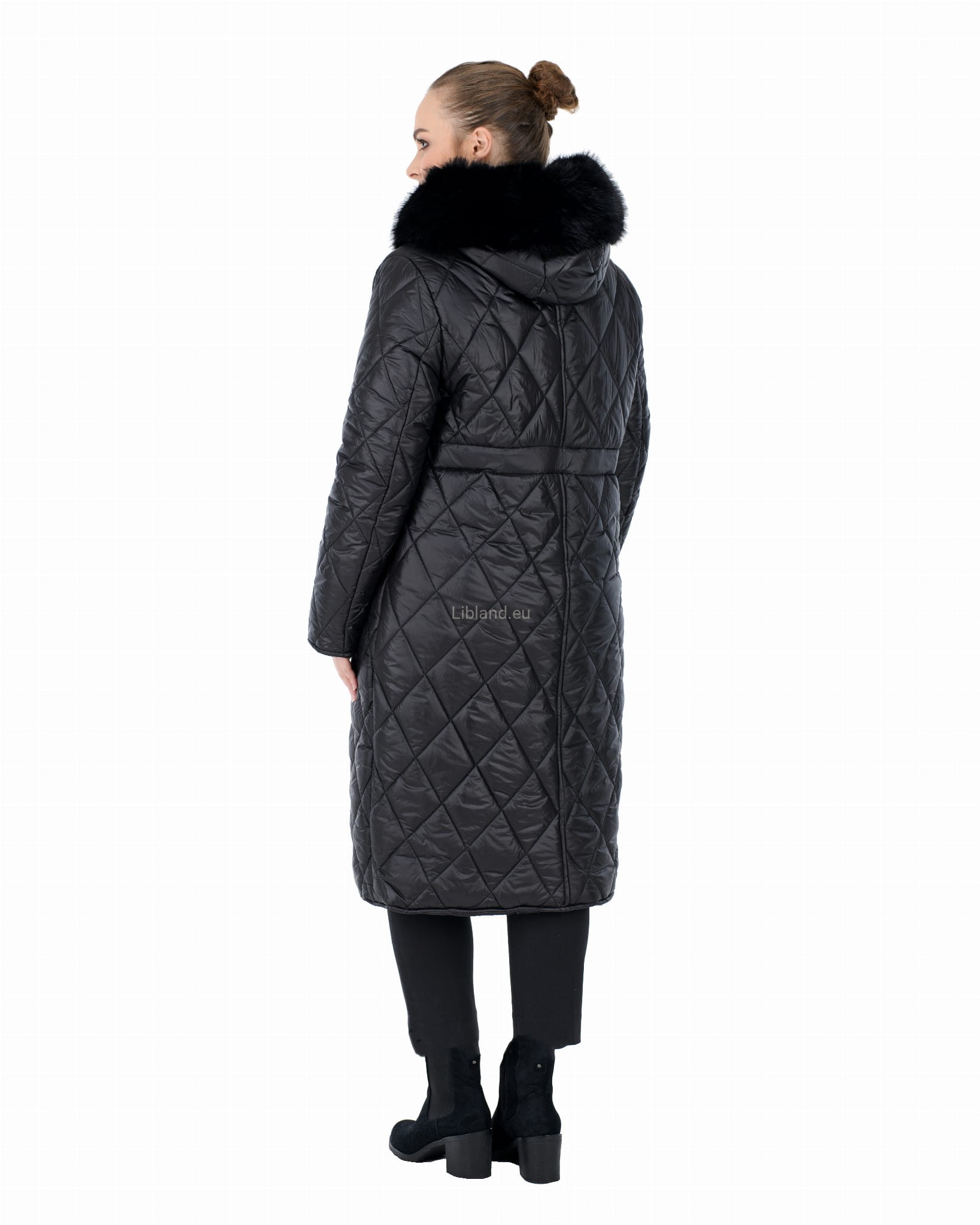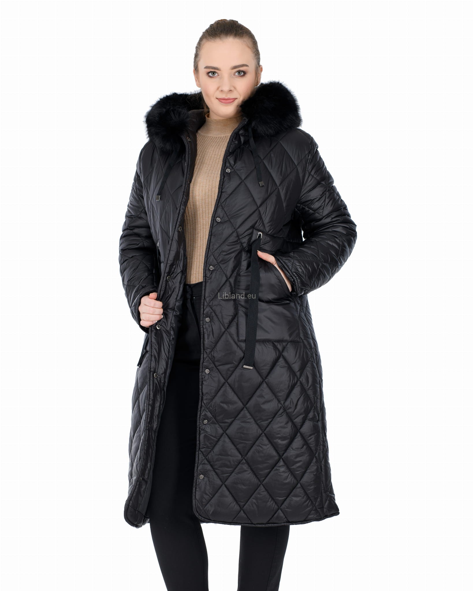 Ocieplany płaszcz zimowy z kapturem obszytym futrem i krytym paskiem w talii.