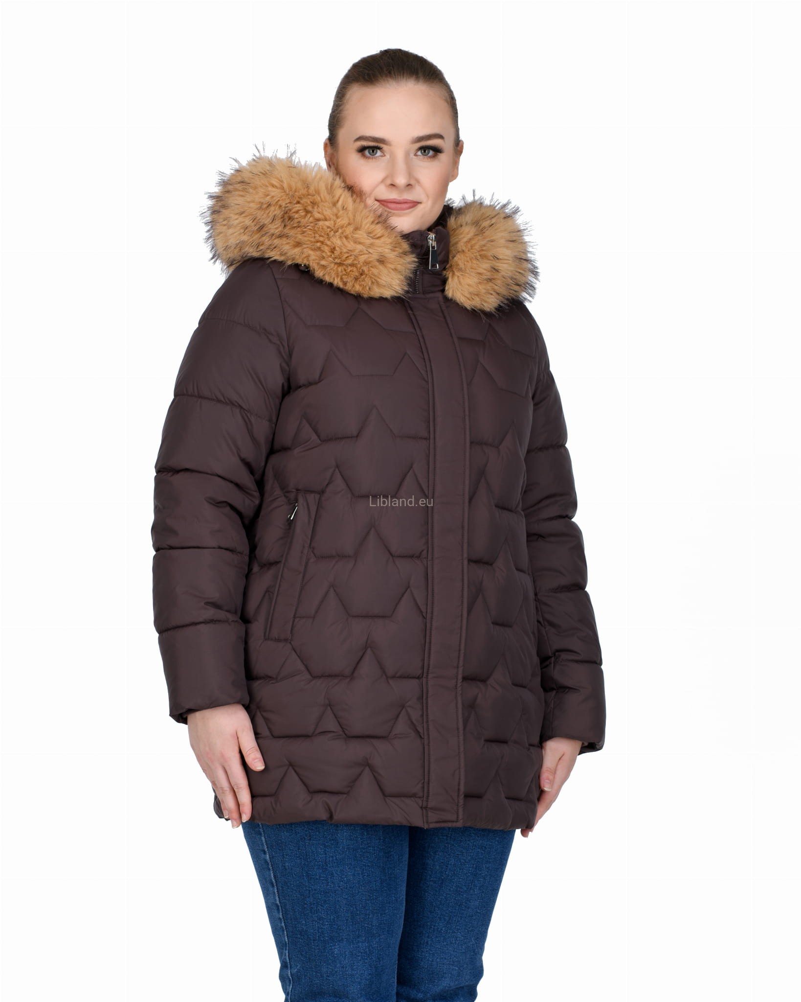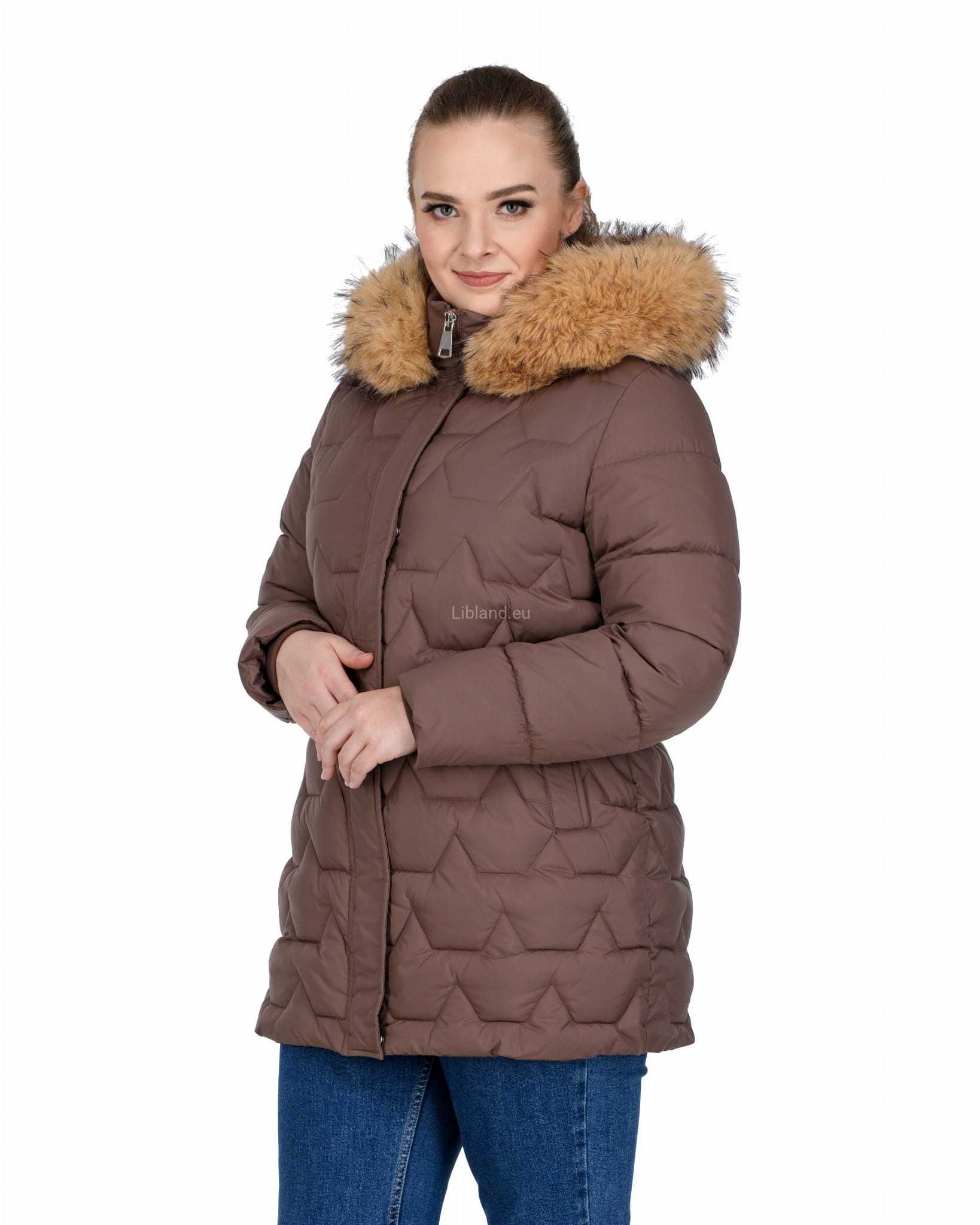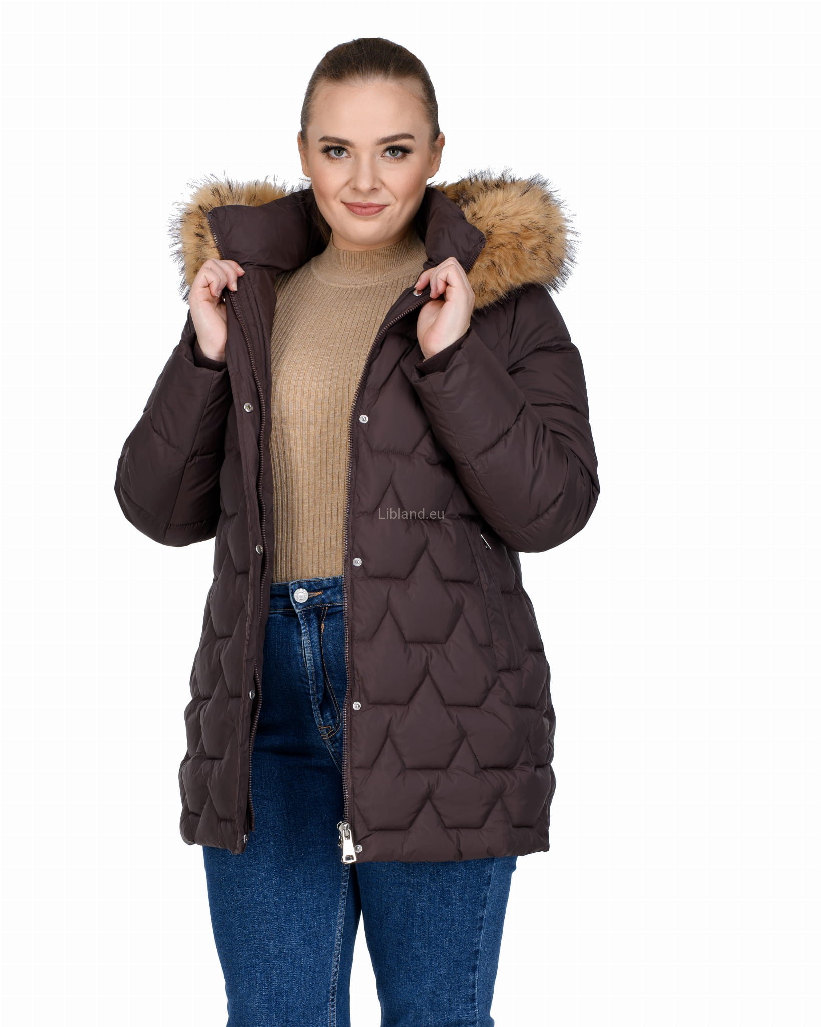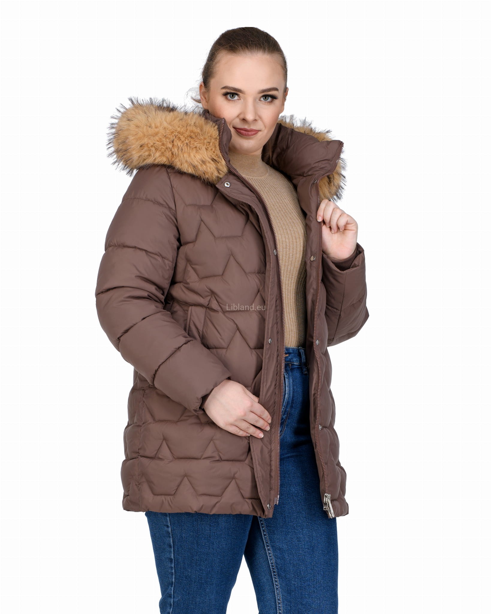 Długa, pikowana kurtka zimowa dwustronnie rozsuwana z futrem na kapturze.