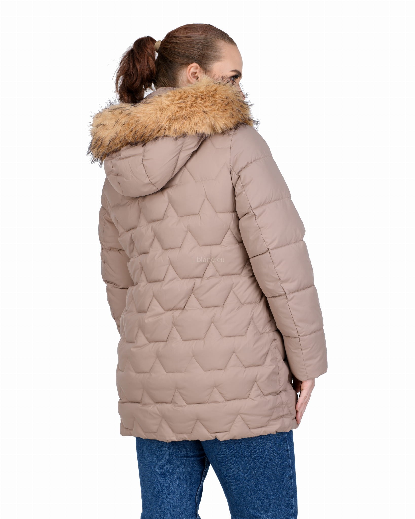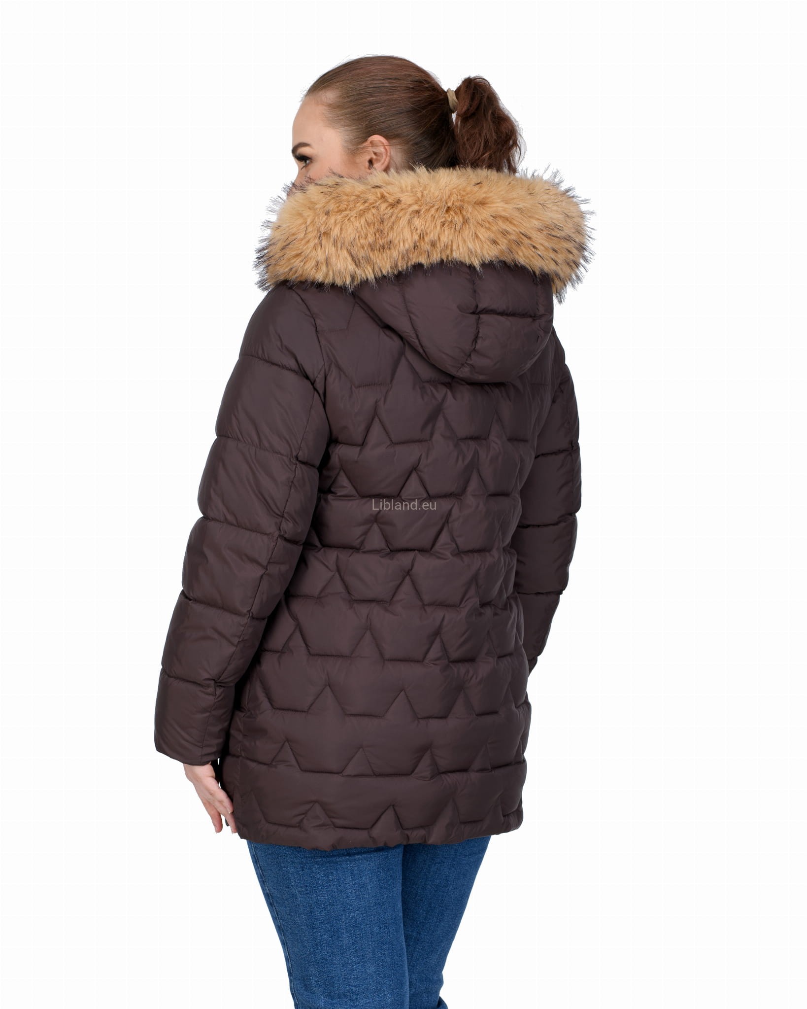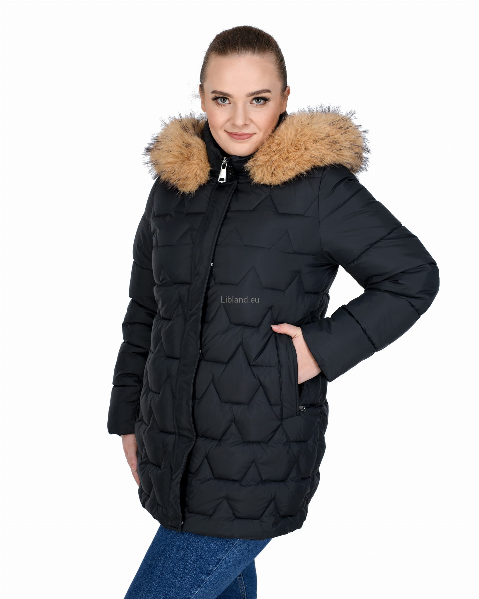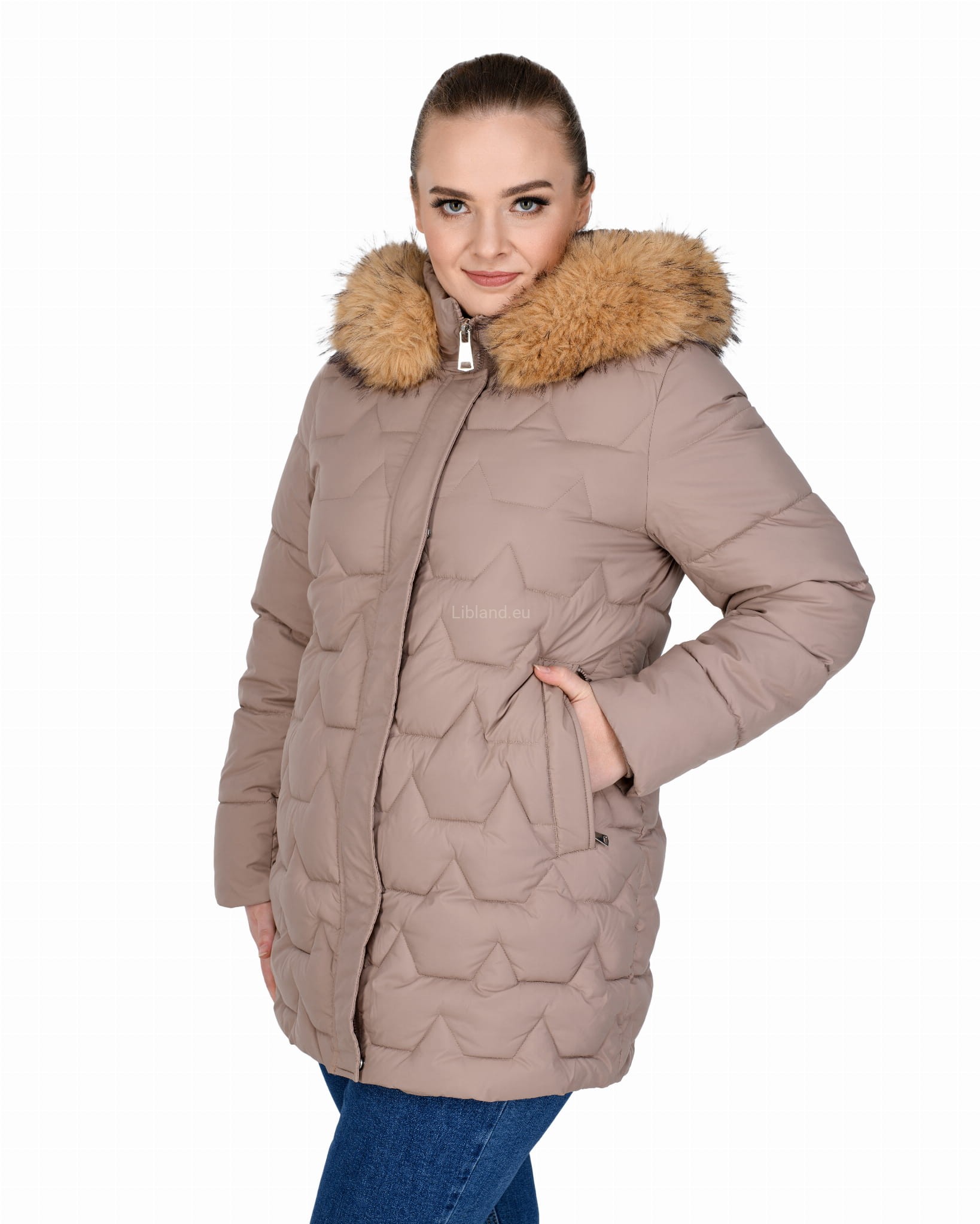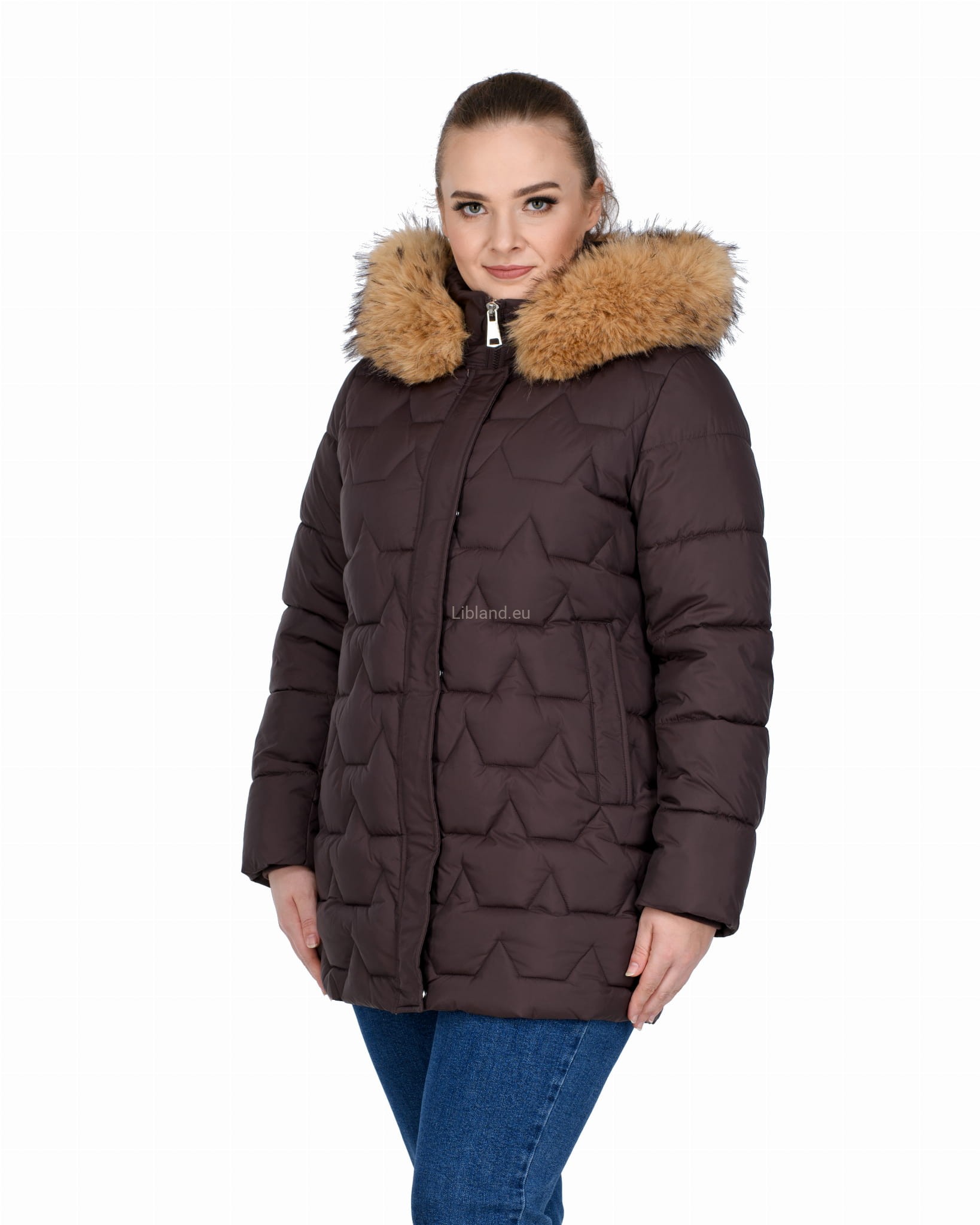 Długa, pikowana kurtka zimowa dwustronnie rozsuwana z futrem na kapturze.