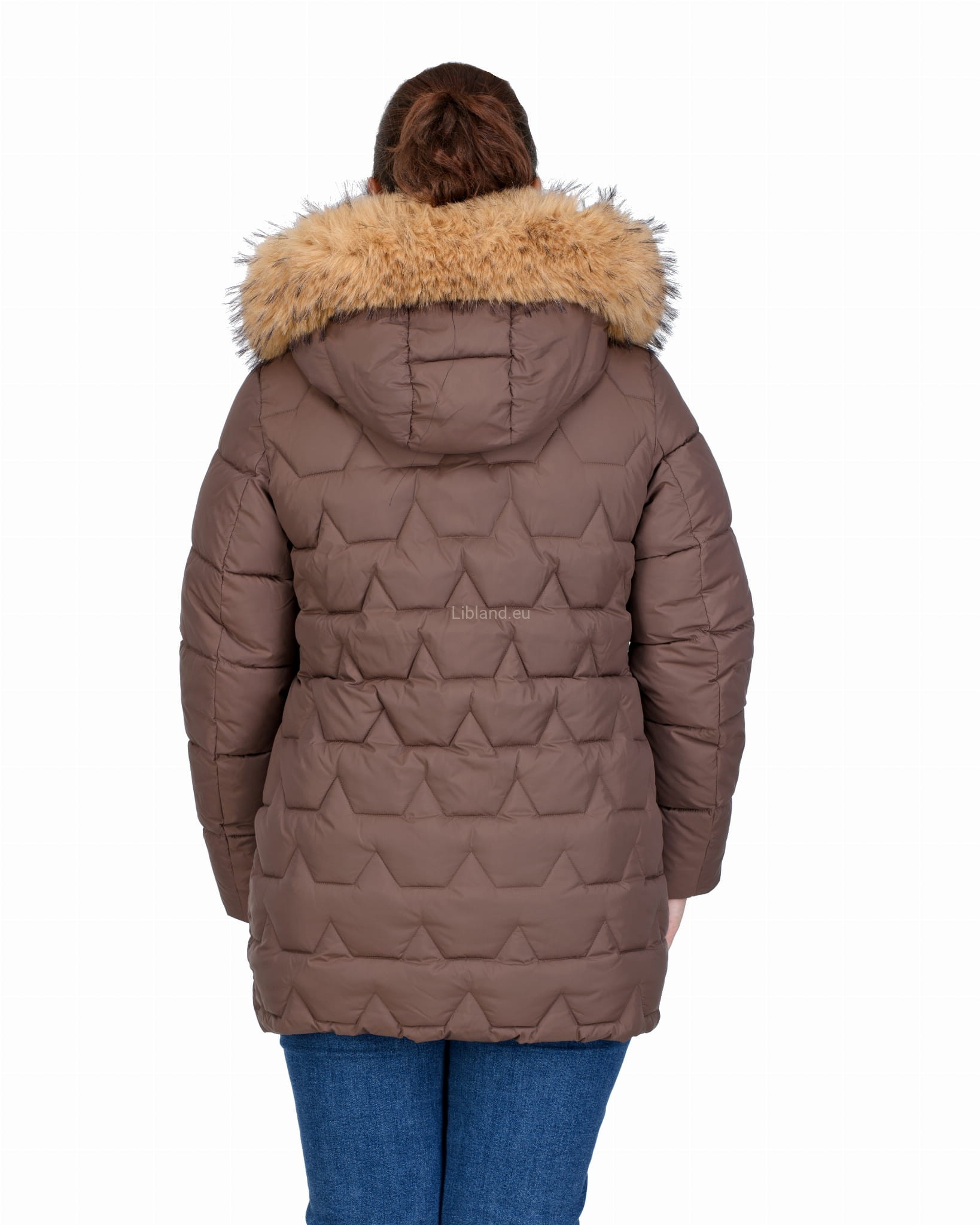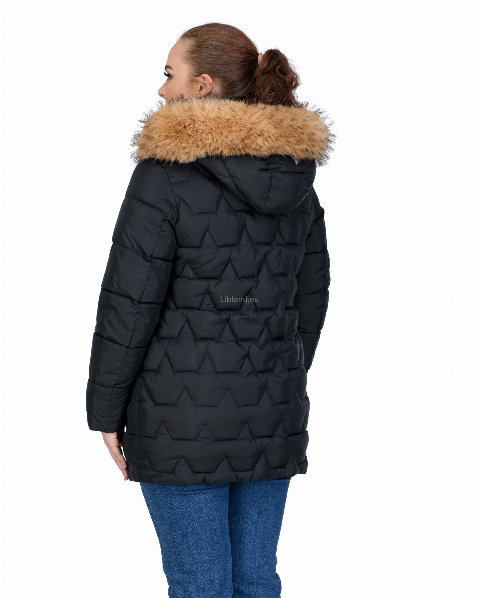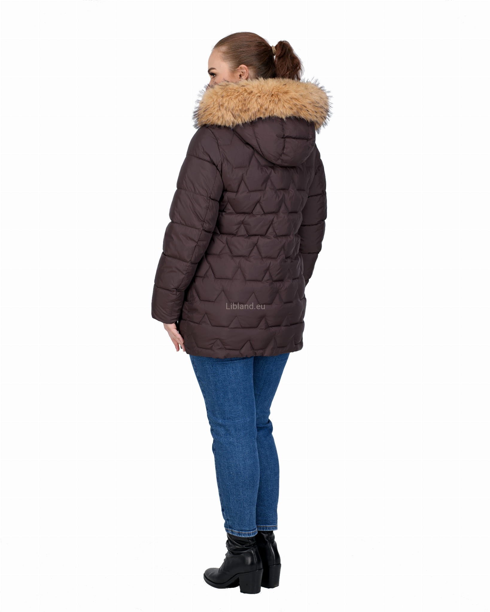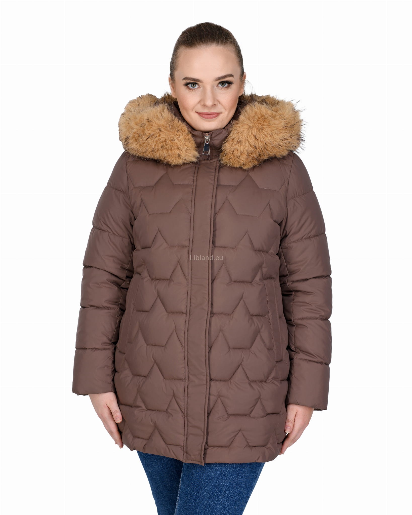 Długa, pikowana kurtka zimowa dwustronnie rozsuwana z futrem na kapturze.