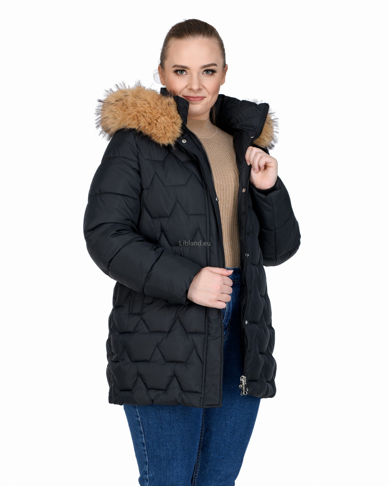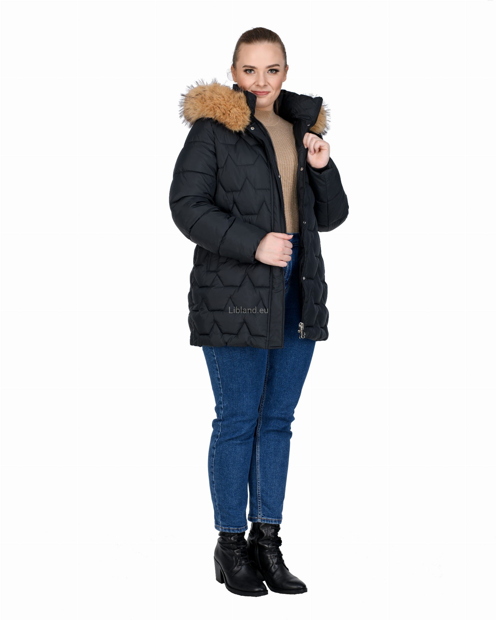 Długa, pikowana kurtka zimowa dwustronnie rozsuwana z futrem na kapturze.