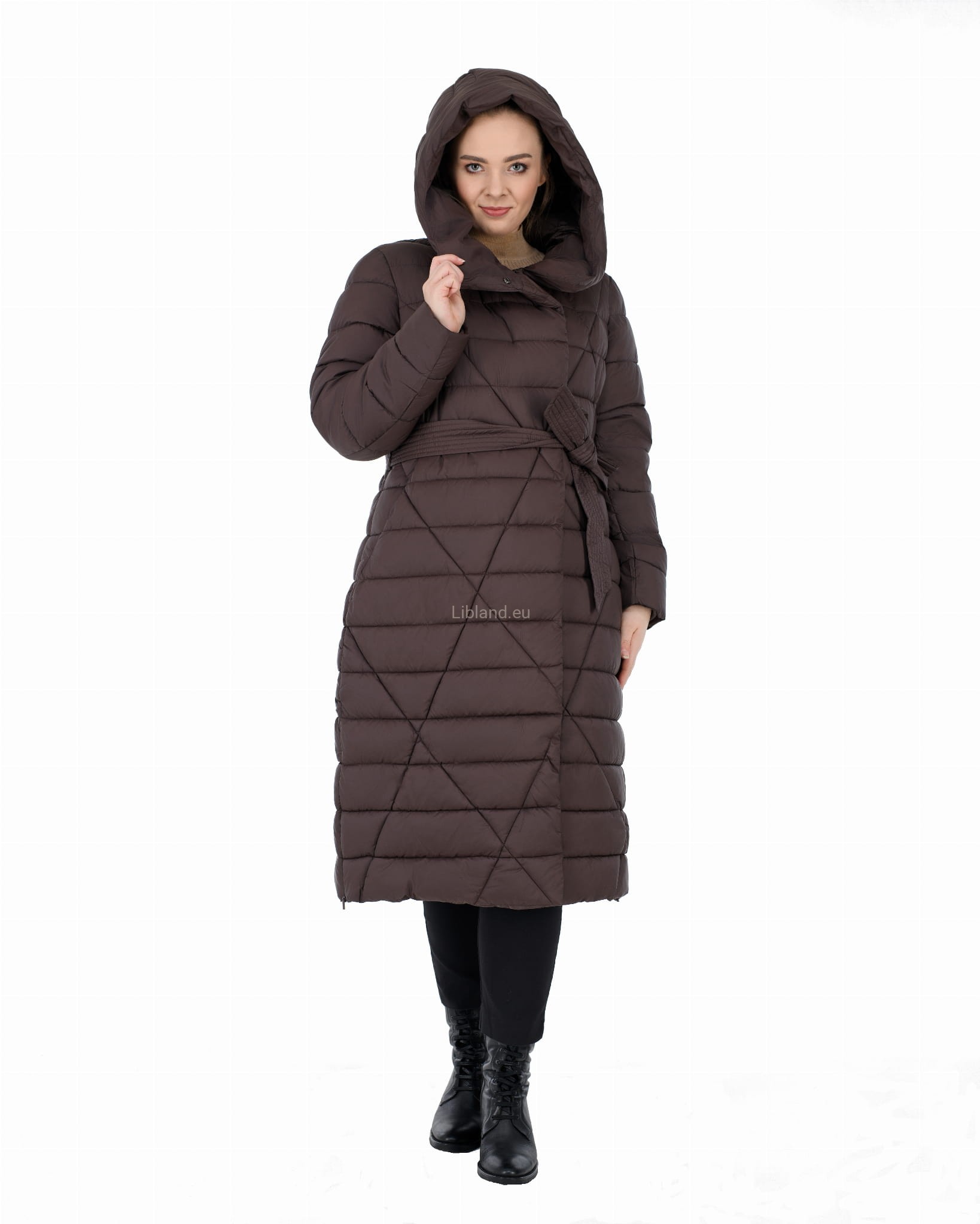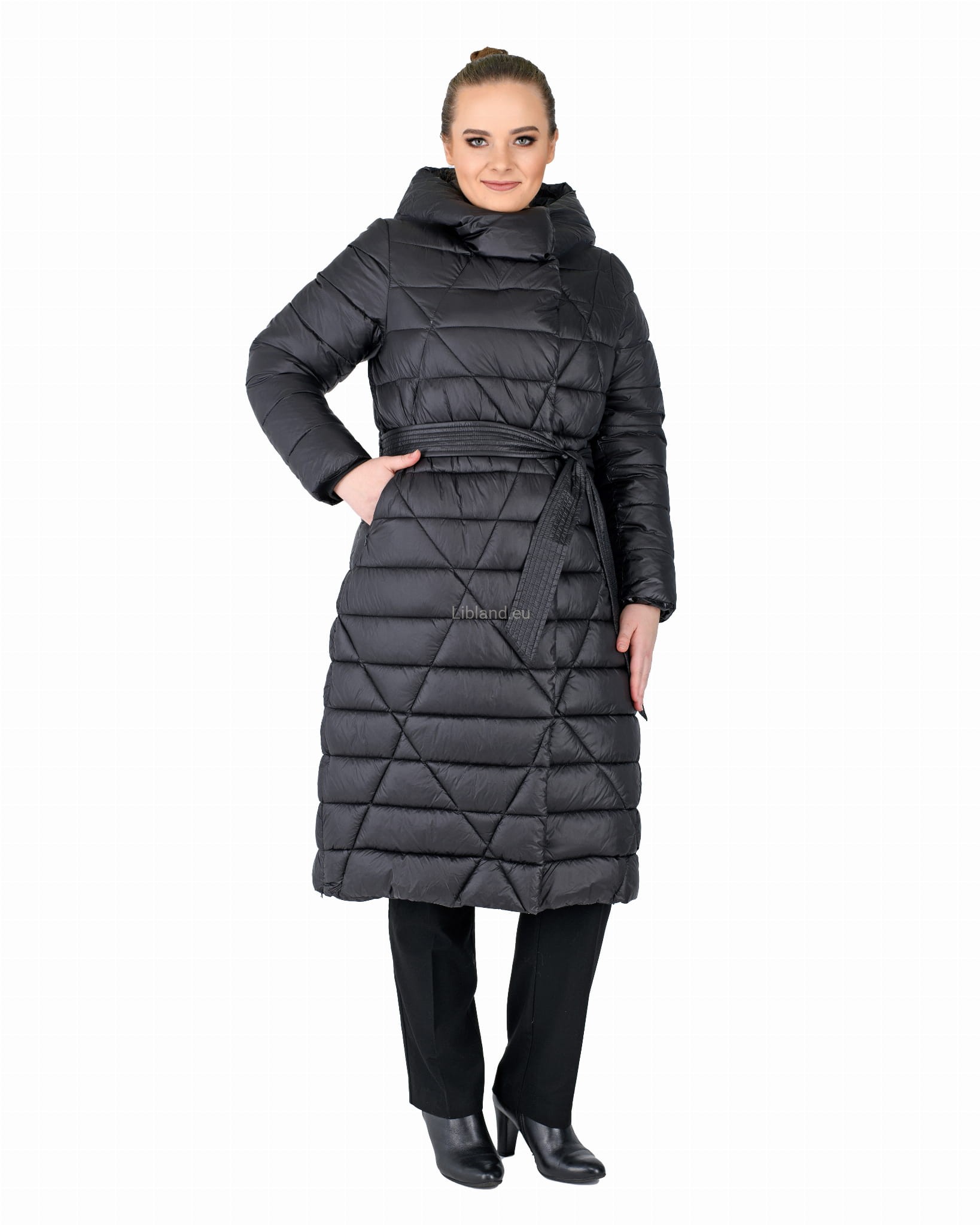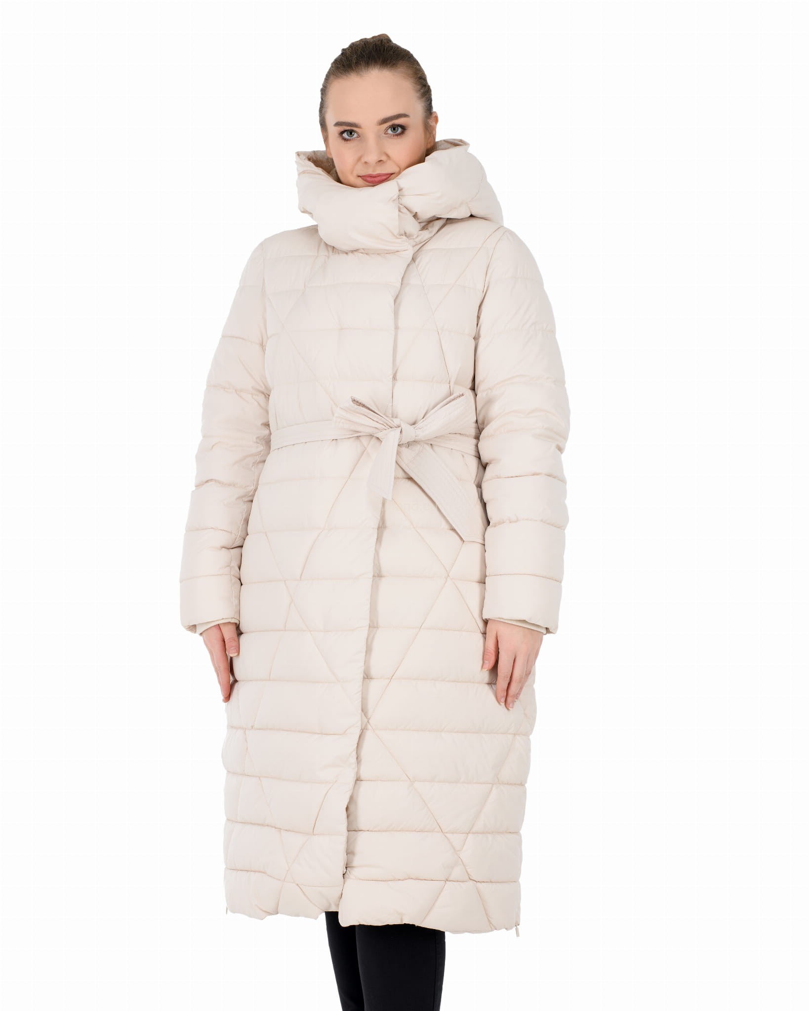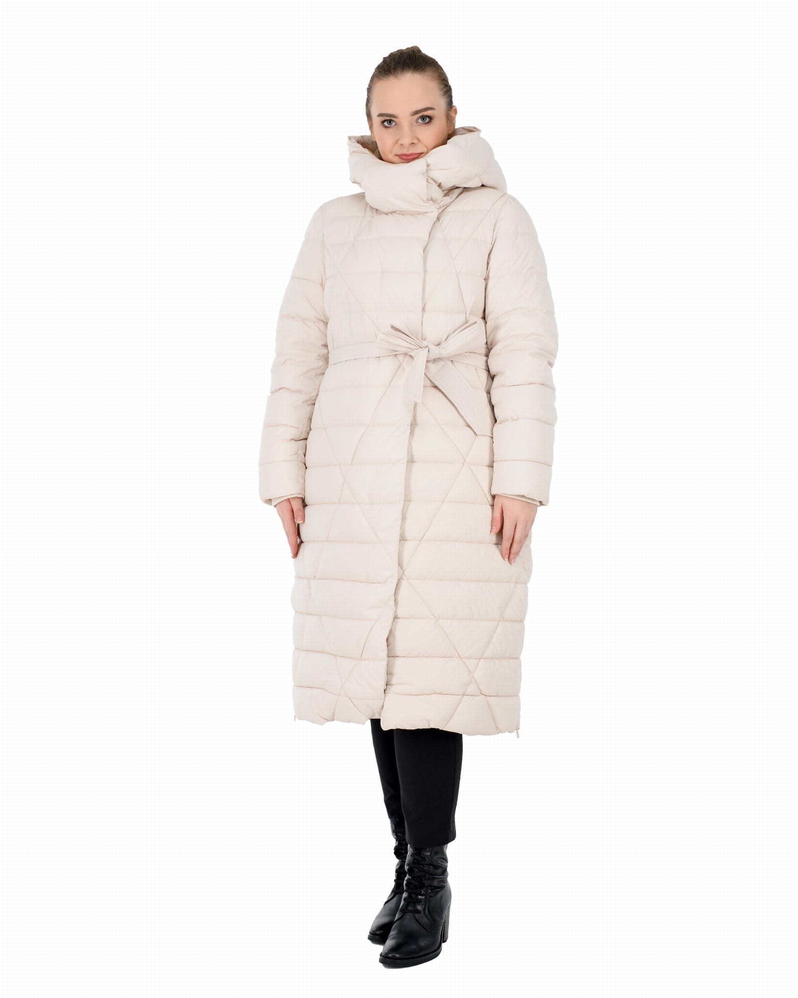 Pikowany w kratę płaszcz zimowy z wykładanym kołnierzem, który można upiąć w komin: