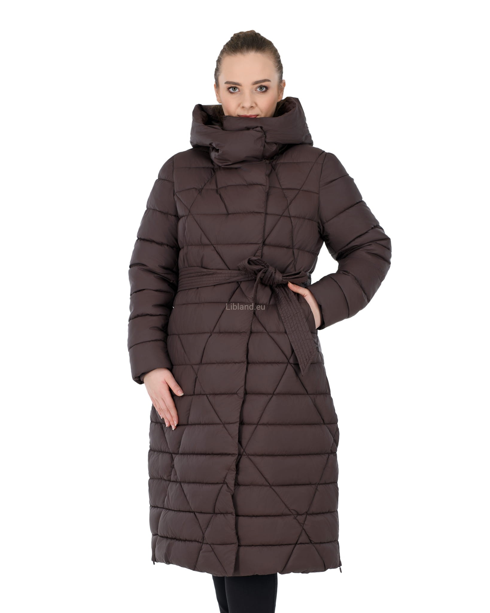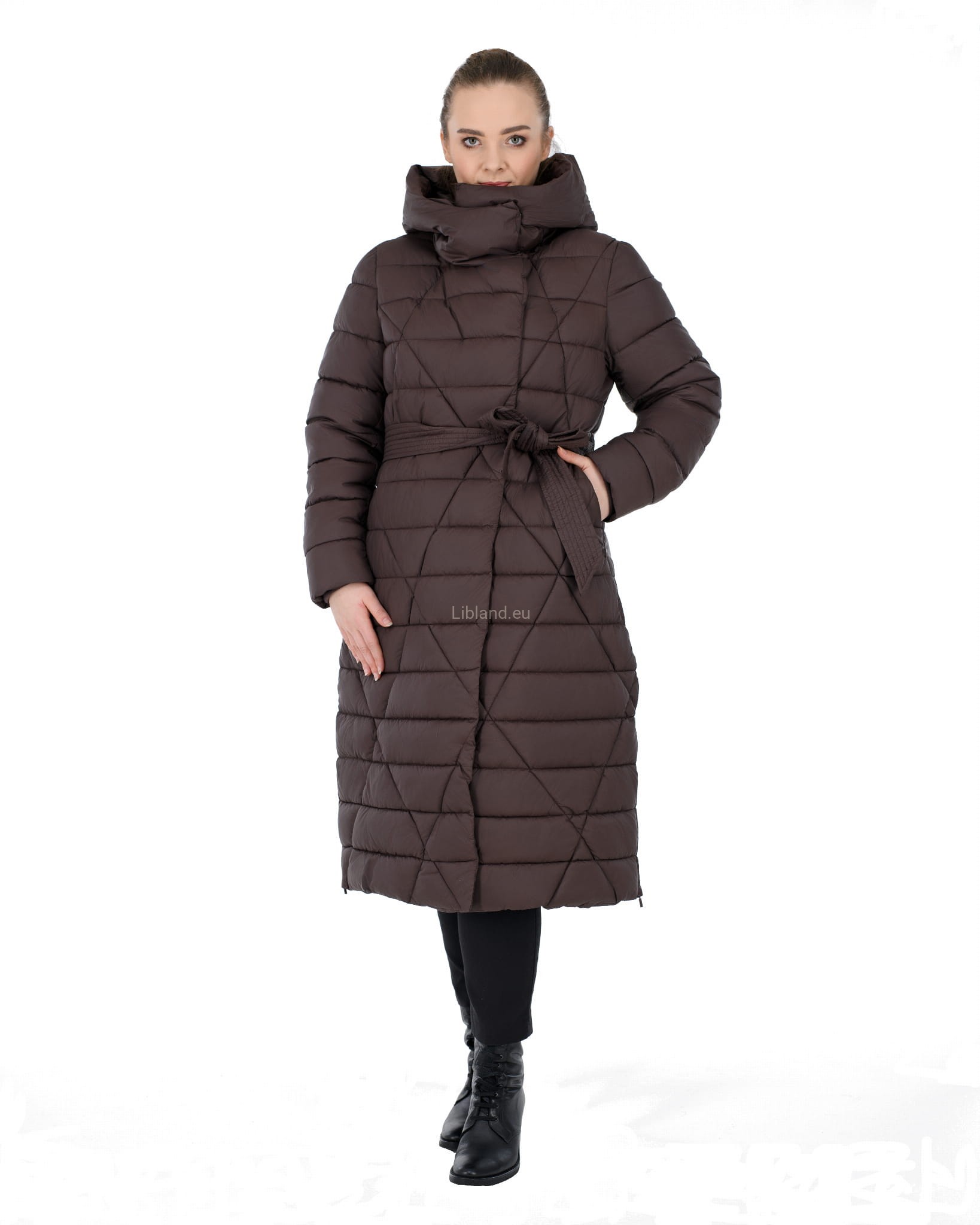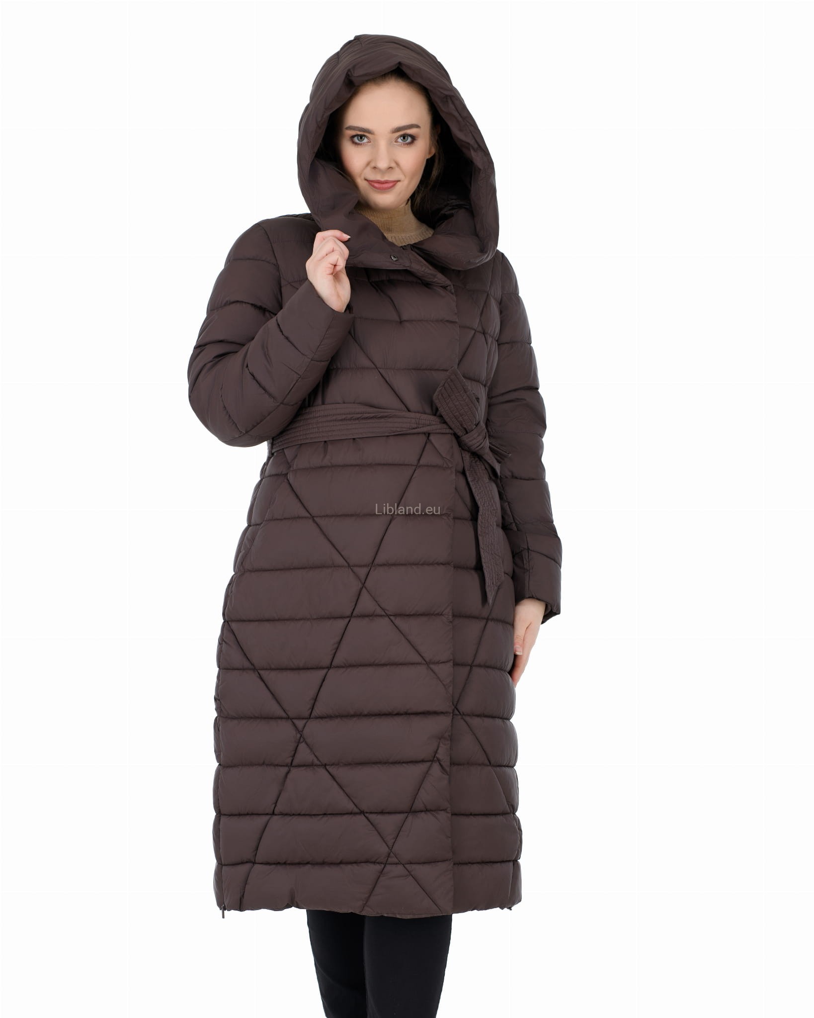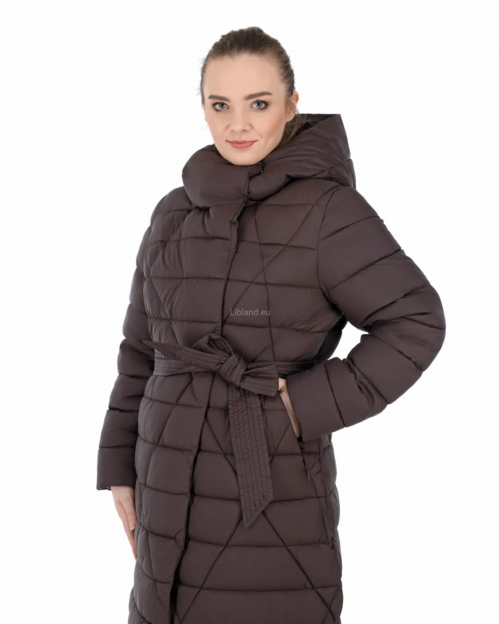 Pikowany w kratę płaszcz zimowy z wykładanym kołnierzem, który można upiąć w komin: