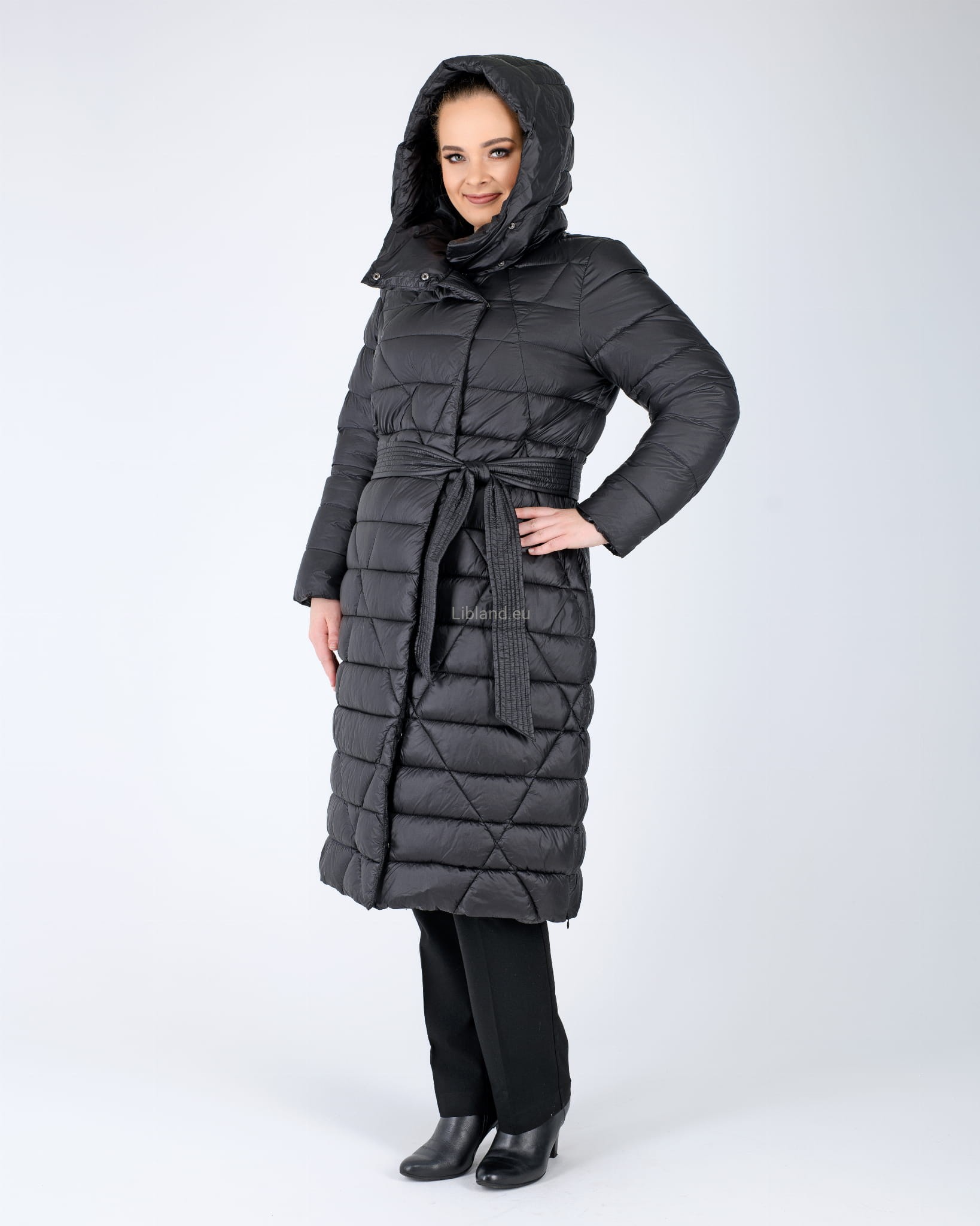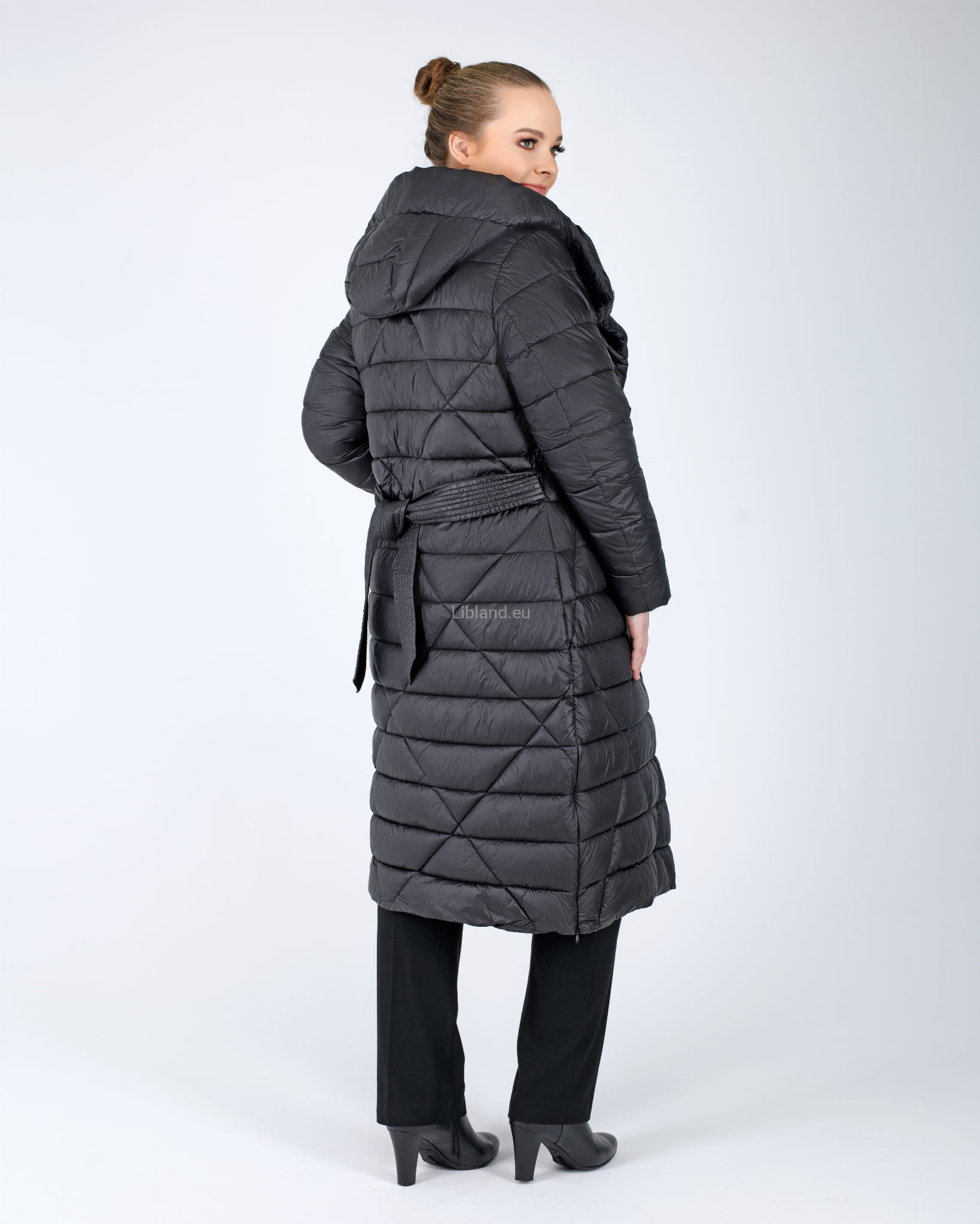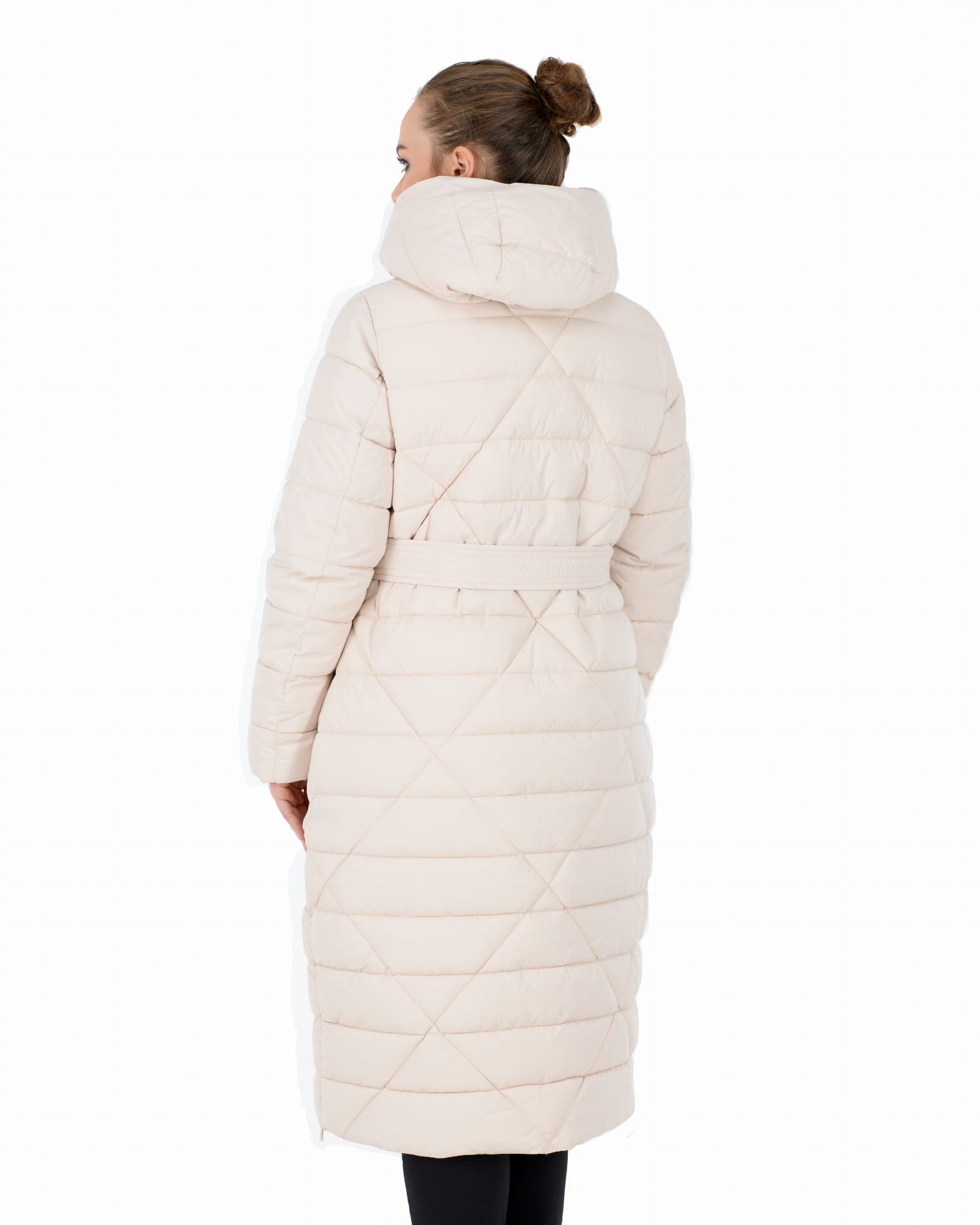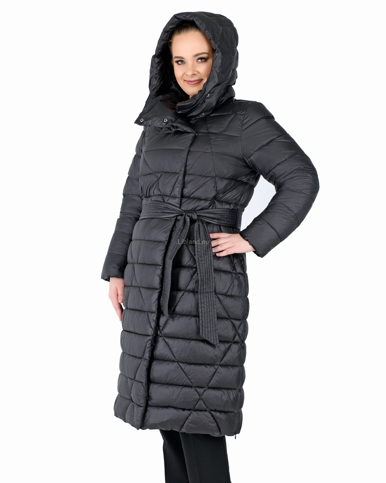 Pikowany w kratę płaszcz zimowy z wykładanym kołnierzem, który można upiąć w komin:
